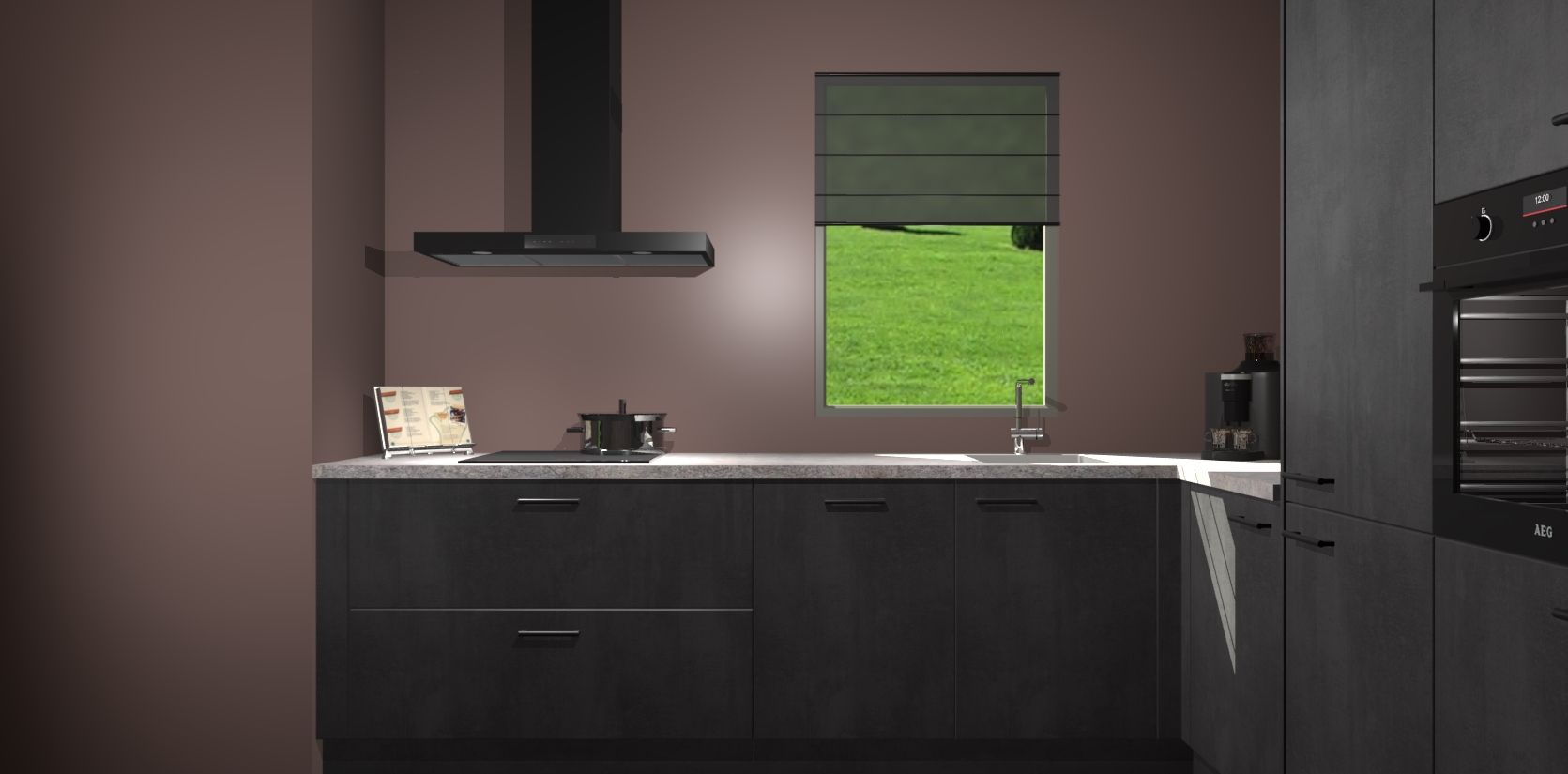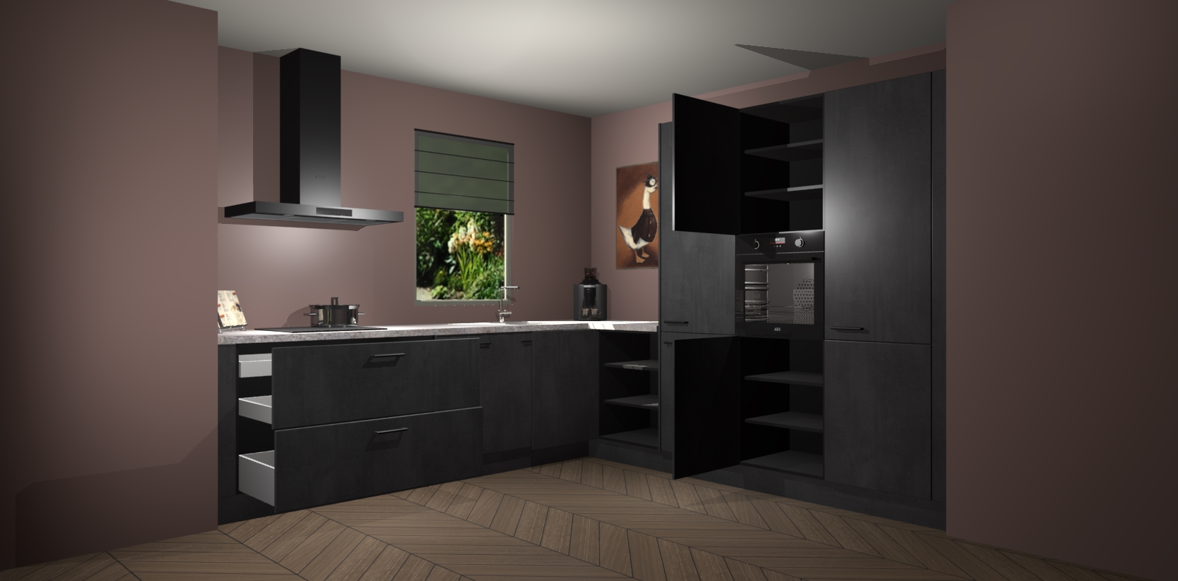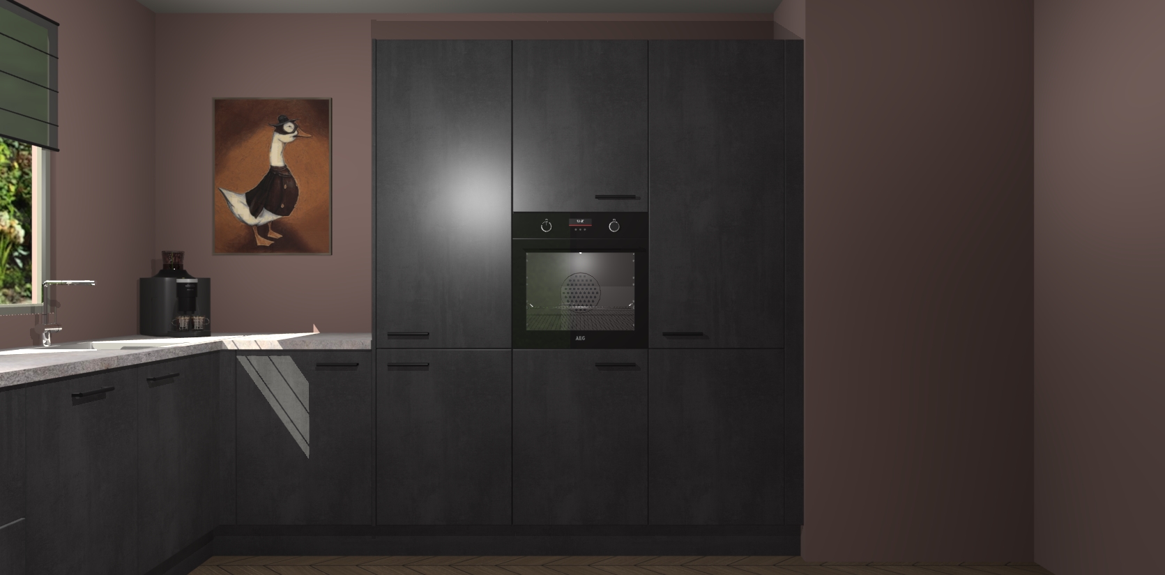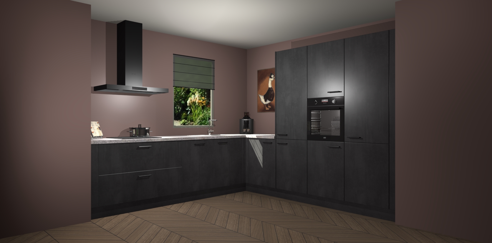 Welkom bij de Beton Zwarte keuken Laos. Deze prachtige keuken zal de komende jaren het middelpunt van de belangstelling in uw huis zijn. Uitgerust met vijf inbouwapparaten komt u nooit kookgereedschap tekort. Bovendien geeft de warme houtlook elke ruimte een uitnodigende en tijdloze uitstraling.