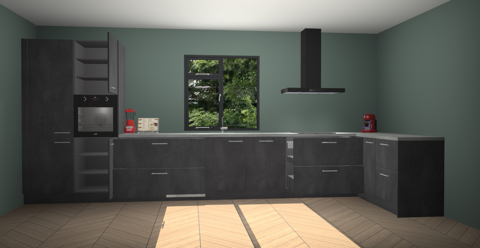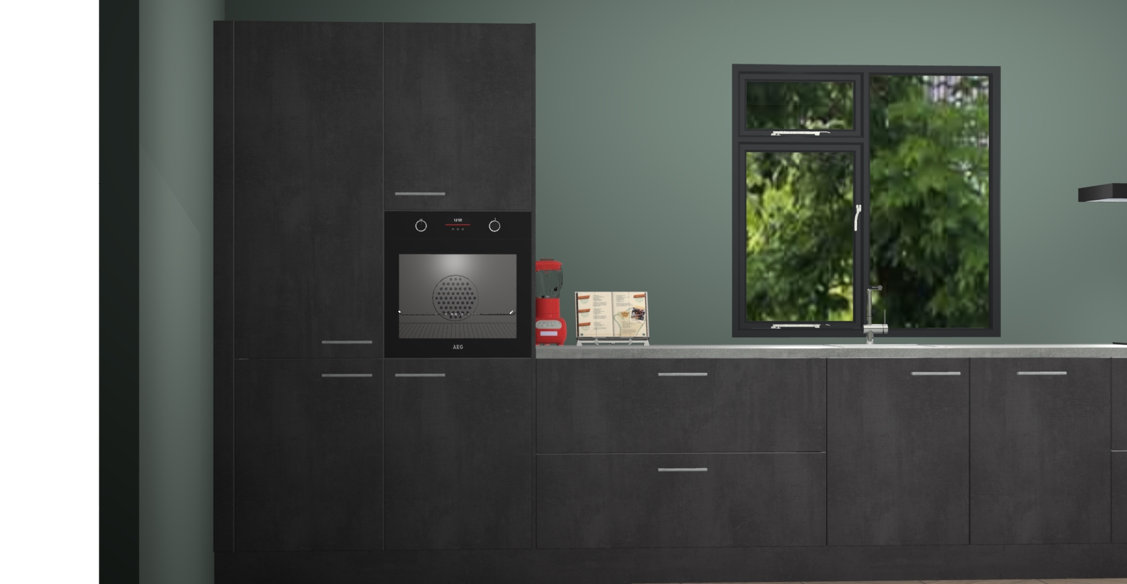 De Beton zwarte keuken Lille wordt geleverd met vijf inbouwapparaten - een oven, inductiekookplaat, afzuigkap, vaatwasser en koelkast. Maar dat is nog niet alles! Na bestelling kunnen deze apparaten eenvoudig worden geüpgraded naar premium AEG-apparatuur. Bovendien is er zelfs de optie om de oven te vervangen door een combimagnetron of uw inductiekookplaat te vervangen door een kookplaat met geïntegreerde afzuiging.