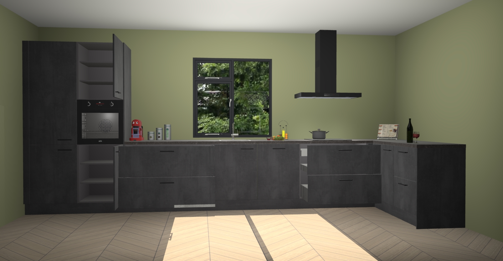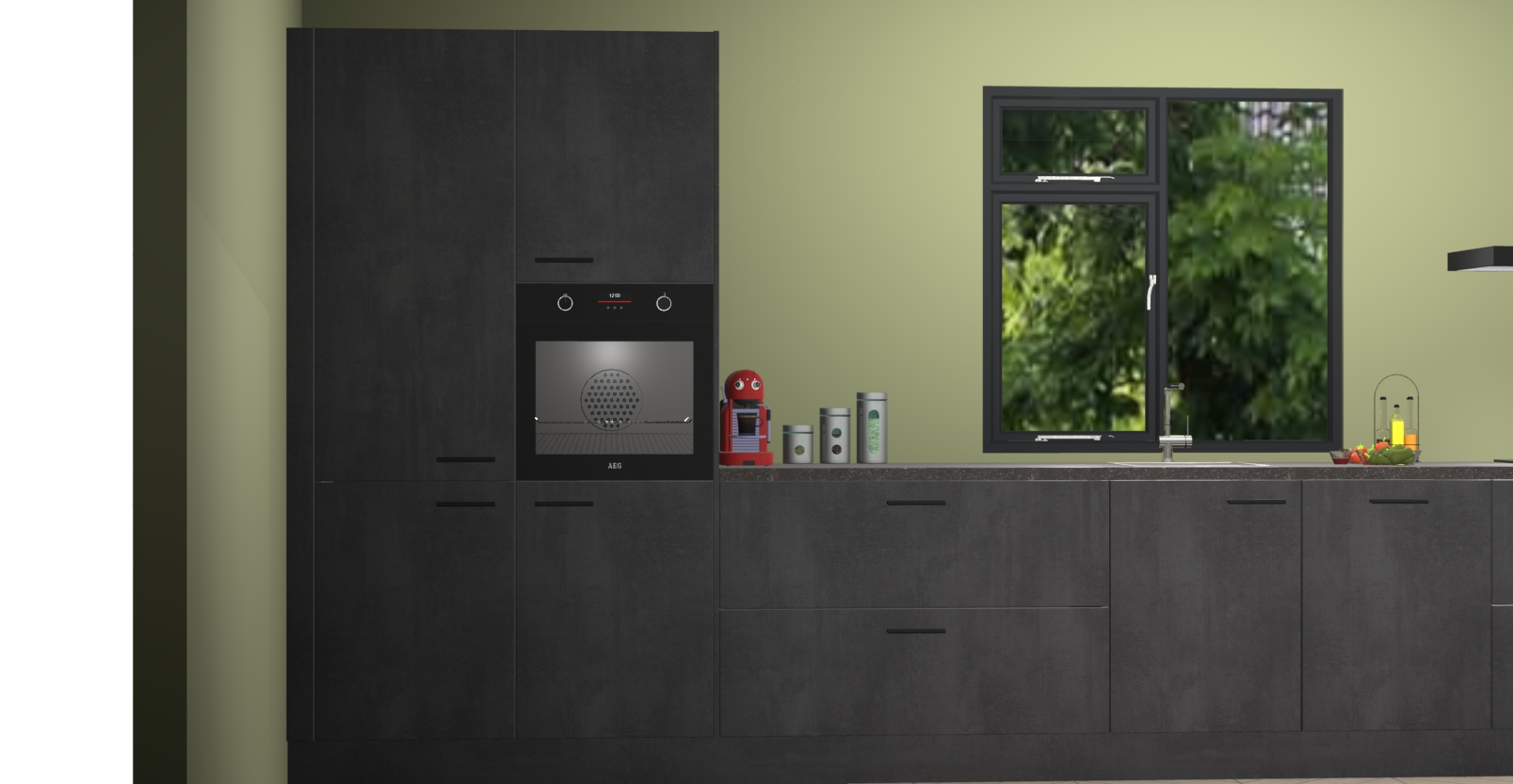 De Beton zwarte keuken Lille wordt geleverd met vijf inbouwapparaten - een oven, inductiekookplaat, afzuigkap, vaatwasser en koelkast. Maar dat is nog niet alles! Na bestelling kunnen deze apparaten eenvoudig worden geüpgraded naar premium AEG-apparatuur. Bovendien is er zelfs de optie om de oven te vervangen door een combimagnetron of uw inductiekookplaat te vervangen door een kookplaat met geïntegreerde afzuiging.