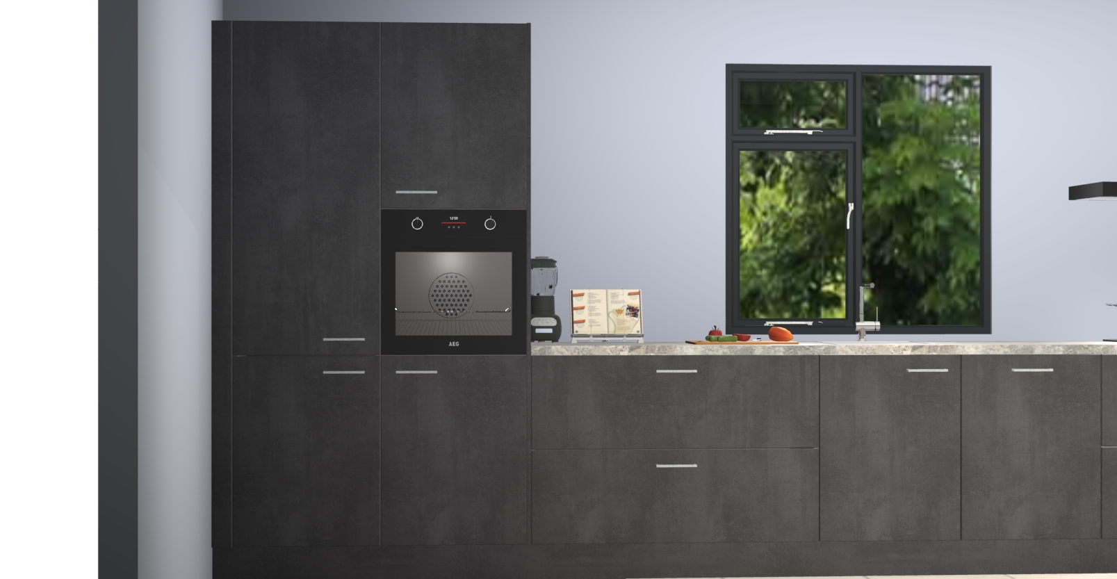 De Beton zwarte keuken Lille wordt geleverd met vijf inbouwapparaten - een oven, inductiekookplaat, afzuigkap, vaatwasser en koelkast. Maar dat is nog niet alles! Na bestelling kunnen deze apparaten eenvoudig worden geüpgraded naar premium AEG-apparatuur. Bovendien is er zelfs de optie om de oven te vervangen door een combimagnetron of uw inductiekookplaat te vervangen door een kookplaat met geïntegreerde afzuiging.
