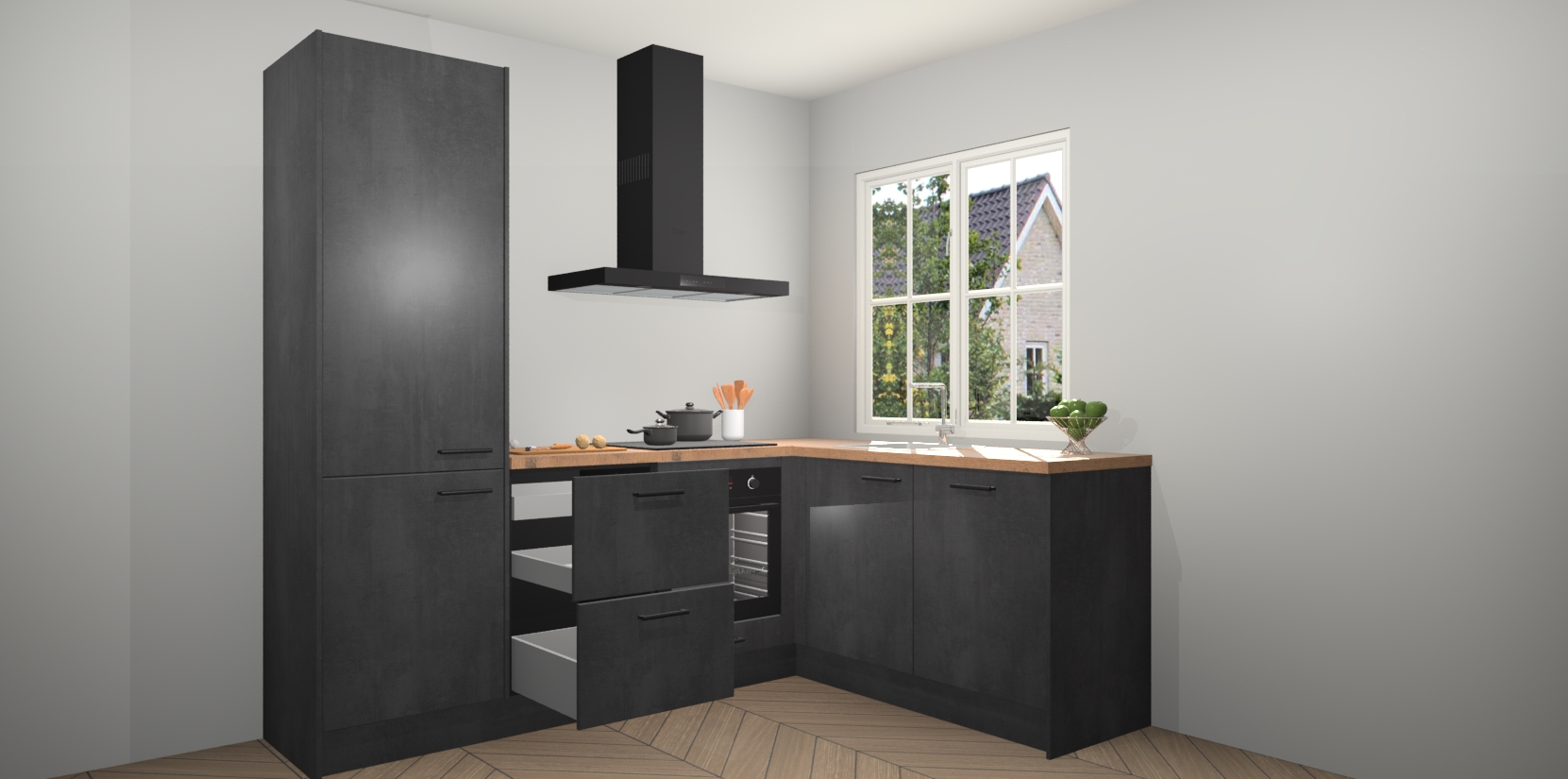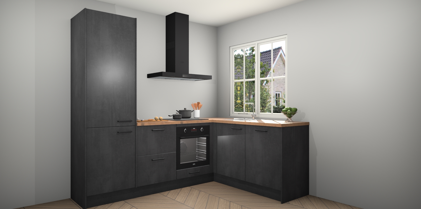 De Beton Zwarte keuken Linz is de perfecte keuze voor uw nieuwe moderne en tijdloze keuken. Ga voor moderne en tijdloze elegantie in uw keuken. De prachtige hoekkeuken biedt een verfrissende kijk op de manier waarop we ons vertrouwde keukenontwerp kunnen aanpassen in een nieuwe stijl. Één blik om alles te zien: zo mooi dat het bijna magisch lijkt.