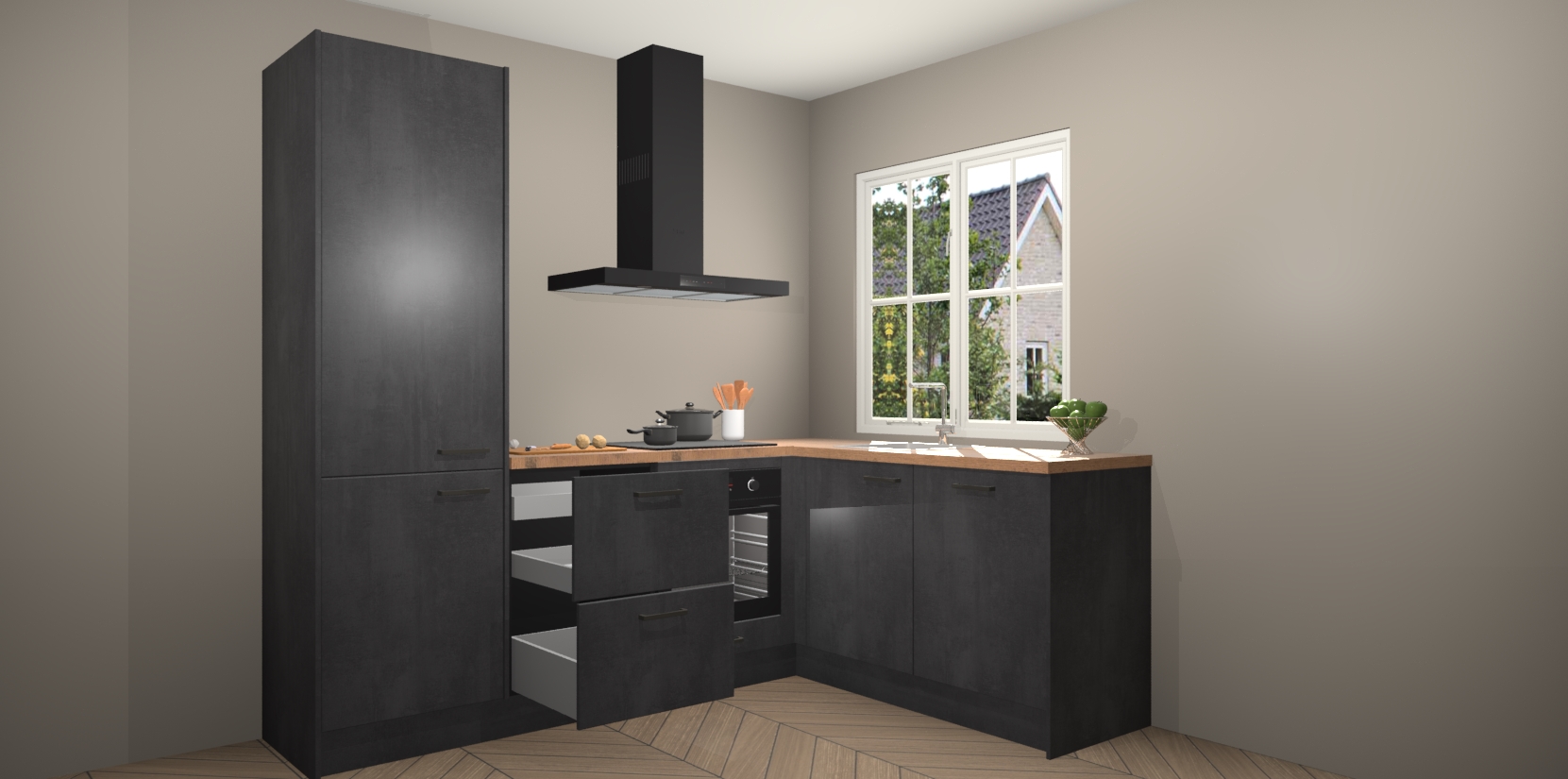 De Beton Zwarte keuken Linz is de perfecte keuze voor uw nieuwe moderne en tijdloze keuken. Ga voor moderne en tijdloze elegantie in uw keuken. De prachtige hoekkeuken biedt een verfrissende kijk op de manier waarop we ons vertrouwde keukenontwerp kunnen aanpassen in een nieuwe stijl. Één blik om alles te zien: zo mooi dat het bijna magisch lijkt.