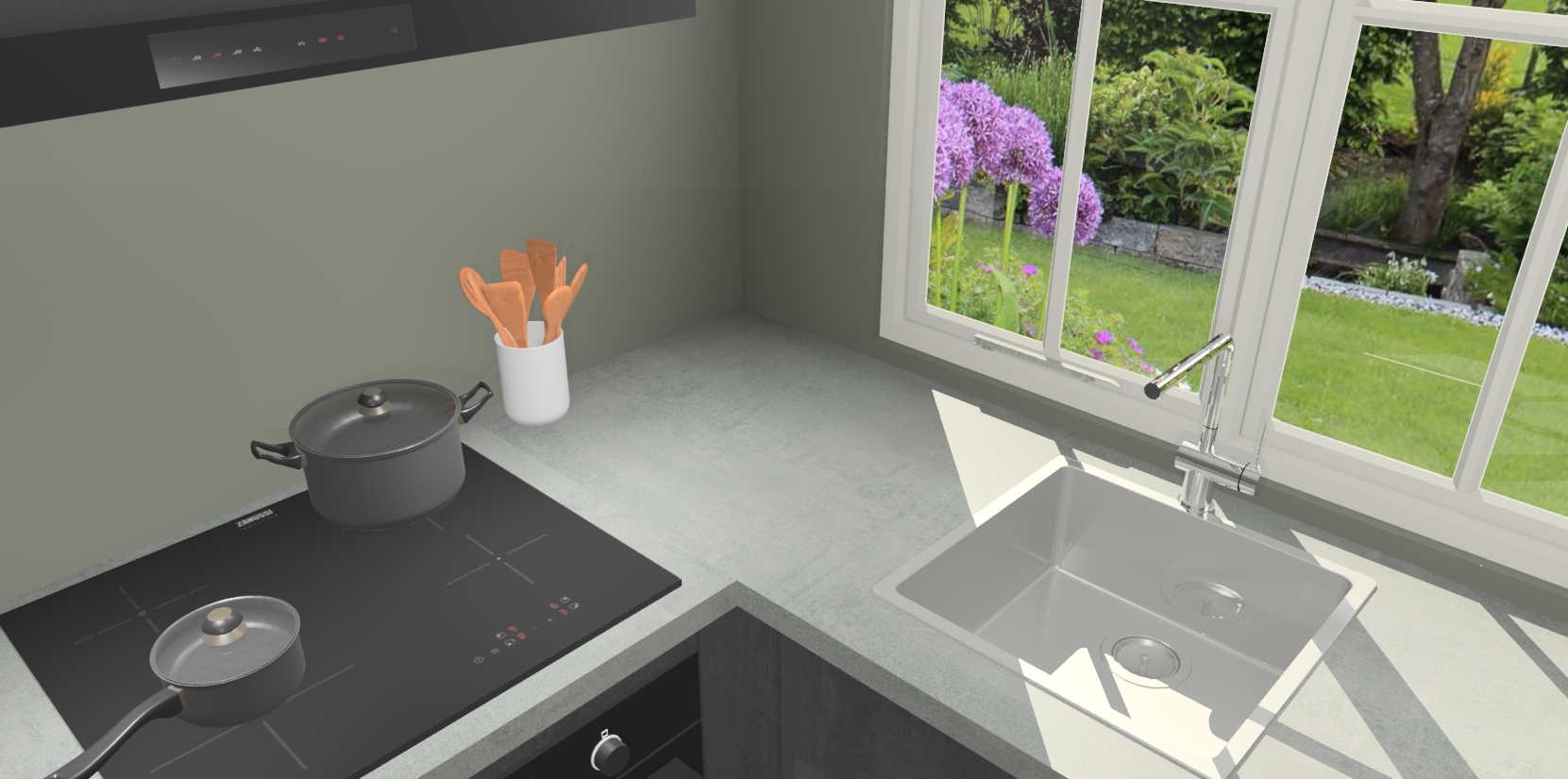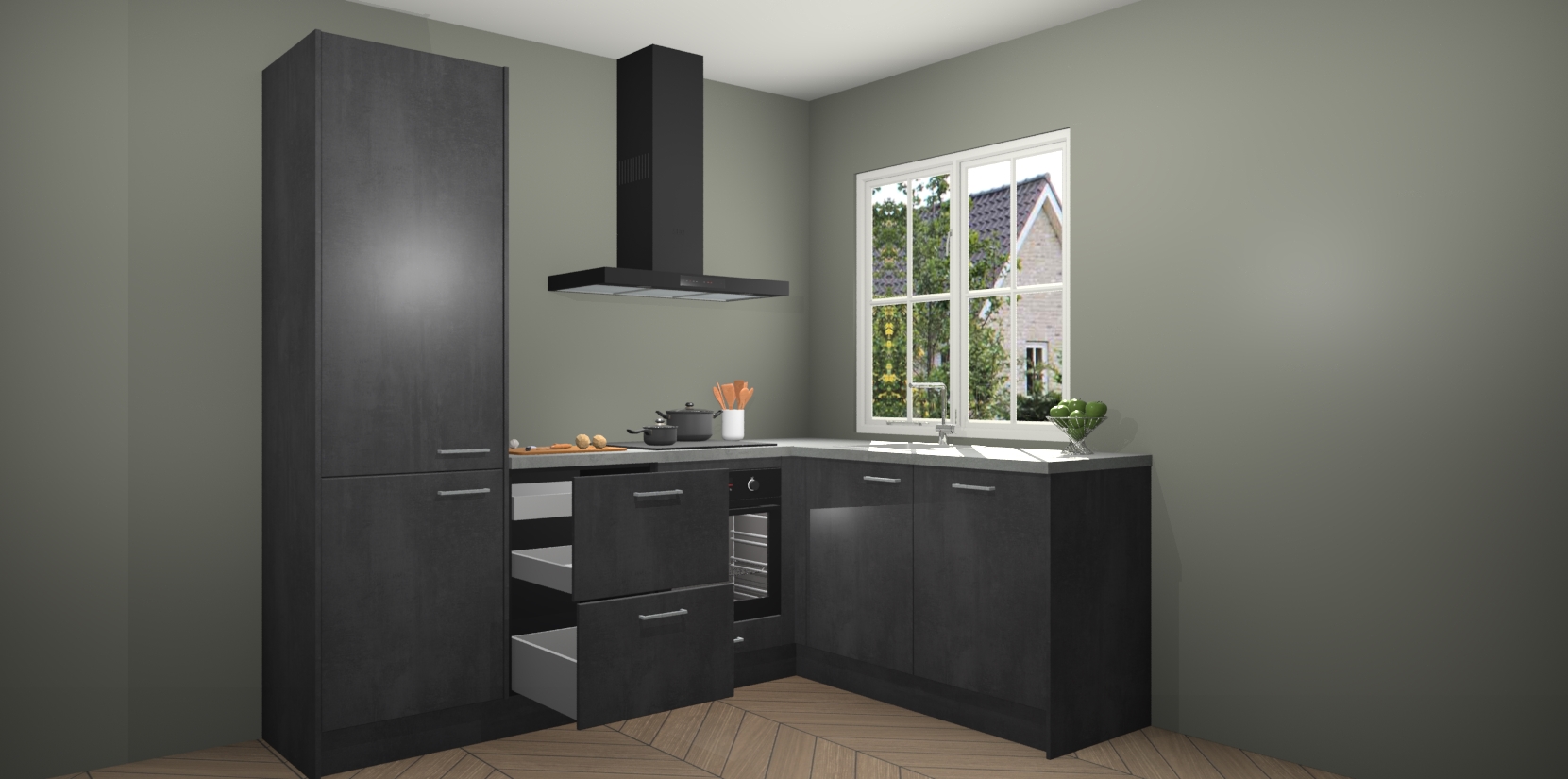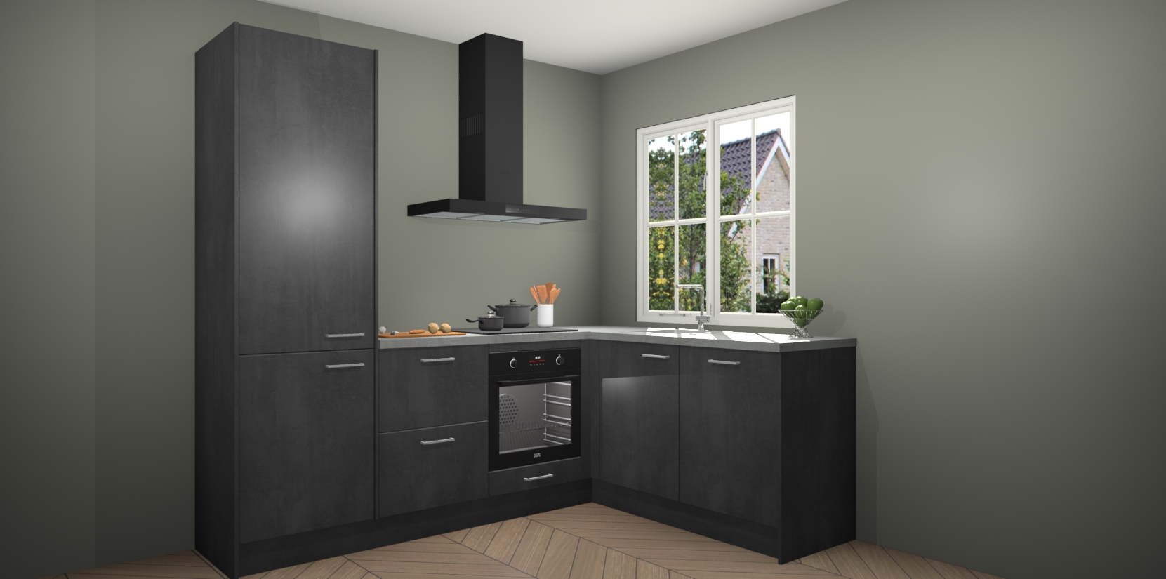 De Beton Zwarte keuken Linz is de perfecte keuze voor uw nieuwe moderne en tijdloze keuken. Ga voor moderne en tijdloze elegantie in uw keuken. De prachtige hoekkeuken biedt een verfrissende kijk op de manier waarop we ons vertrouwde keukenontwerp kunnen aanpassen in een nieuwe stijl. Één blik om alles te zien: zo mooi dat het bijna magisch lijkt.