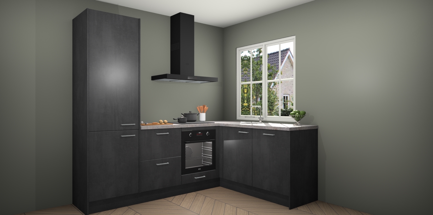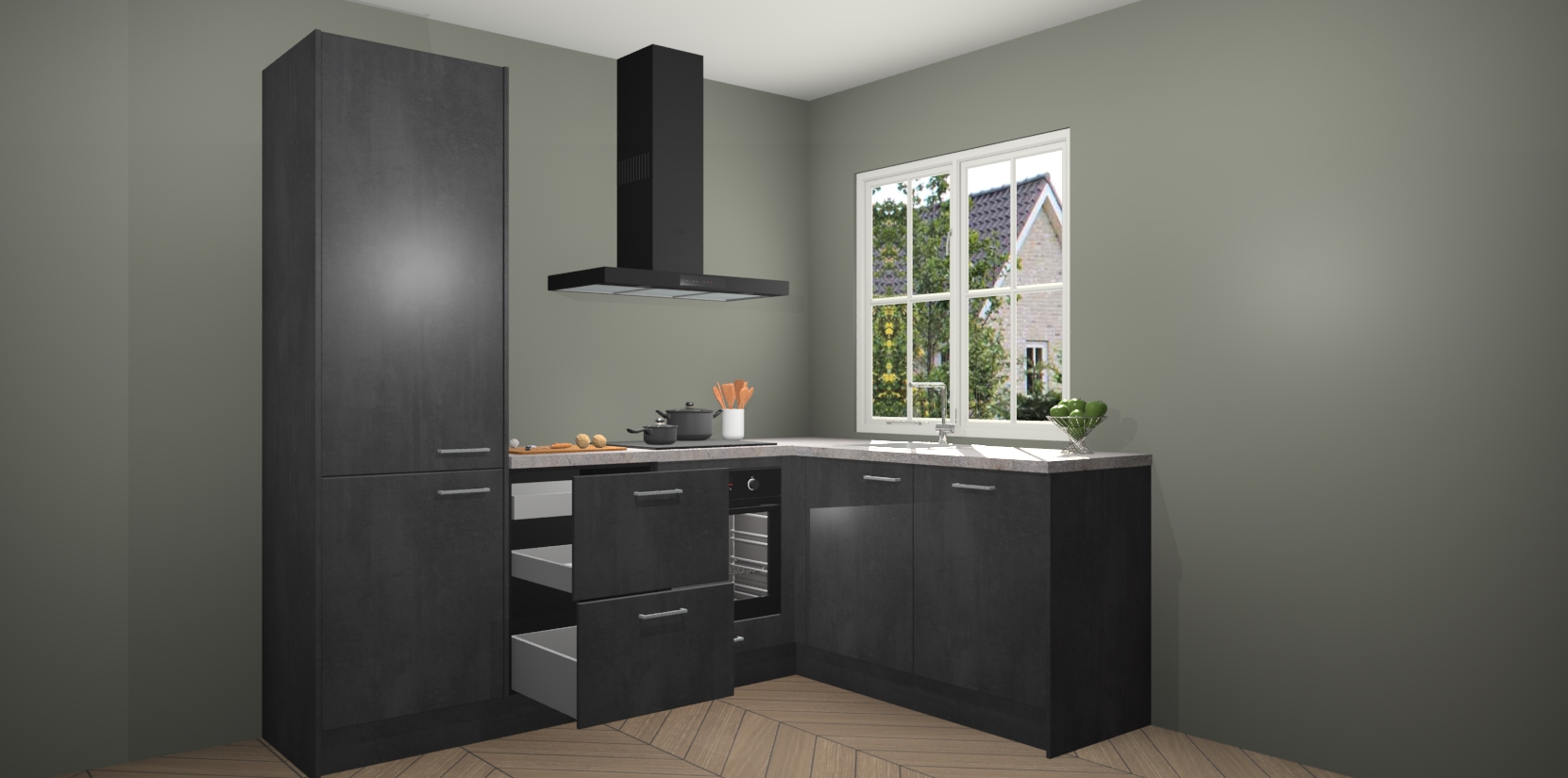 De Beton Zwarte keuken Linz is de perfecte keuze voor uw nieuwe moderne en tijdloze keuken. Ga voor moderne en tijdloze elegantie in uw keuken. De prachtige hoekkeuken biedt een verfrissende kijk op de manier waarop we ons vertrouwde keukenontwerp kunnen aanpassen in een nieuwe stijl.  Één blik om alles te zien: zo mooi dat het bijna magisch lijkt.