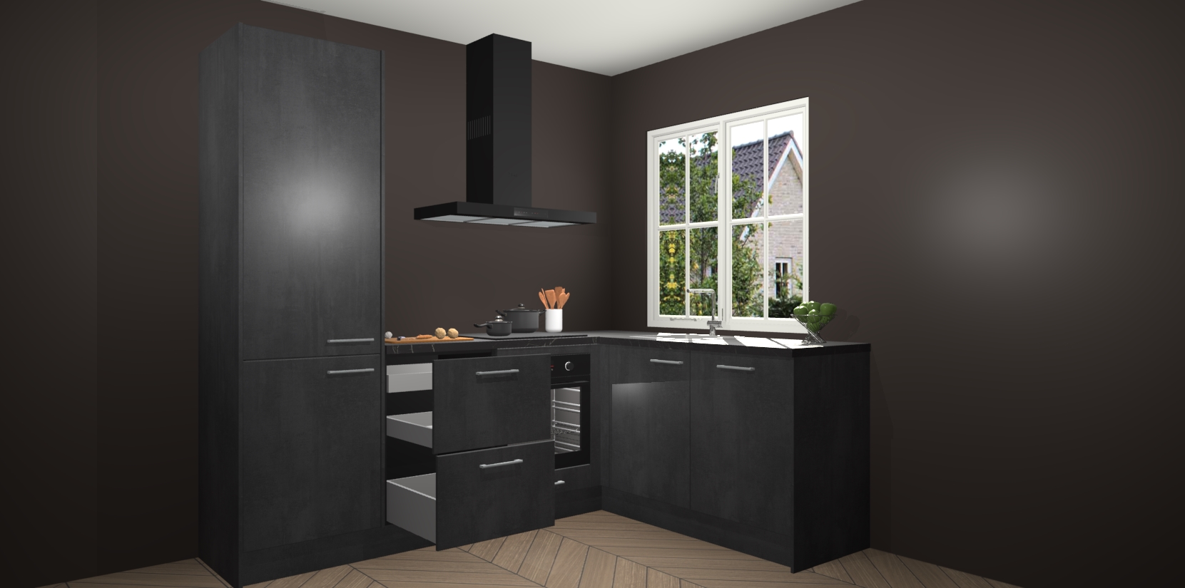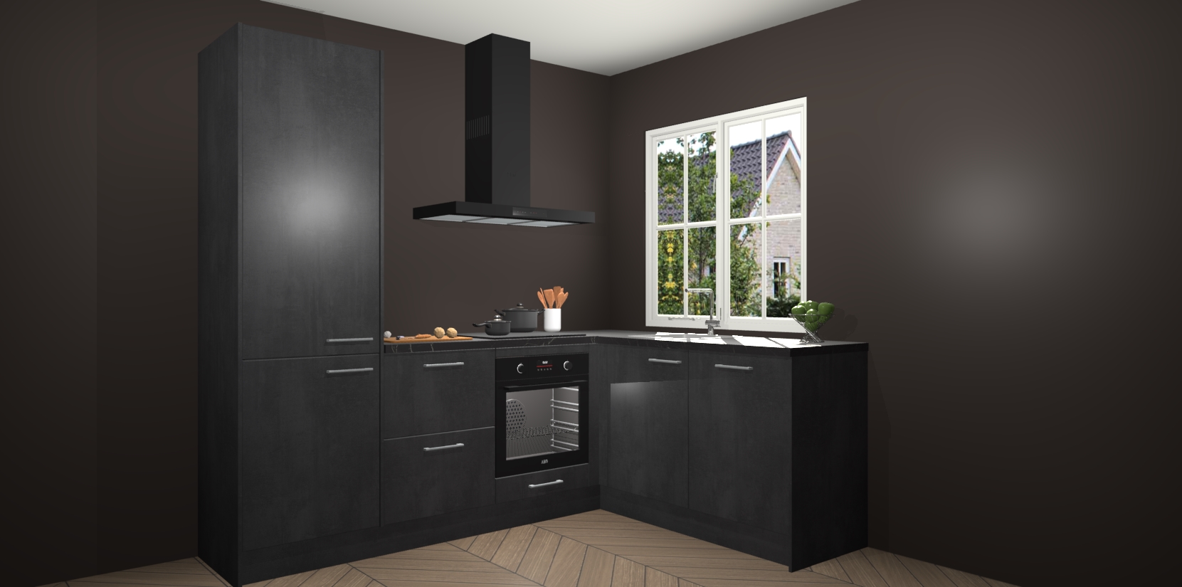De Beton Zwarte keuken Linz is de perfecte keuze voor uw nieuwe moderne en tijdloze keuken. Ga voor moderne en tijdloze elegantie in uw keuken. De prachtige hoekkeuken biedt een verfrissende kijk op de manier waarop we ons vertrouwde keukenontwerp kunnen aanpassen in een nieuwe stijl. Één blik om alles te zien: zo mooi dat het bijna magisch lijkt.