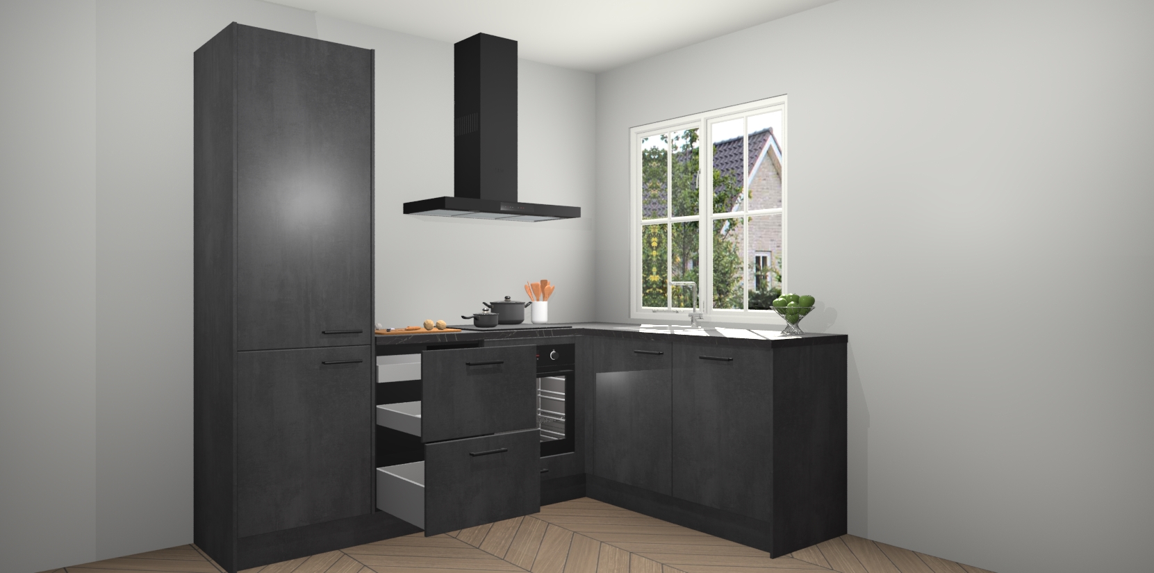 De Beton Zwarte keuken Linz is de perfecte keuze voor uw nieuwe moderne en tijdloze keuken. Ga voor moderne en tijdloze elegantie in uw keuken. De prachtige hoekkeuken biedt een verfrissende kijk op de manier waarop we ons vertrouwde keukenontwerp kunnen aanpassen in een nieuwe stijl. Één blik om alles te zien: zo mooi dat het bijna magisch lijkt.
