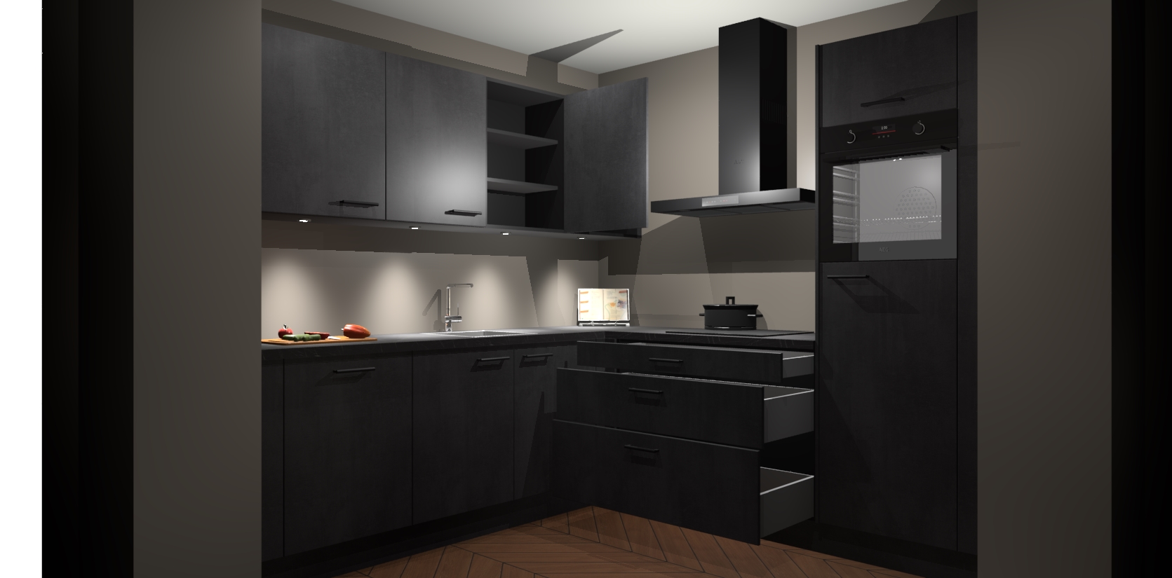 Wij presenteren de revolutie in keukens: de Beton Zwarte keuken Luanda. Met modern design, een tijdloos uiterlijk en kasten die al voor gemonteerd worden geleverd, laat deze stijlvolle keuken uw kookervaring op een hele nieuwe manier transformeren.