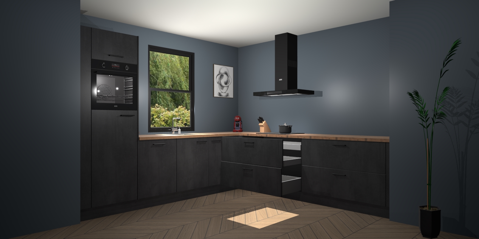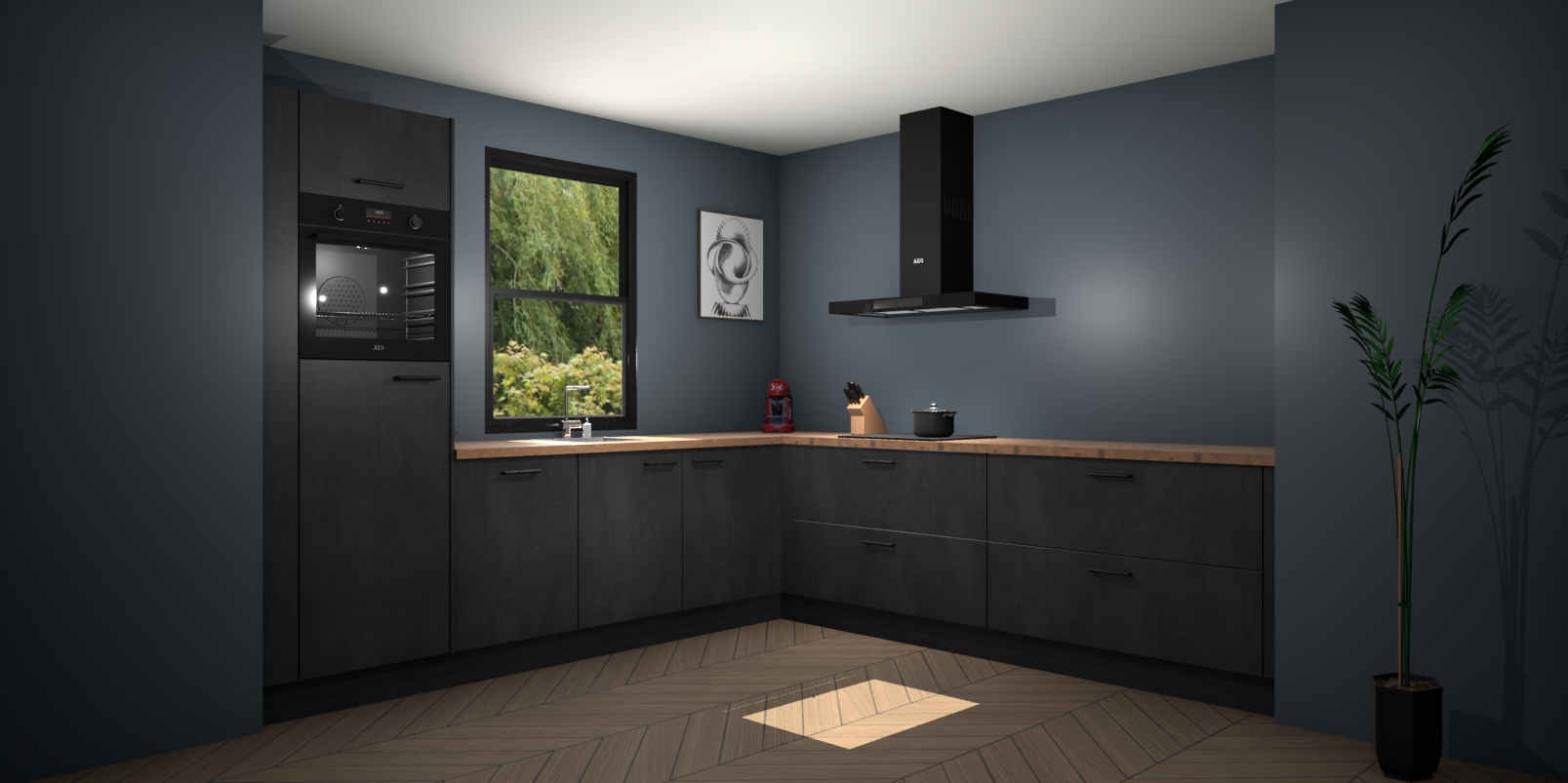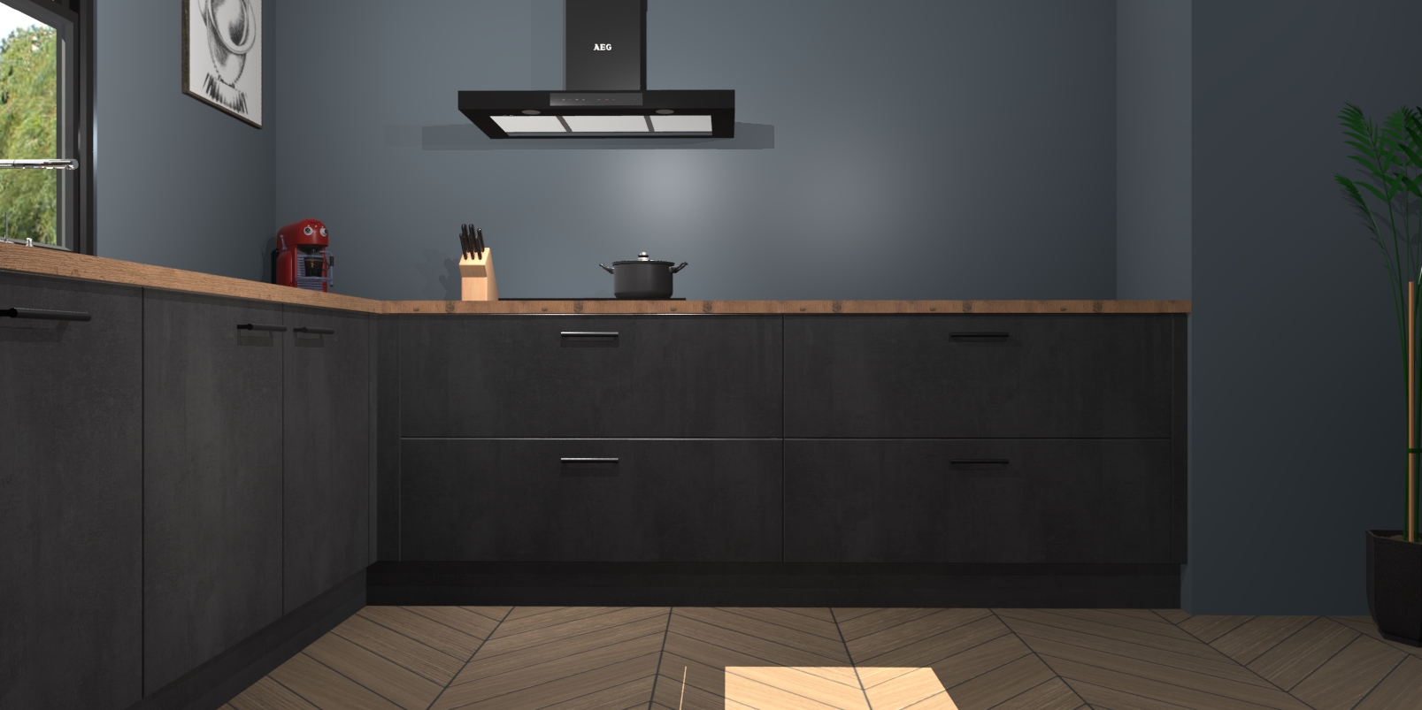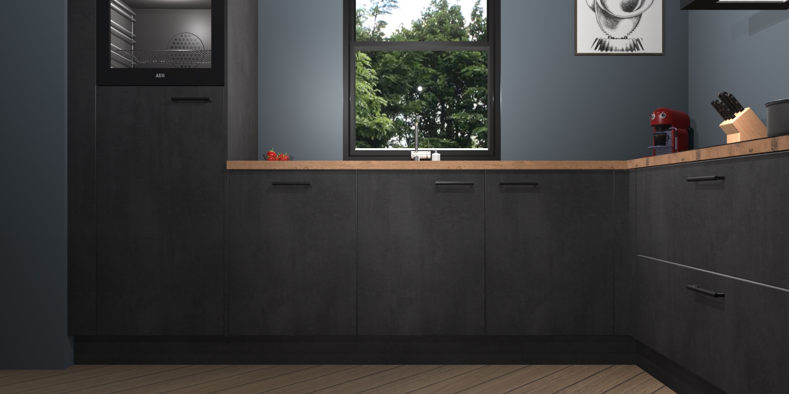 Welkom bij de Beton zwarte keuken Lublin. Deze prachtige keuken zal de komende jaren het middelpunt van de belangstelling in uw huis zijn. Uitgerust met vijf inbouwapparaten komt u nooit kookgereedschap tekort. Bovendien geeft de warme houtlook elke ruimte een uitnodigende en tijdloze uitstraling.