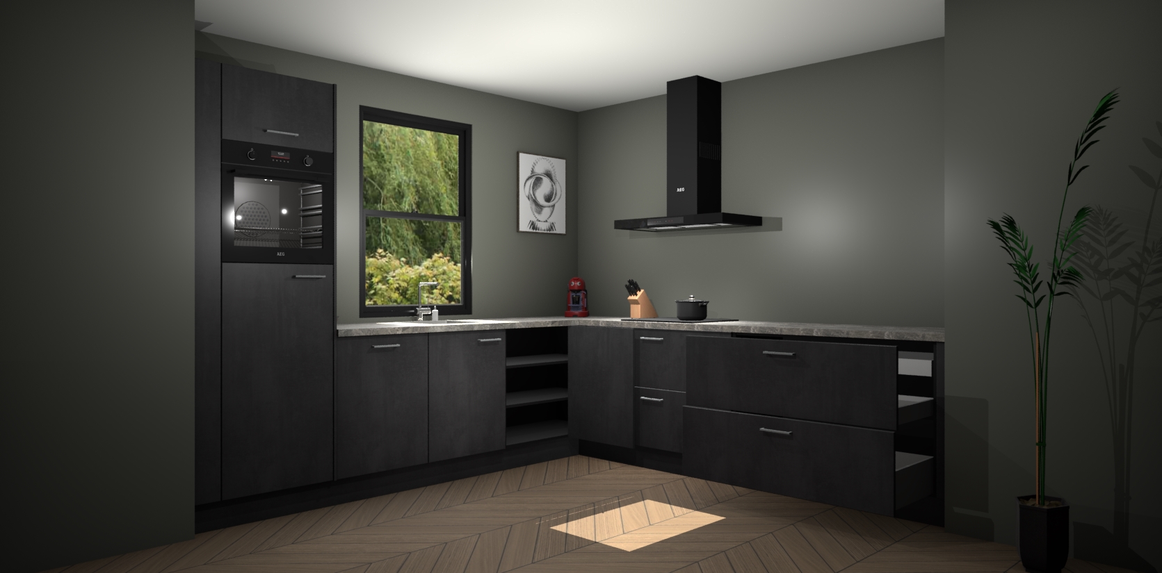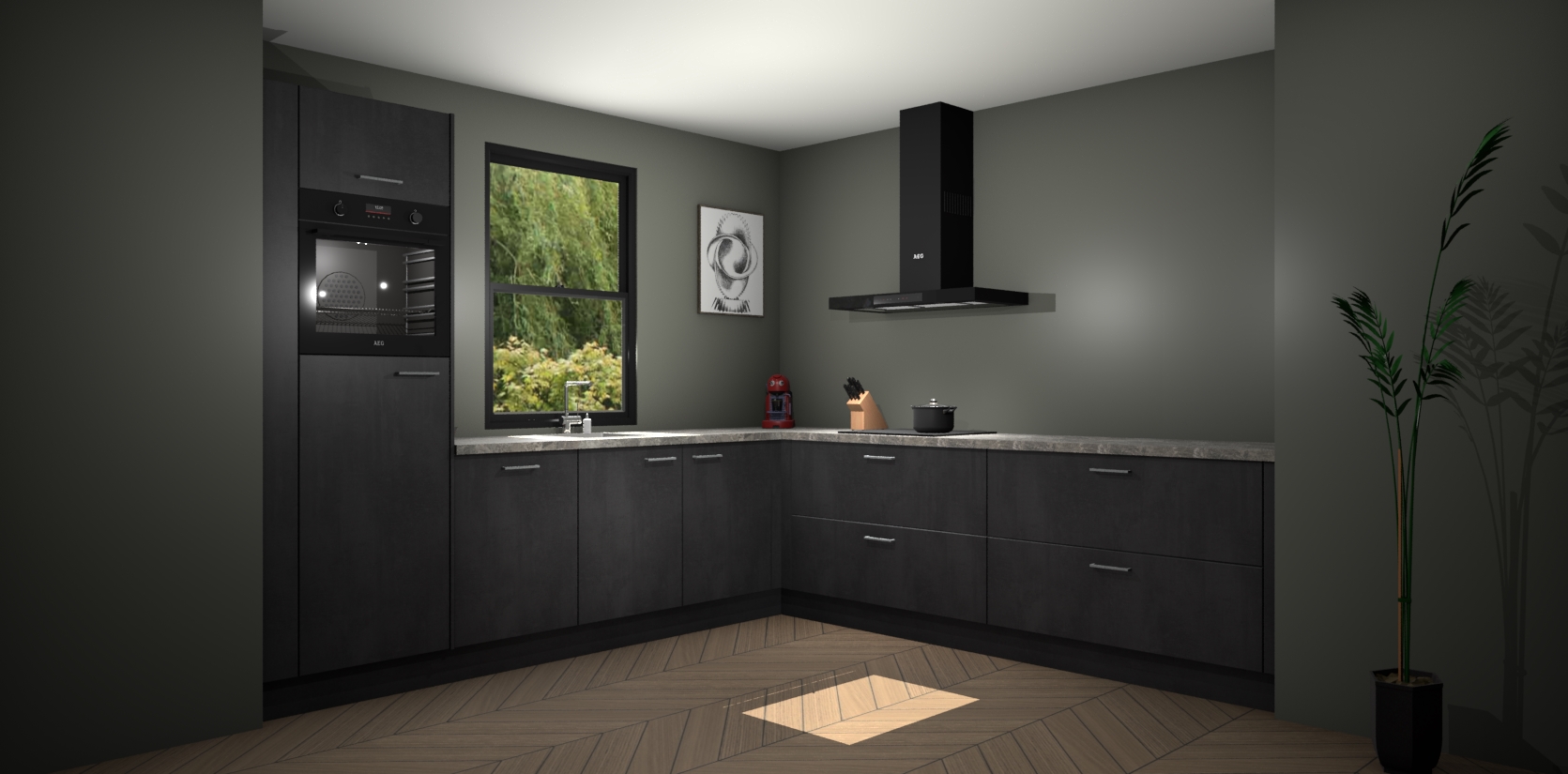Welkom bij de Beton zwarte keuken Lublin. Deze prachtige keuken zal de komende jaren het middelpunt van de belangstelling in uw huis zijn. Uitgerust met vijf inbouwapparaten komt u nooit kookgereedschap tekort. Bovendien geeft de warme houtlook elke ruimte een uitnodigende en tijdloze uitstraling.