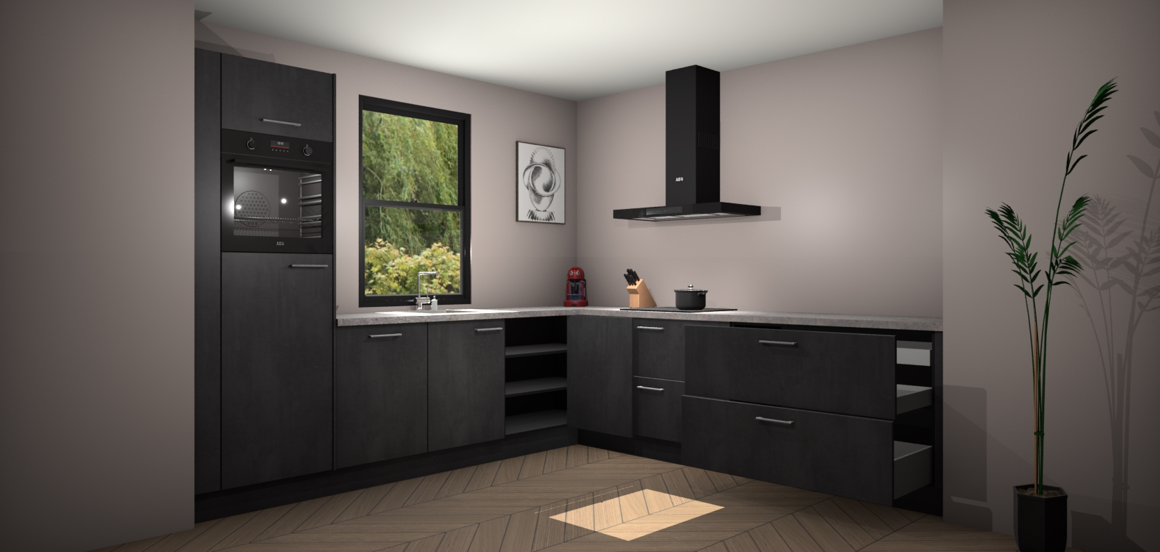 Welkom bij de Beton zwarte keuken Lublin. Deze prachtige keuken zal de komende jaren het middelpunt van de belangstelling in uw huis zijn. Uitgerust met vijf inbouwapparaten komt u nooit kookgereedschap tekort. Bovendien geeft de warme houtlook elke ruimte een uitnodigende en tijdloze uitstraling.