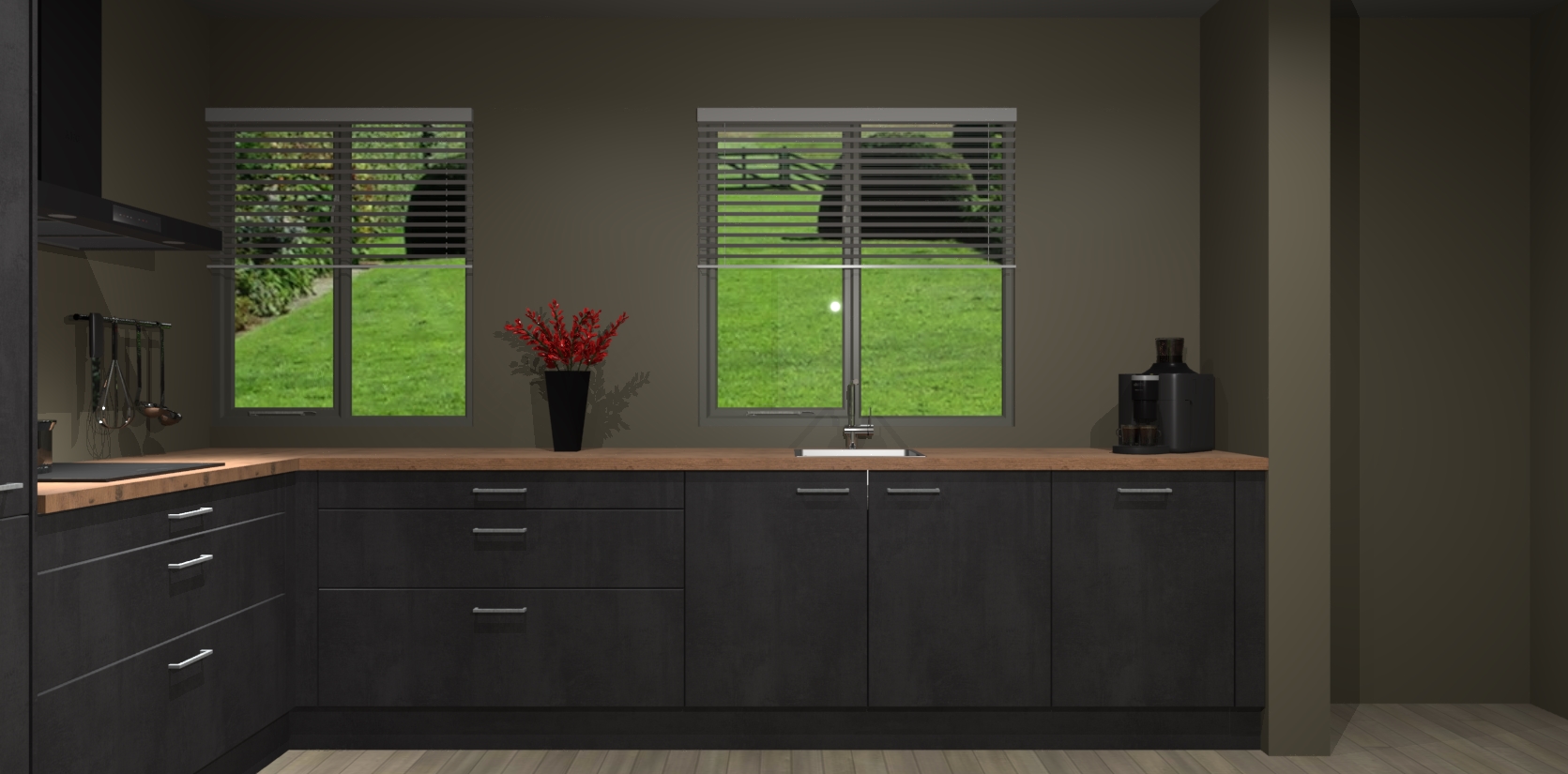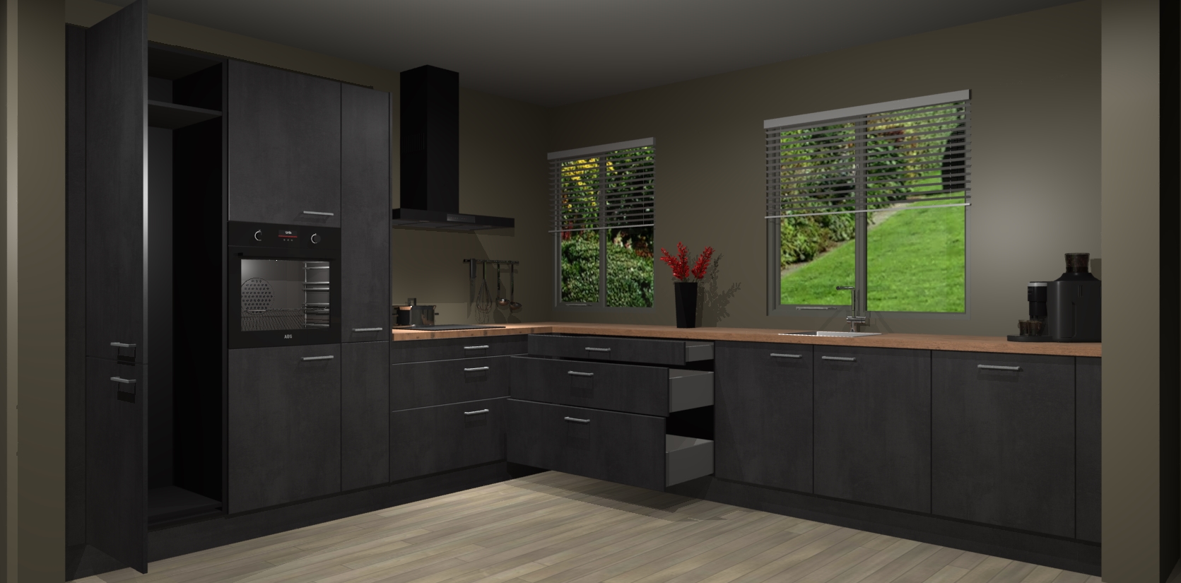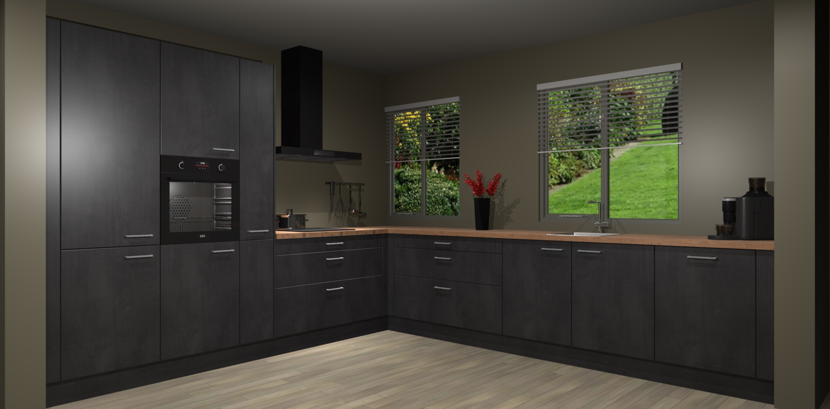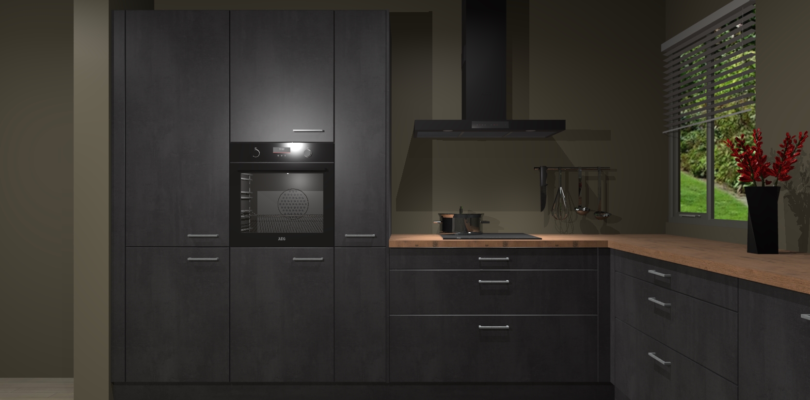 Welkom bij de Beton Zwarte keuken Palermo. Deze prachtige keuken zal de komende jaren het middelpunt van de belangstelling in uw huis zijn. Uitgerust met vijf inbouwapparaten komt u nooit kookgereedschap tekort. Bovendien geeft de warme houtlook elke ruimte een uitnodigende en tijdloze uitstraling.