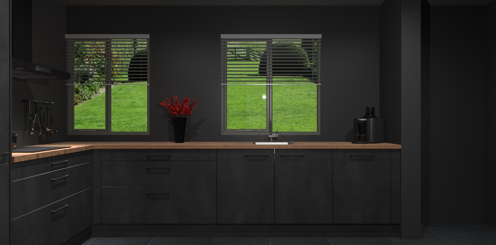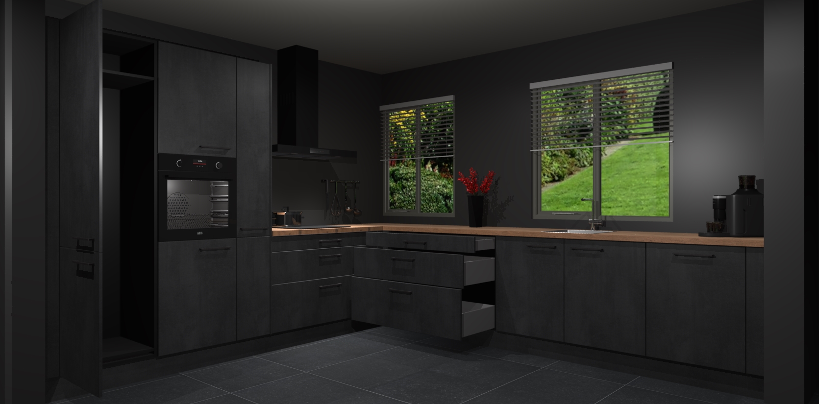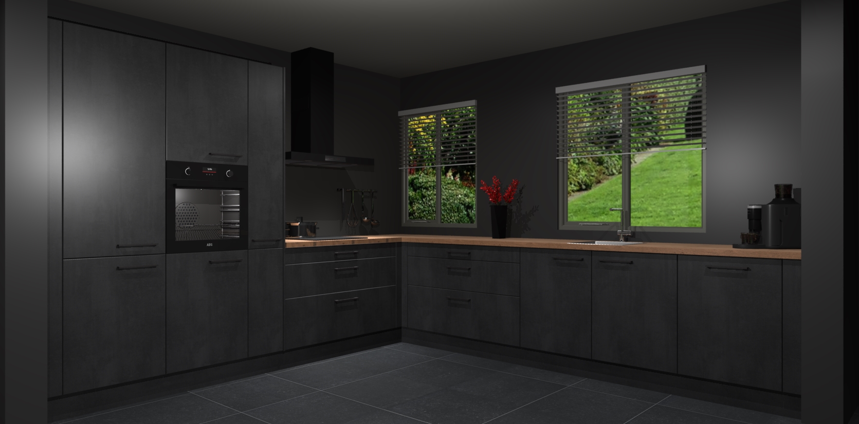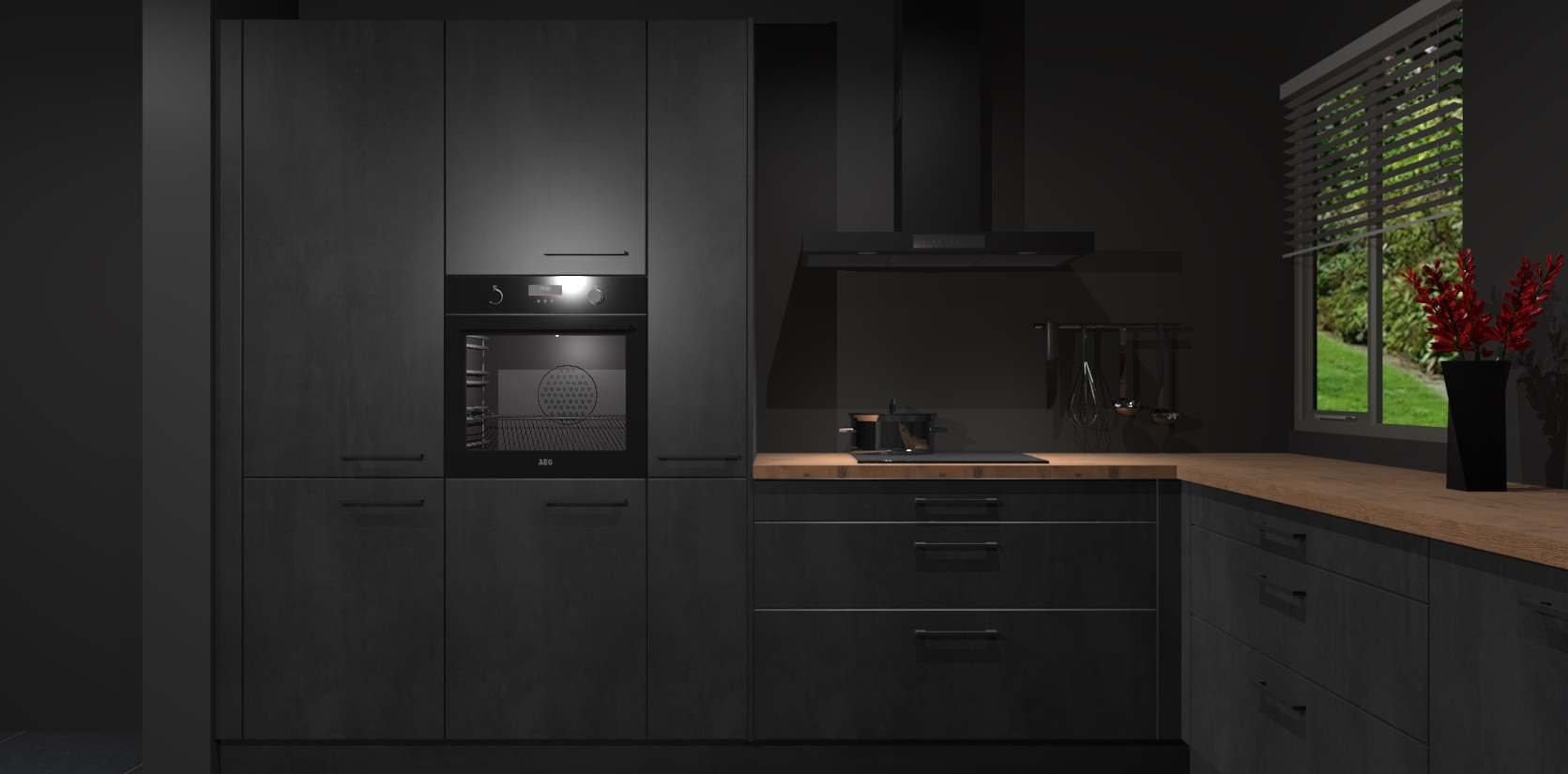 Welkom bij de Beton Zwarte keuken Palermo. Deze prachtige keuken zal de komende jaren het middelpunt van de belangstelling in uw huis zijn. Uitgerust met vijf inbouwapparaten komt u nooit kookgereedschap tekort. Bovendien geeft de warme houtlook elke ruimte een uitnodigende en tijdloze uitstraling.