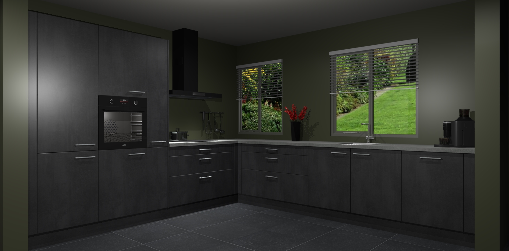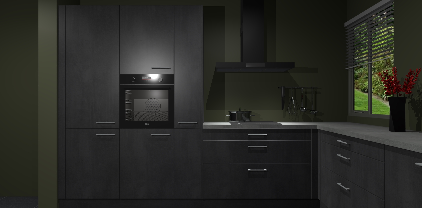 Welkom bij de Beton Zwarte keuken Palermo. Deze prachtige keuken zal de komende jaren het middelpunt van de belangstelling in uw huis zijn. Uitgerust met vijf inbouwapparaten komt u nooit kookgereedschap tekort. Bovendien geeft de warme houtlook elke ruimte een uitnodigende en tijdloze uitstraling.
