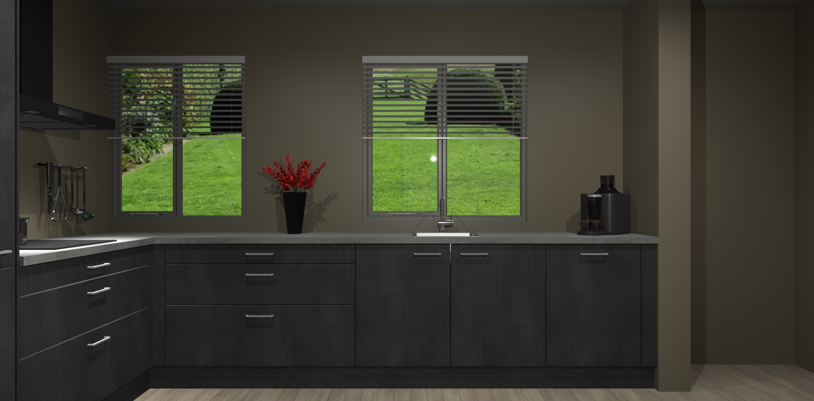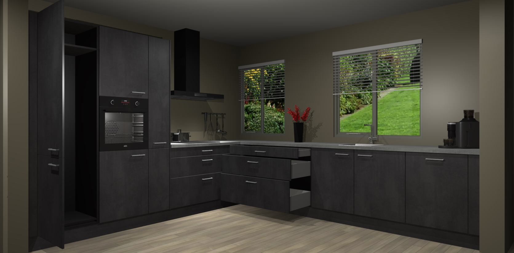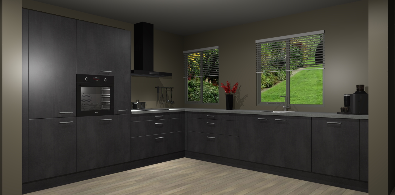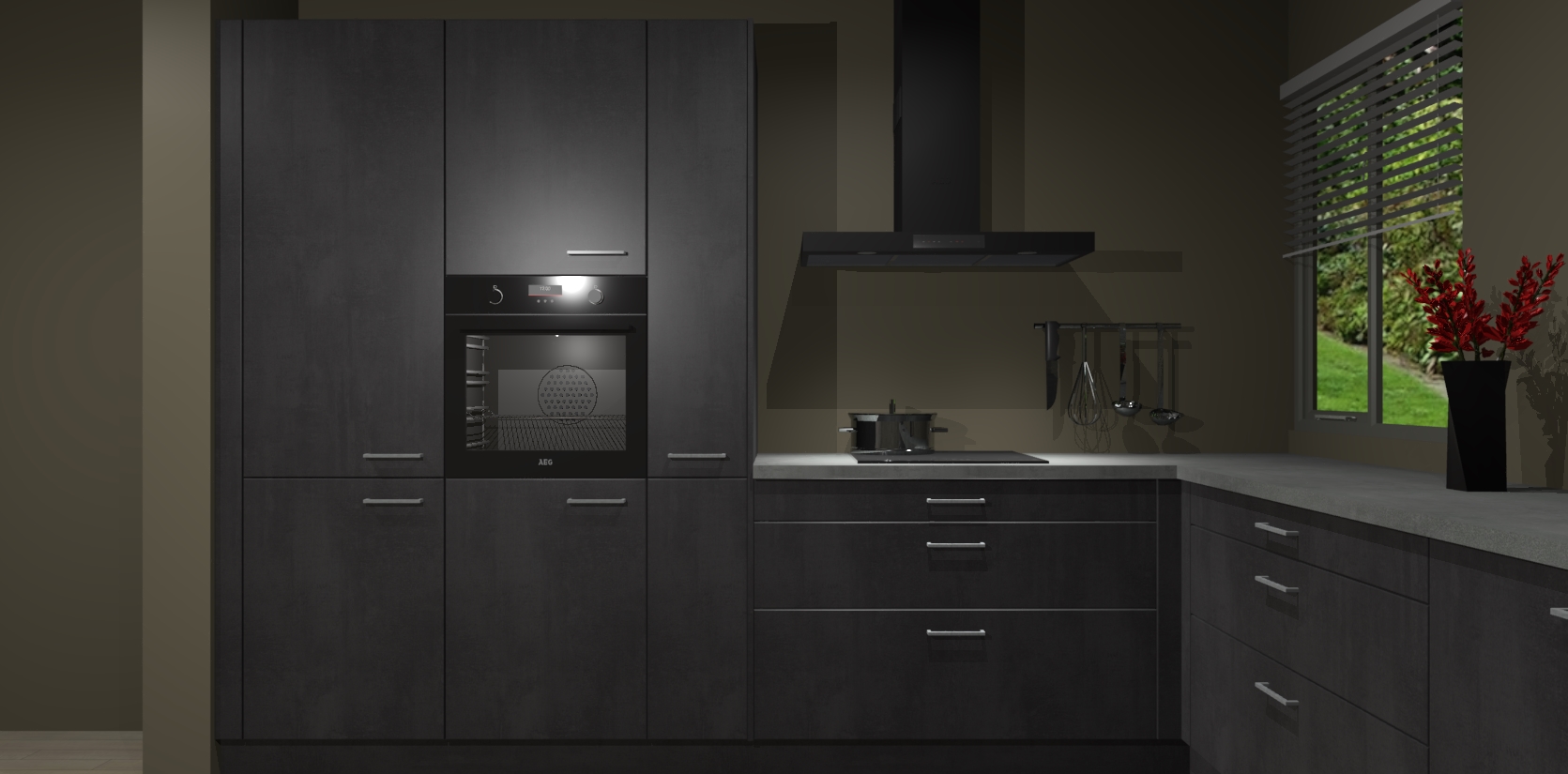 Welkom bij de Beton Zwarte keuken Palermo. Deze prachtige keuken zal de komende jaren het middelpunt van de belangstelling in uw huis zijn. Uitgerust met vijf inbouwapparaten komt u nooit kookgereedschap tekort. Bovendien geeft de warme houtlook elke ruimte een uitnodigende en tijdloze uitstraling.