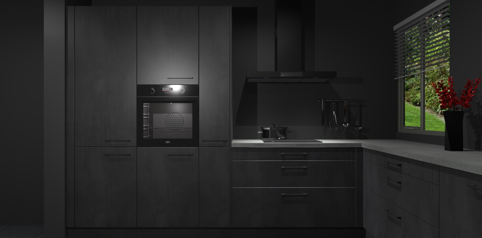Welkom bij de Beton Zwarte keuken Palermo. Deze prachtige keuken zal de komende jaren het middelpunt van de belangstelling in uw huis zijn. Uitgerust met vijf inbouwapparaten komt u nooit kookgereedschap tekort. Bovendien geeft de warme houtlook elke ruimte een uitnodigende en tijdloze uitstraling.