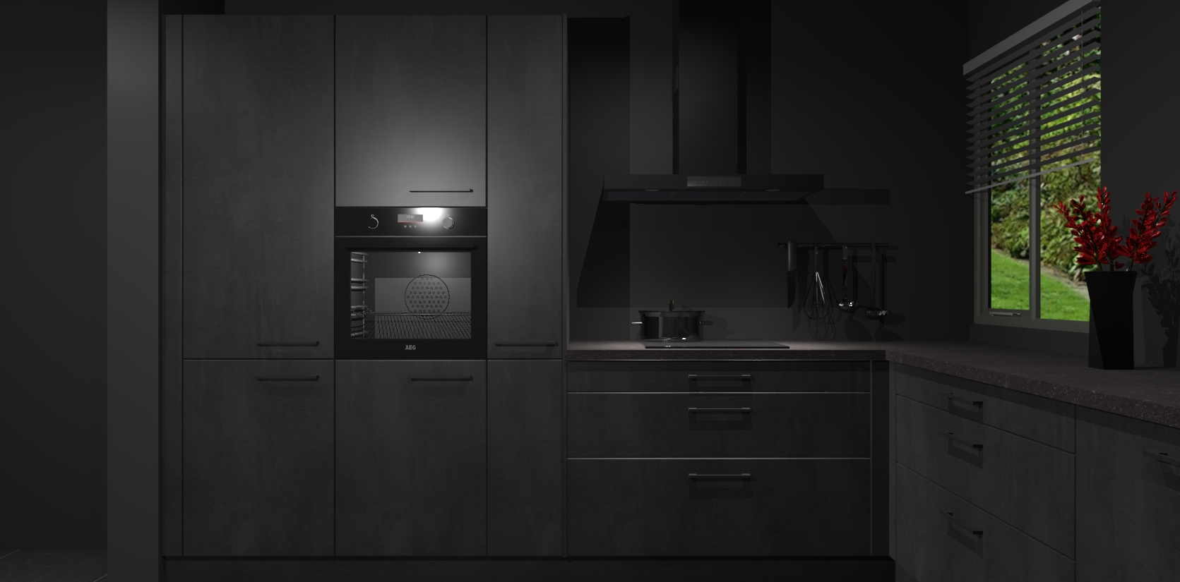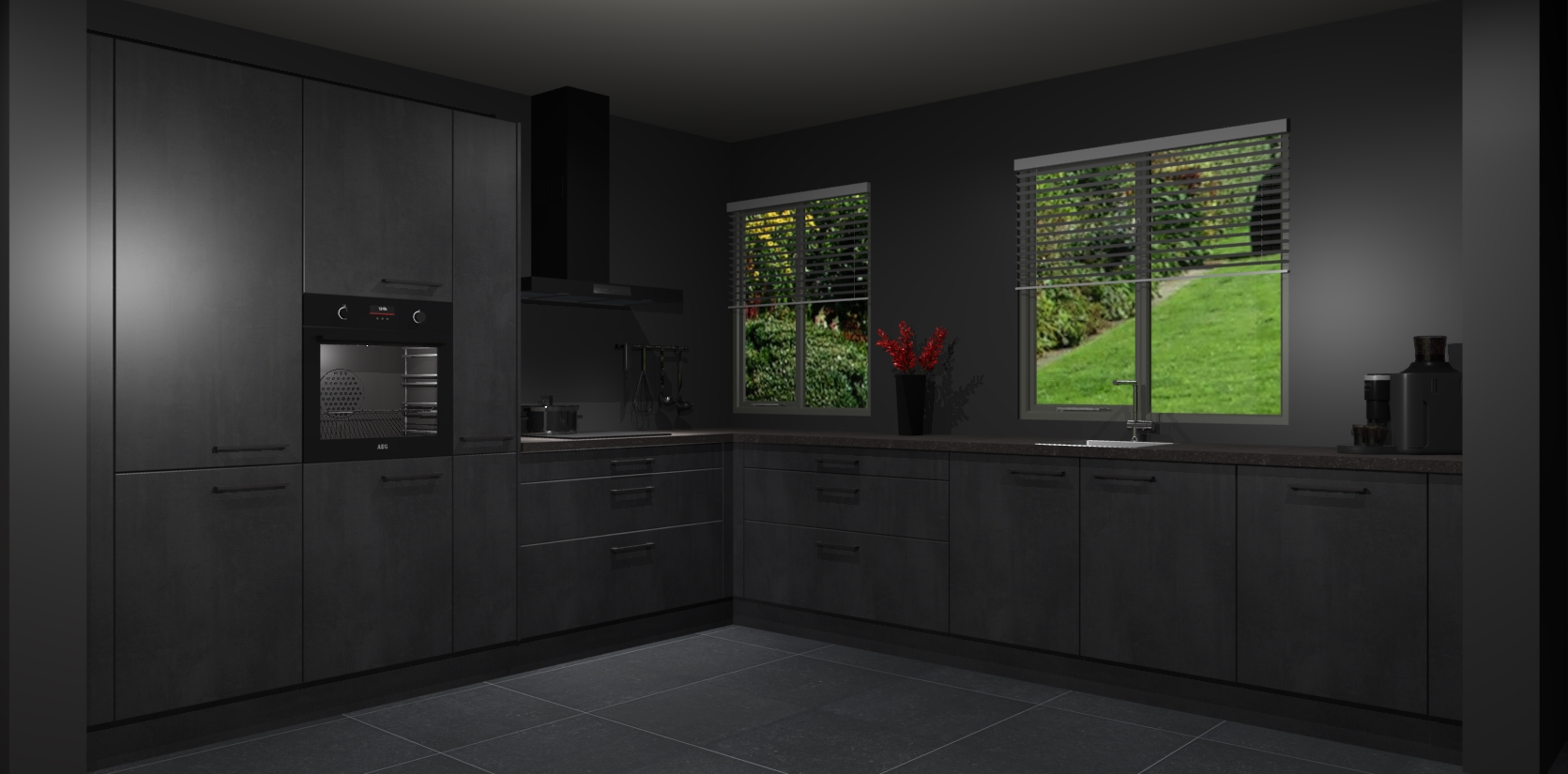 Welkom bij de Beton Zwarte keuken Palermo. Deze prachtige keuken zal de komende jaren het middelpunt van de belangstelling in uw huis zijn. Uitgerust met vijf inbouwapparaten komt u nooit kookgereedschap tekort. Bovendien geeft de warme houtlook elke ruimte een uitnodigende en tijdloze uitstraling.