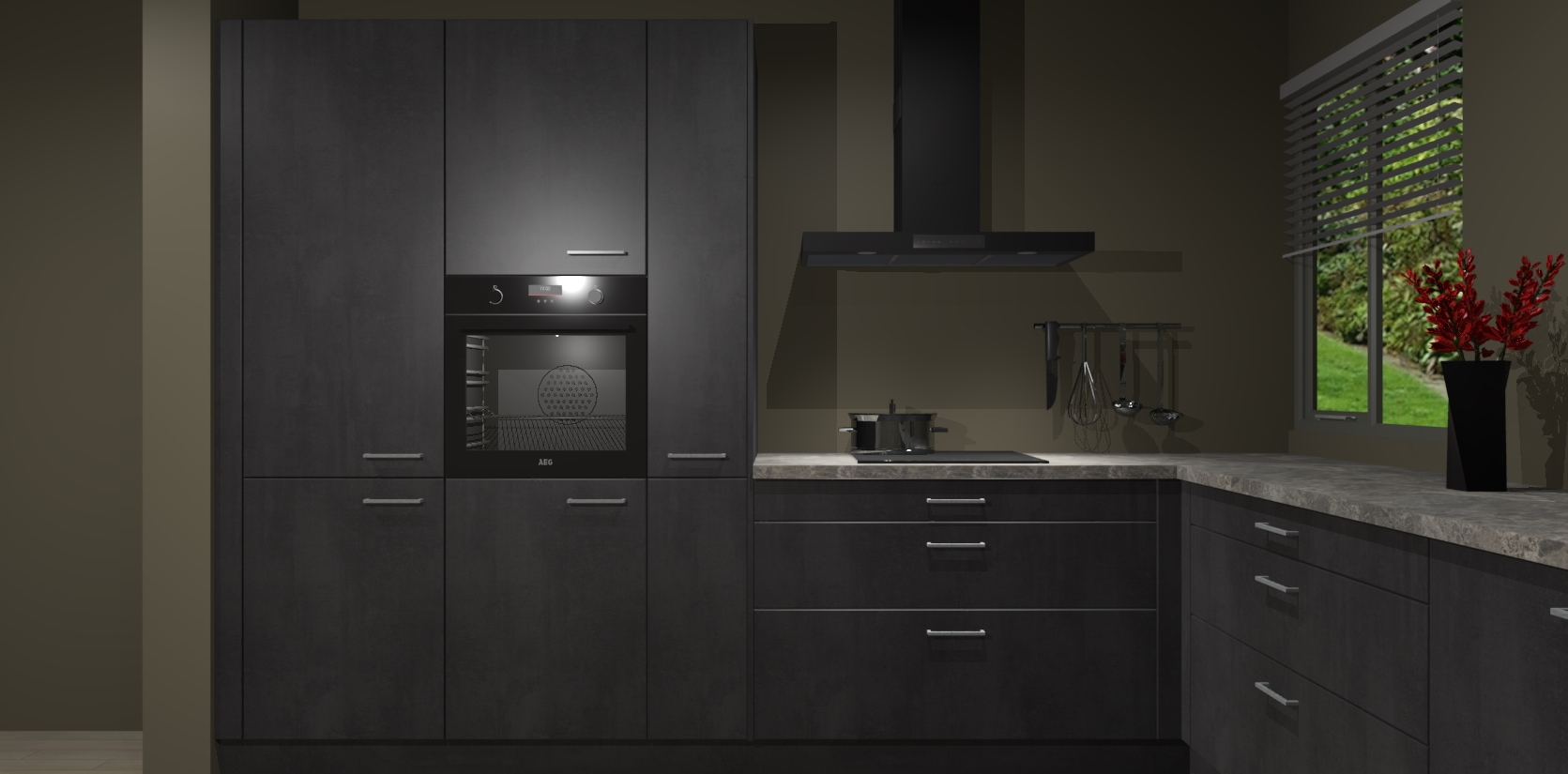 Welkom bij de Beton Zwarte keuken Palermo. Deze prachtige keuken zal de komende jaren het middelpunt van de belangstelling in uw huis zijn. Uitgerust met vijf inbouwapparaten komt u nooit kookgereedschap tekort. Bovendien geeft de warme houtlook elke ruimte een uitnodigende en tijdloze uitstraling.