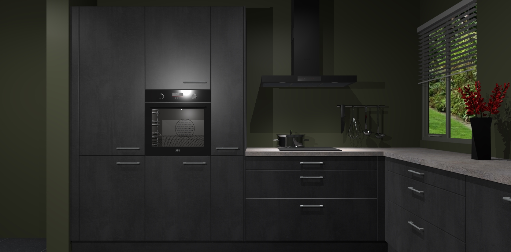 Welkom bij de Beton Zwarte keuken Palermo. Deze prachtige keuken zal de komende jaren het middelpunt van de belangstelling in uw huis zijn. Uitgerust met vijf inbouwapparaten komt u nooit kookgereedschap tekort. Bovendien geeft de warme houtlook elke ruimte een uitnodigende en tijdloze uitstraling.