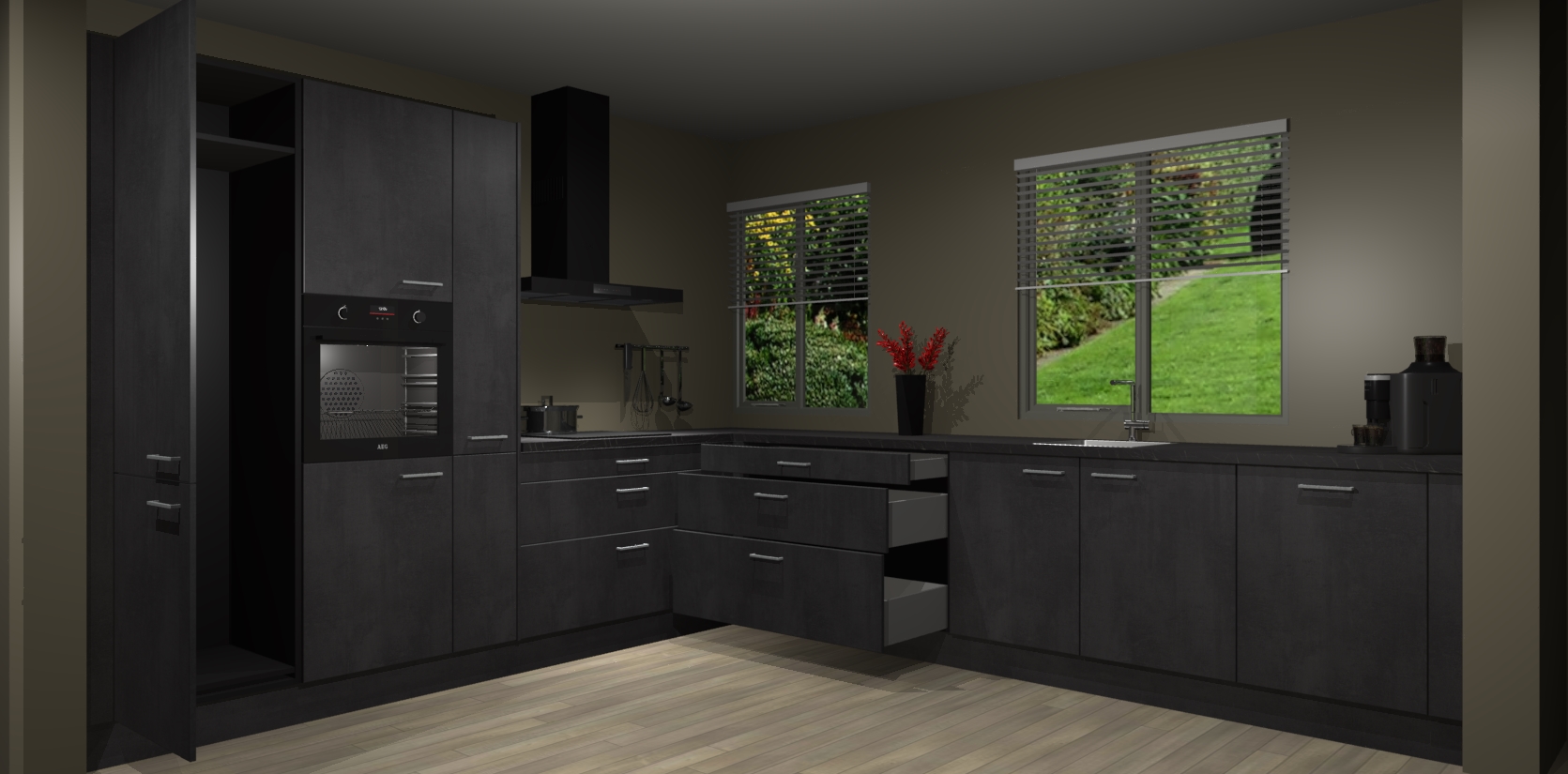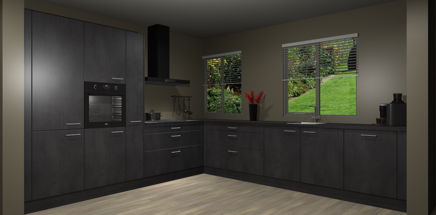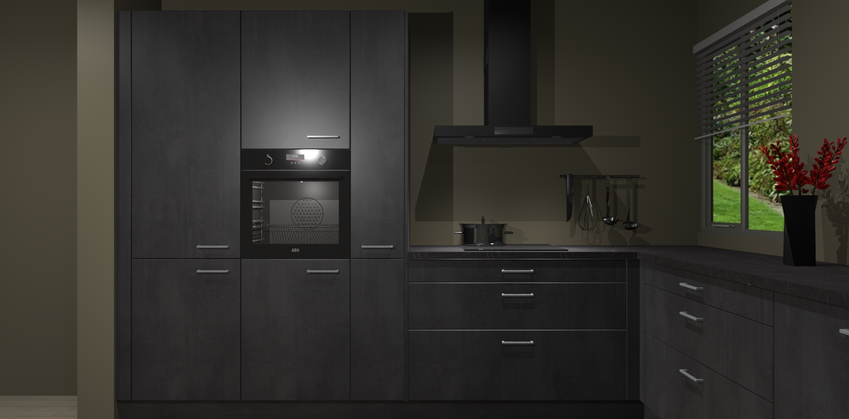 Welkom bij de Beton Zwarte keuken Palermo. Deze prachtige keuken zal de komende jaren het middelpunt van de belangstelling in uw huis zijn. Uitgerust met vijf inbouwapparaten komt u nooit kookgereedschap tekort. Bovendien geeft de warme houtlook elke ruimte een uitnodigende en tijdloze uitstraling.