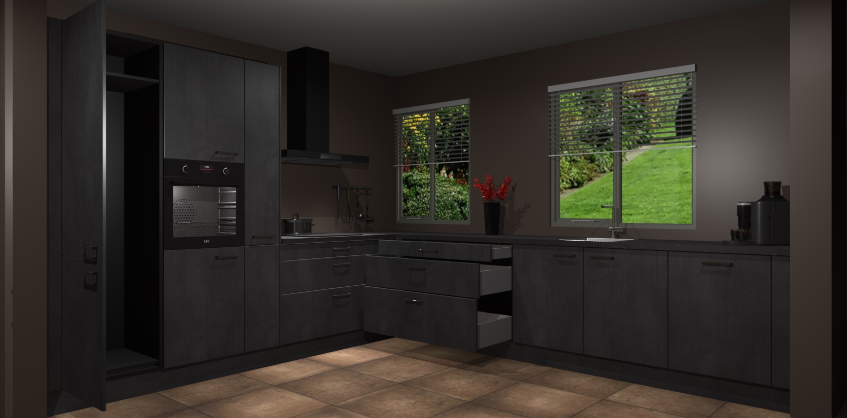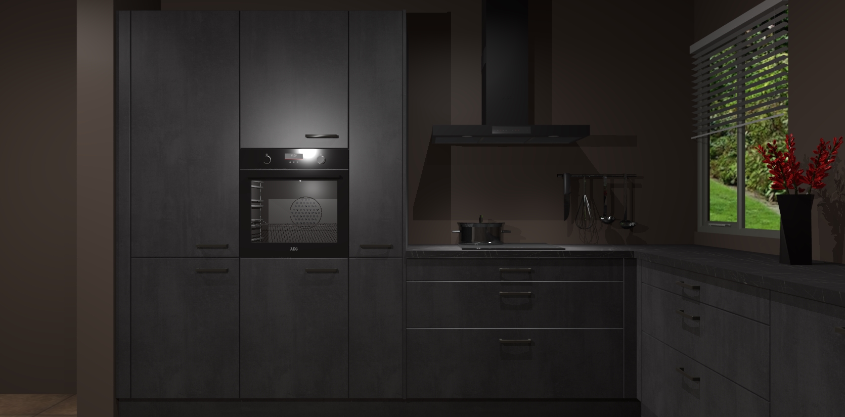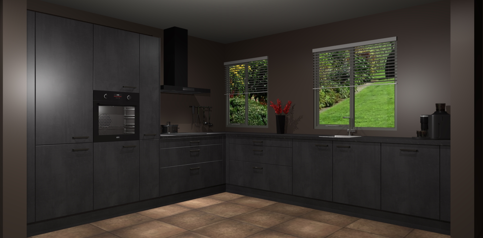 Welkom bij de Beton Zwarte keuken Palermo. Deze prachtige keuken zal de komende jaren het middelpunt van de belangstelling in uw huis zijn. Uitgerust met vijf inbouwapparaten komt u nooit kookgereedschap tekort. Bovendien geeft de warme houtlook elke ruimte een uitnodigende en tijdloze uitstraling.