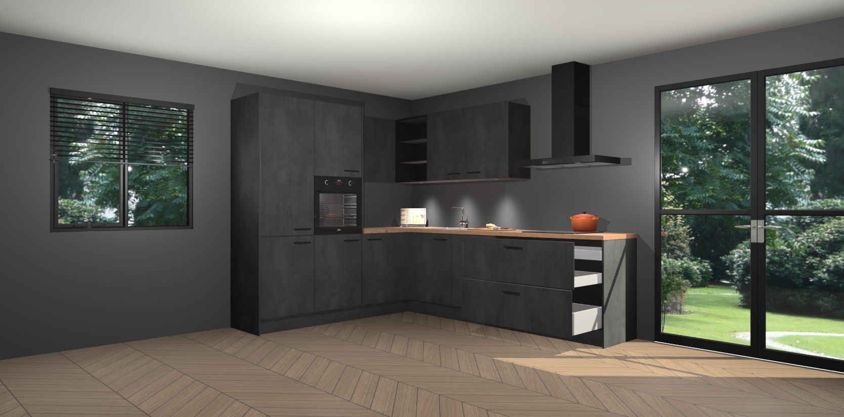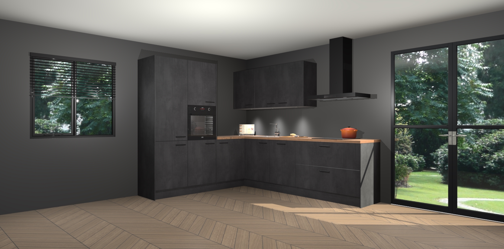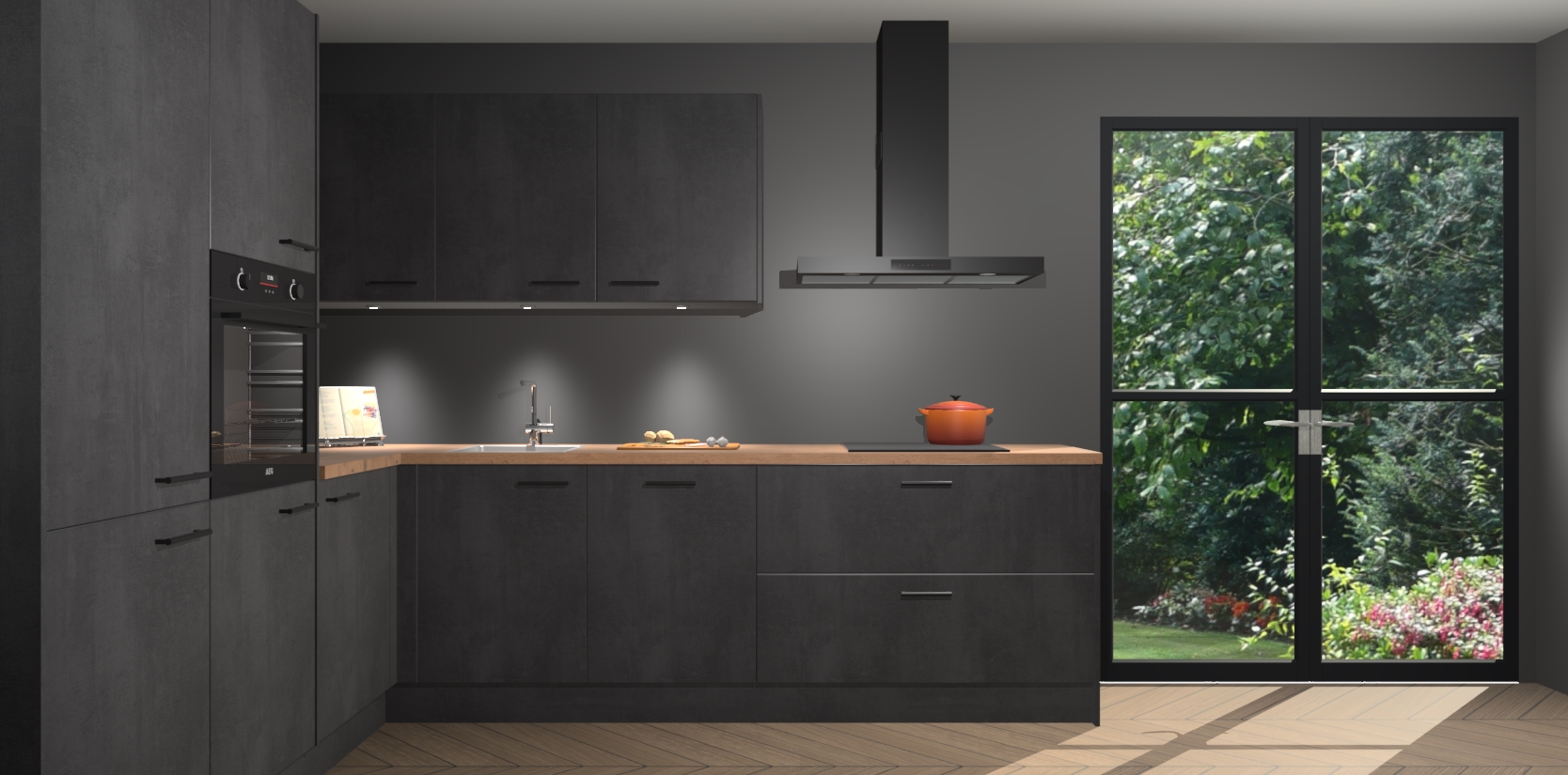 Maak kennis met de beton zwarte keuken Parla - de perfecte aanvulling voor uw moderne keuken! Ervaar tijdloos design, elegantie en een chique uitstraling met onze zwarte handgrepen, soft-close deuren en veel opbergruimte. Dit alles wordt aangeboden tegen een vaste lage prijs voor ongeëvenaarde Duitse keukenkwaliteit!