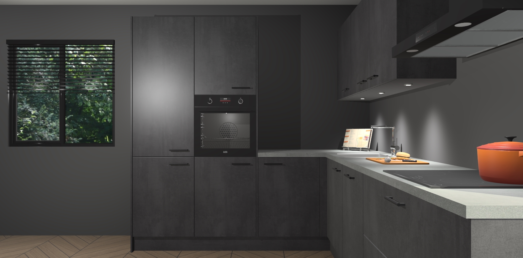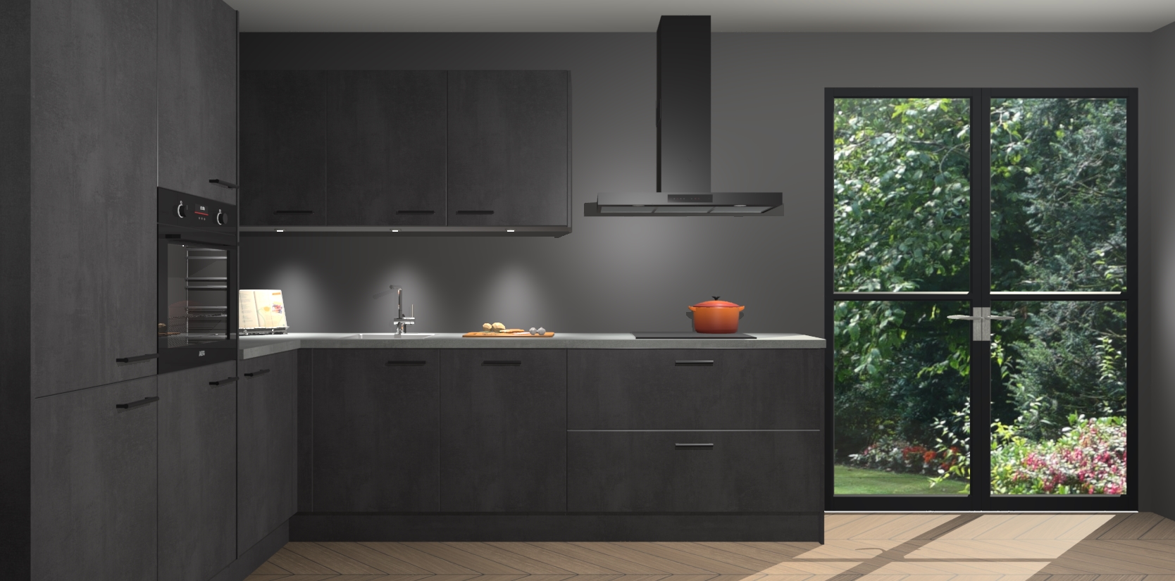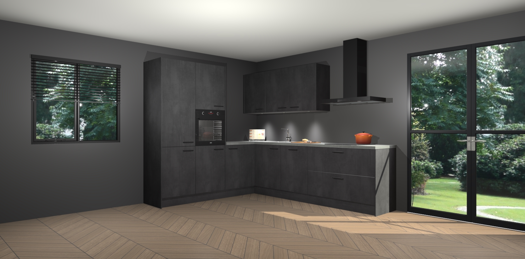 Maak kennis met de beton zwarte keuken Parla - de perfecte aanvulling voor uw moderne keuken! Ervaar tijdloos design, elegantie en een chique uitstraling met onze zwarte handgrepen, soft-close deuren en veel opbergruimte. Dit alles wordt aangeboden tegen een vaste lage prijs voor ongeëvenaarde Duitse keukenkwaliteit!