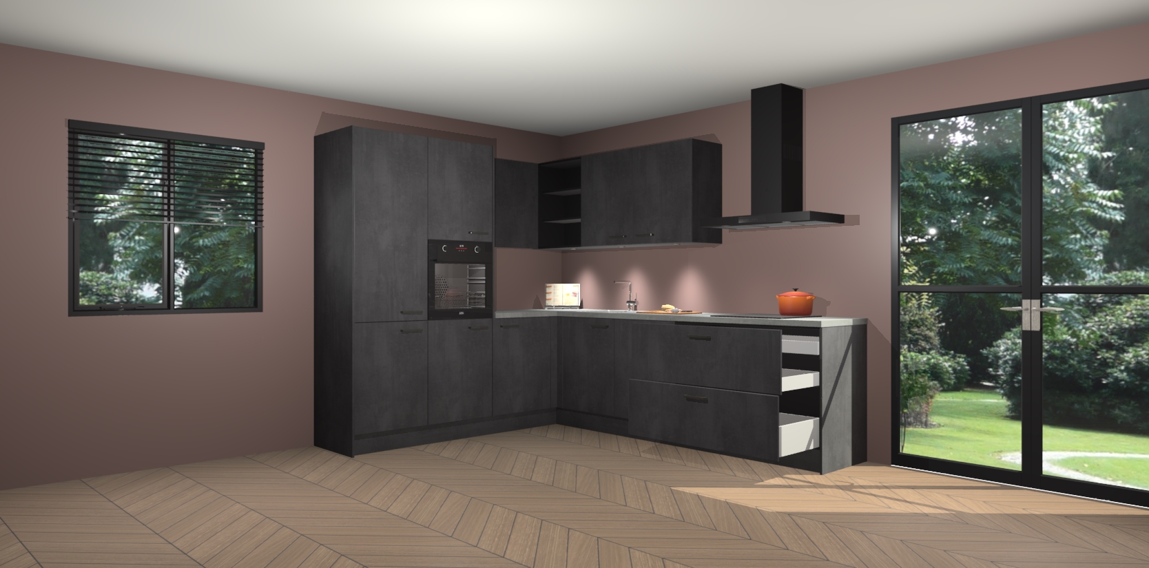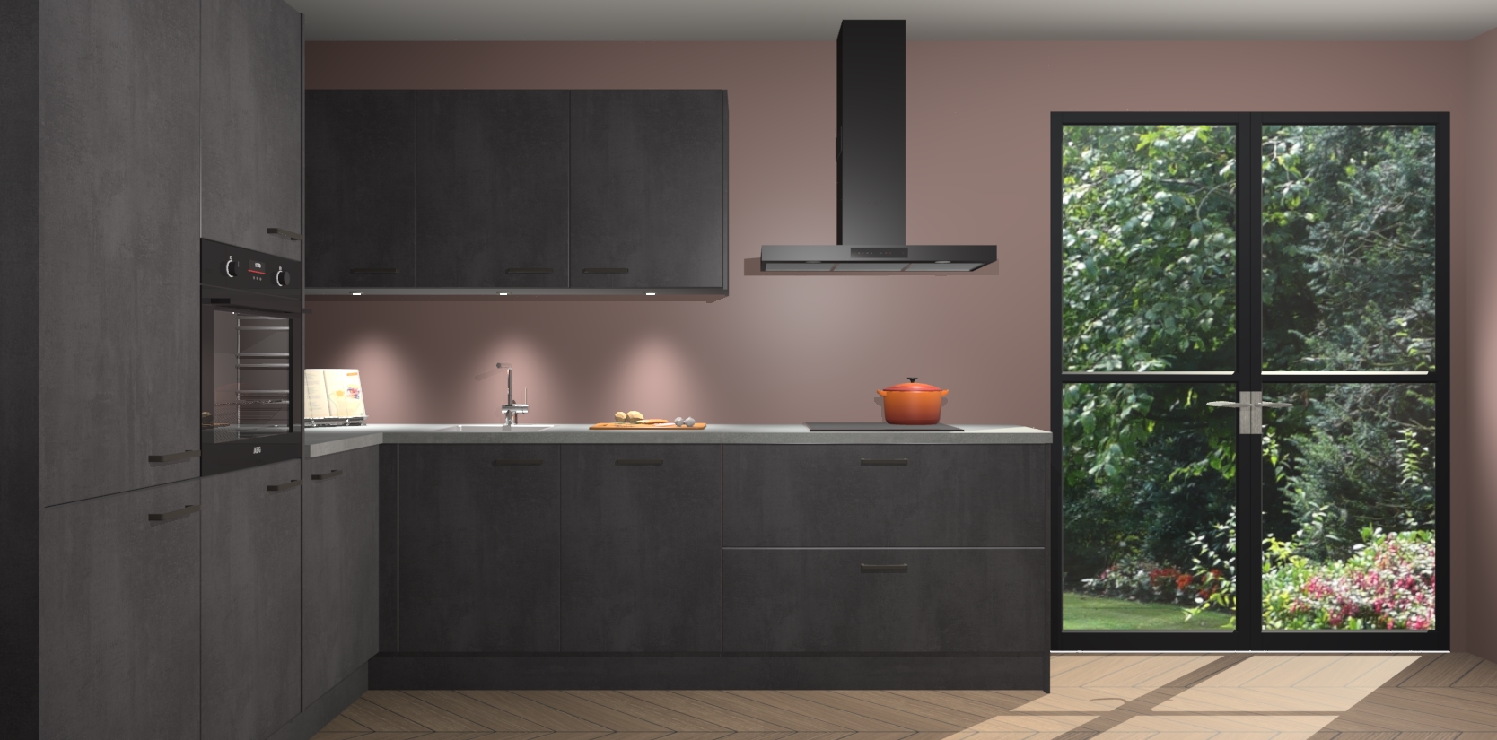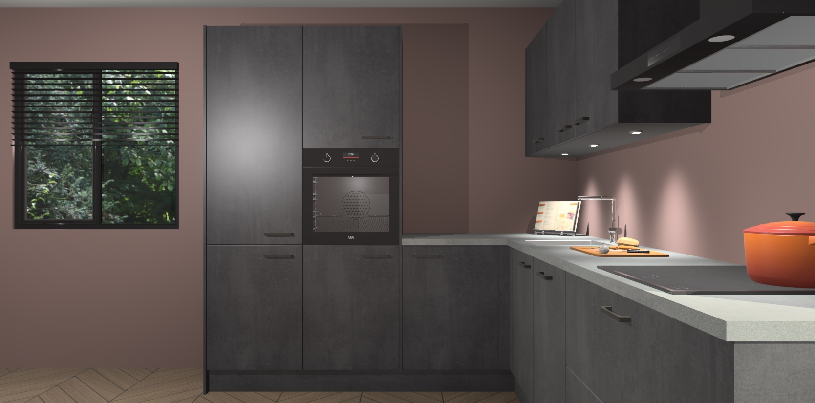Maak kennis met de beton zwarte keuken Parla - de perfecte aanvulling voor uw moderne keuken! Ervaar tijdloos design, elegantie en een chique uitstraling met onze zwarte handgrepen, soft-close deuren en veel opbergruimte. Dit alles wordt aangeboden tegen een vaste lage prijs voor ongeëvenaarde Duitse keukenkwaliteit!