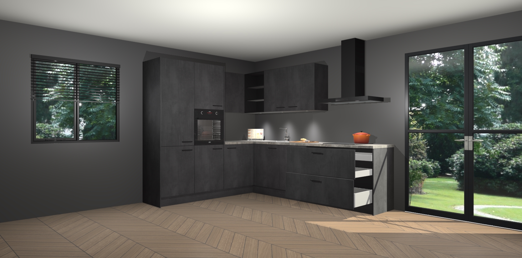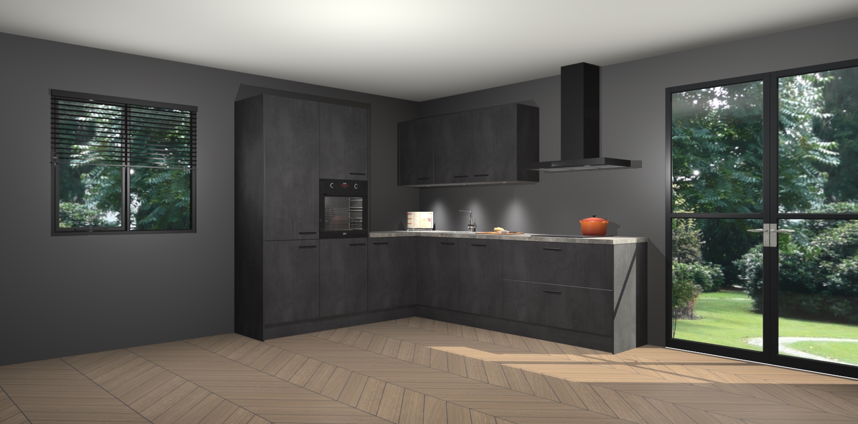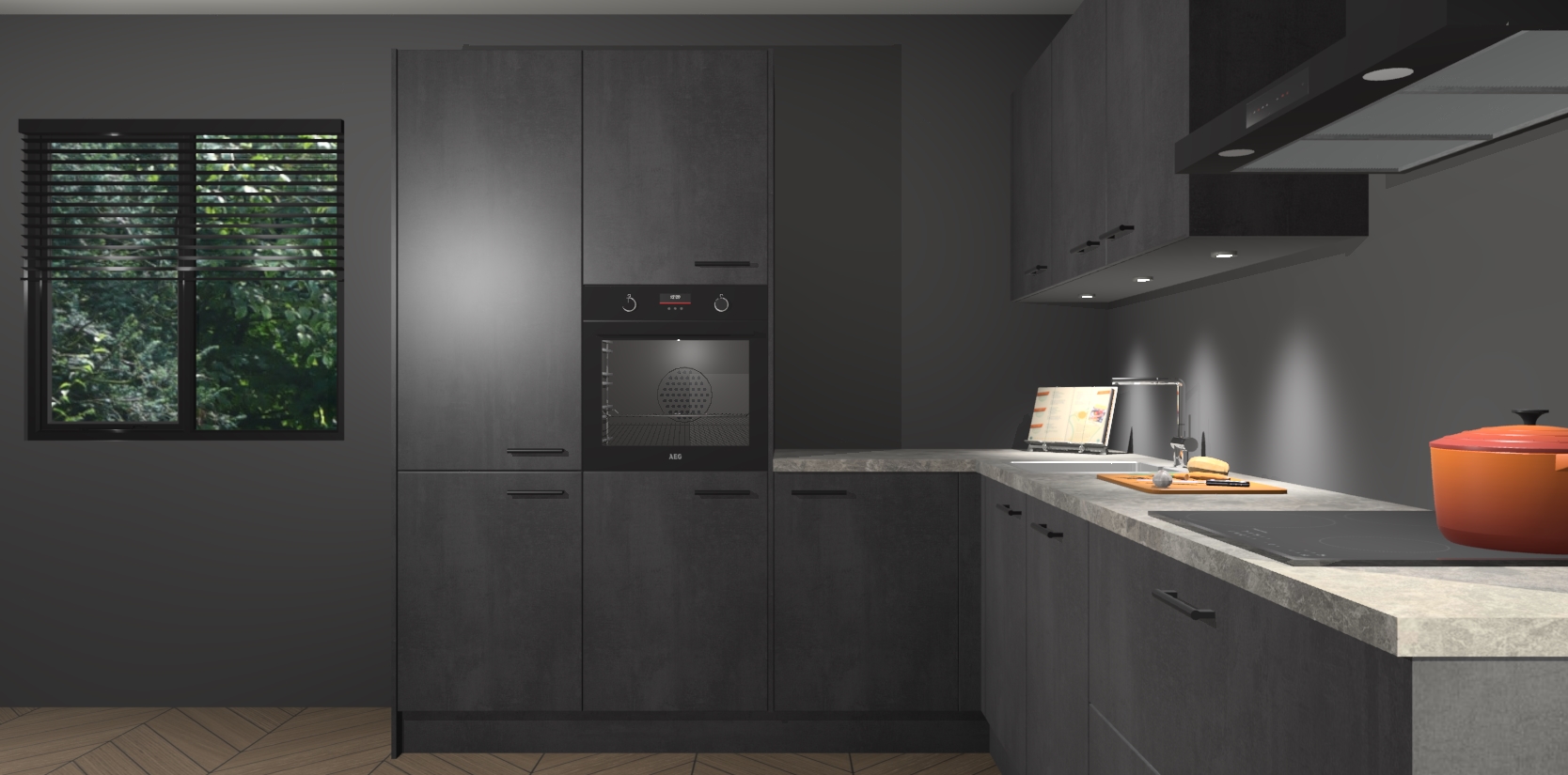 Maak kennis met de beton zwarte keuken Parla - de perfecte aanvulling voor uw moderne keuken! Ervaar tijdloos design, elegantie en een chique uitstraling met onze zwarte handgrepen, soft-close deuren en veel opbergruimte. Dit alles wordt aangeboden tegen een vaste lage prijs voor ongeëvenaarde Duitse keukenkwaliteit!
