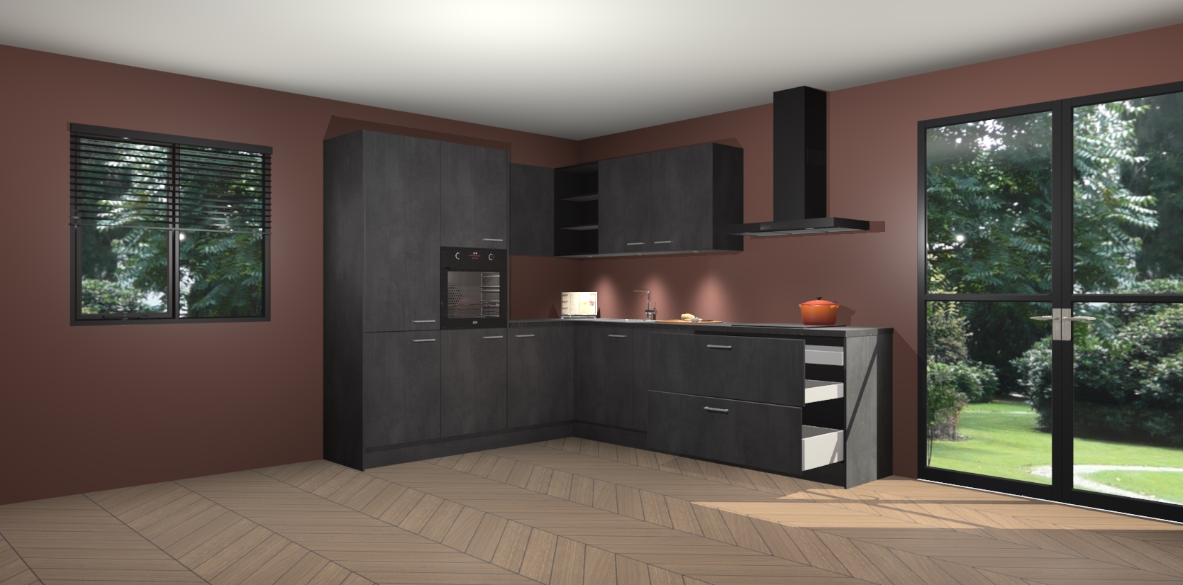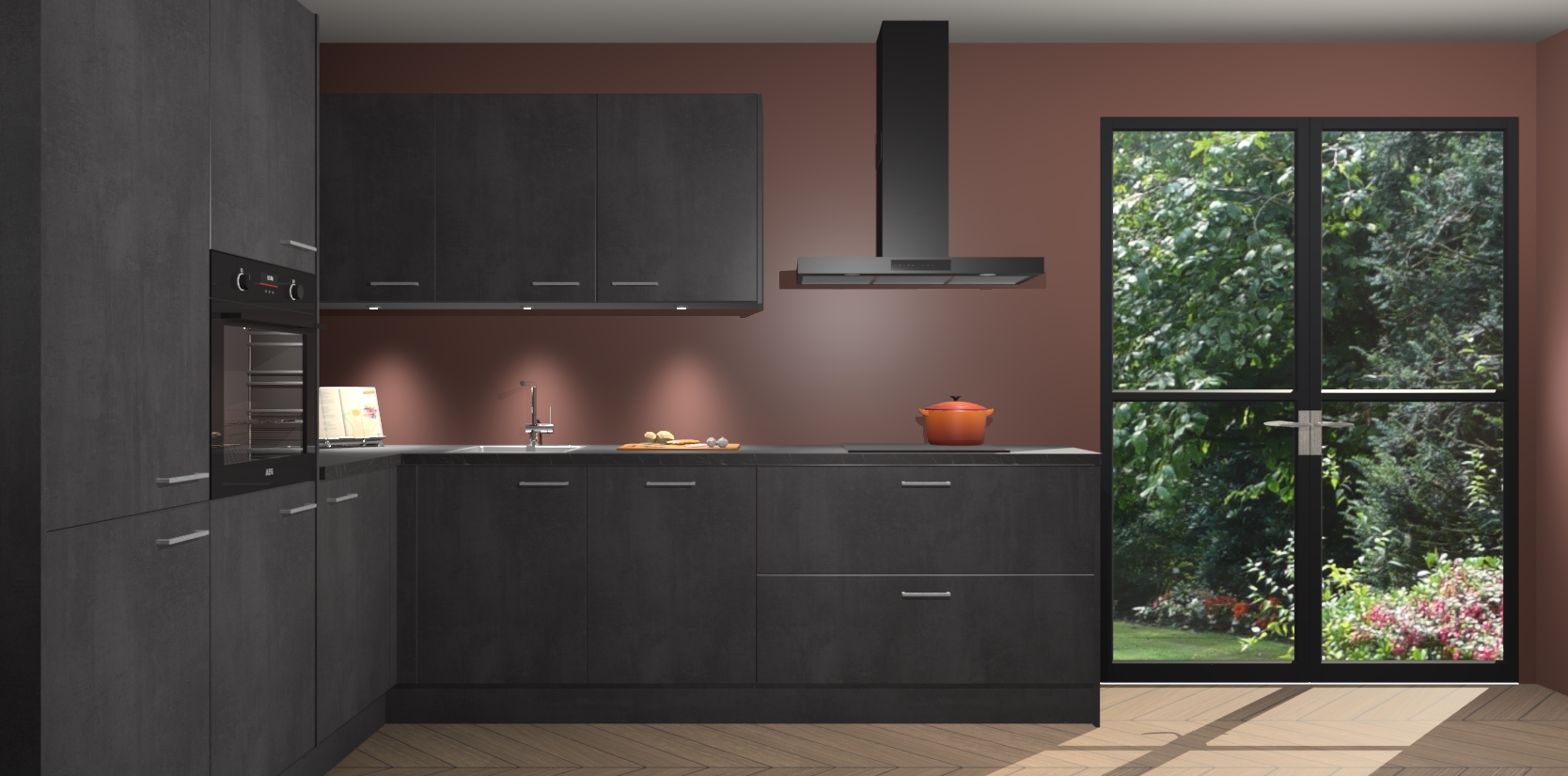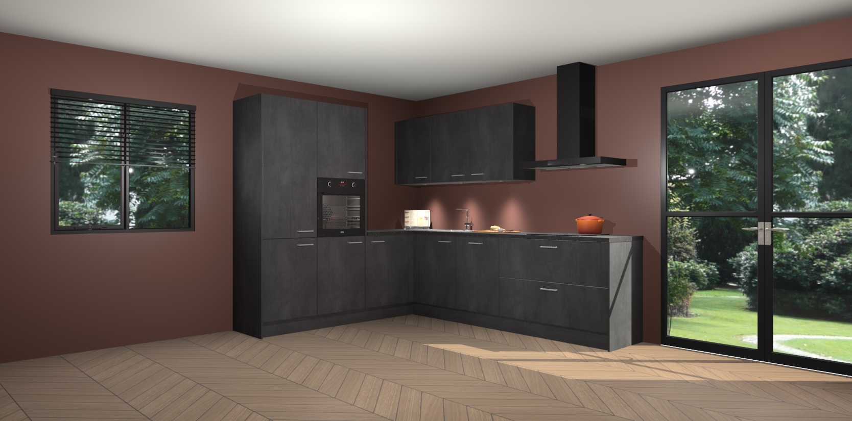 Maak kennis met de beton zwarte keuken Parla - de perfecte aanvulling voor uw moderne keuken! Ervaar tijdloos design, elegantie en een chique uitstraling met onze zwarte handgrepen, soft-close deuren en veel opbergruimte. Dit alles wordt aangeboden tegen een vaste lage prijs voor ongeëvenaarde Duitse keukenkwaliteit!