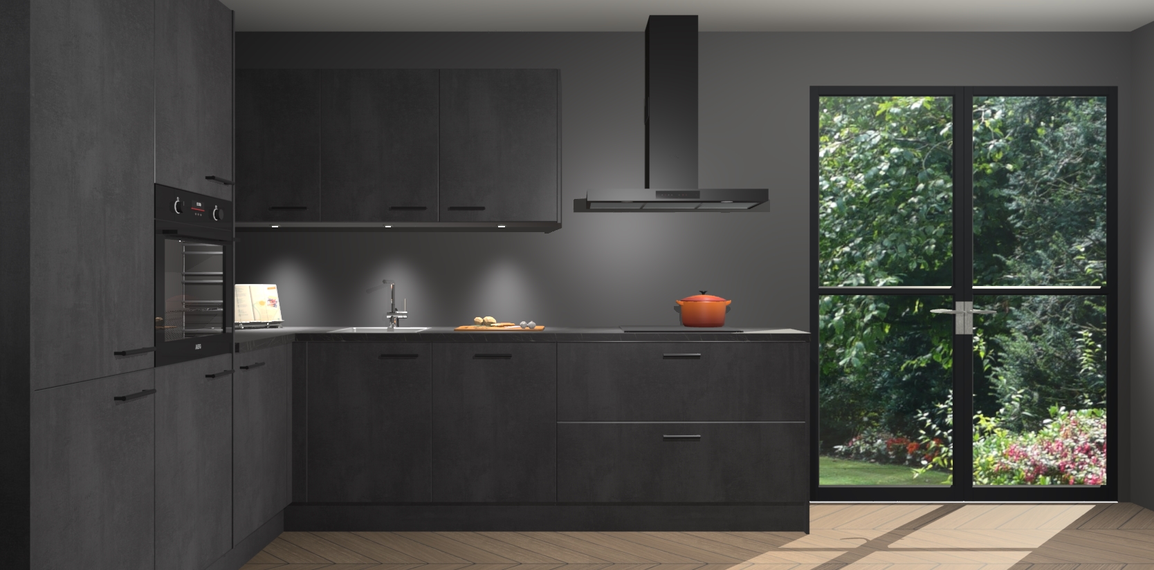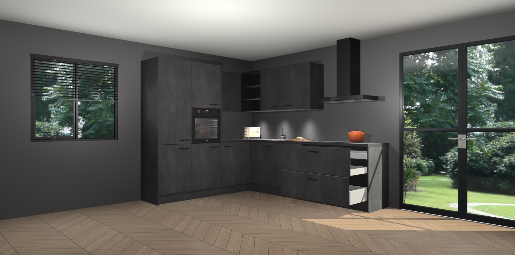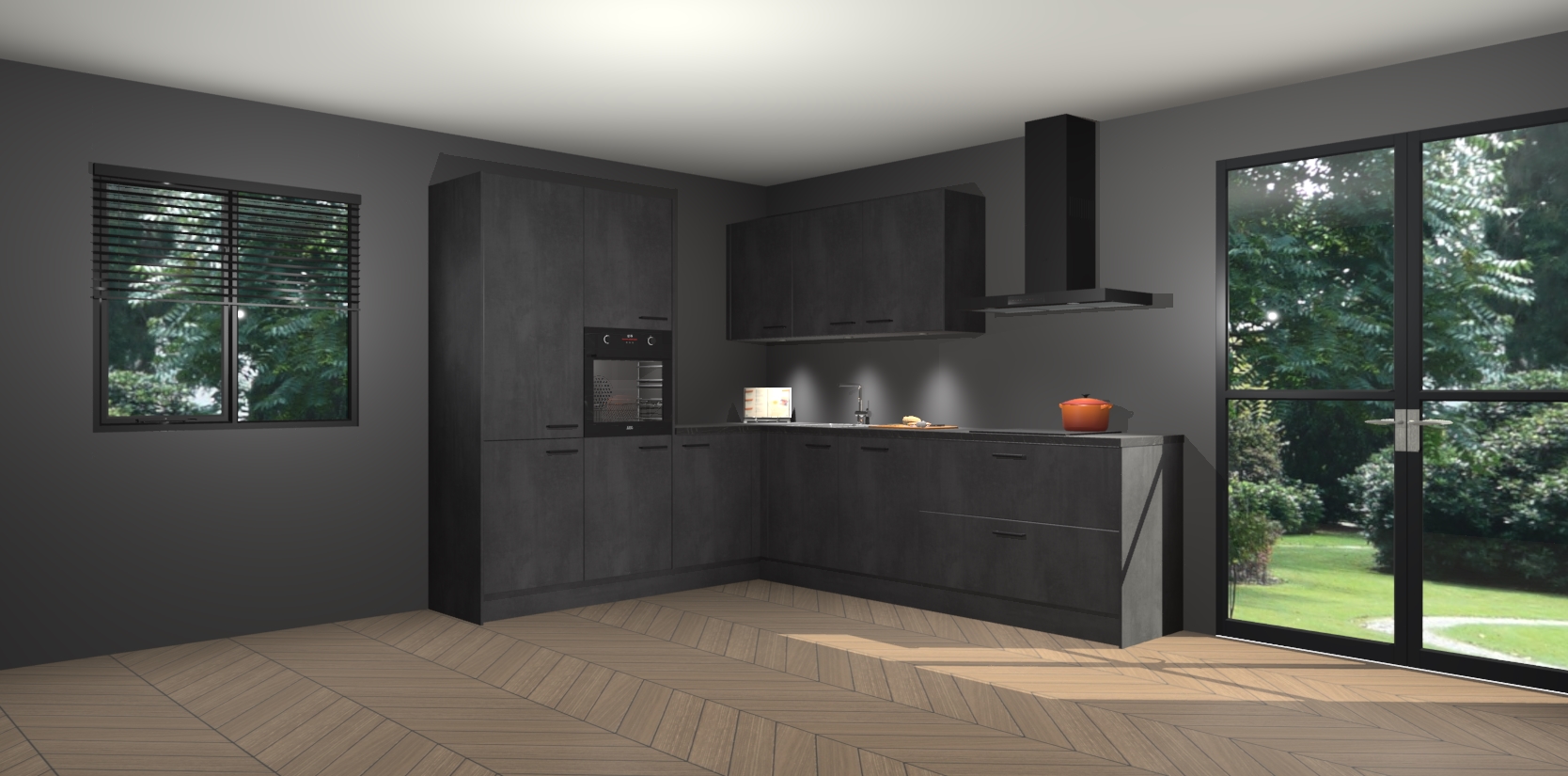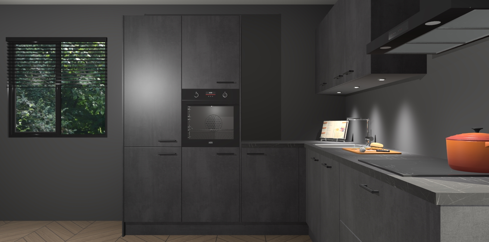 Maak kennis met de beton zwarte keuken Parla - de perfecte aanvulling voor uw moderne keuken! Ervaar tijdloos design, elegantie en een chique uitstraling met onze zwarte handgrepen, soft-close deuren en veel opbergruimte. Dit alles wordt aangeboden tegen een vaste lage prijs voor ongeëvenaarde Duitse keukenkwaliteit!