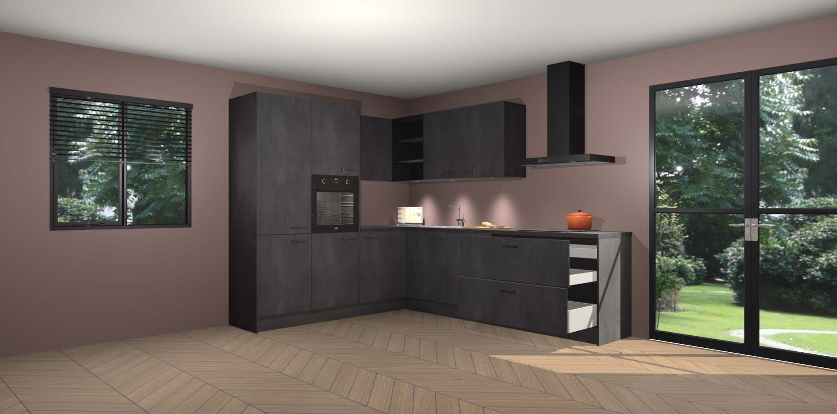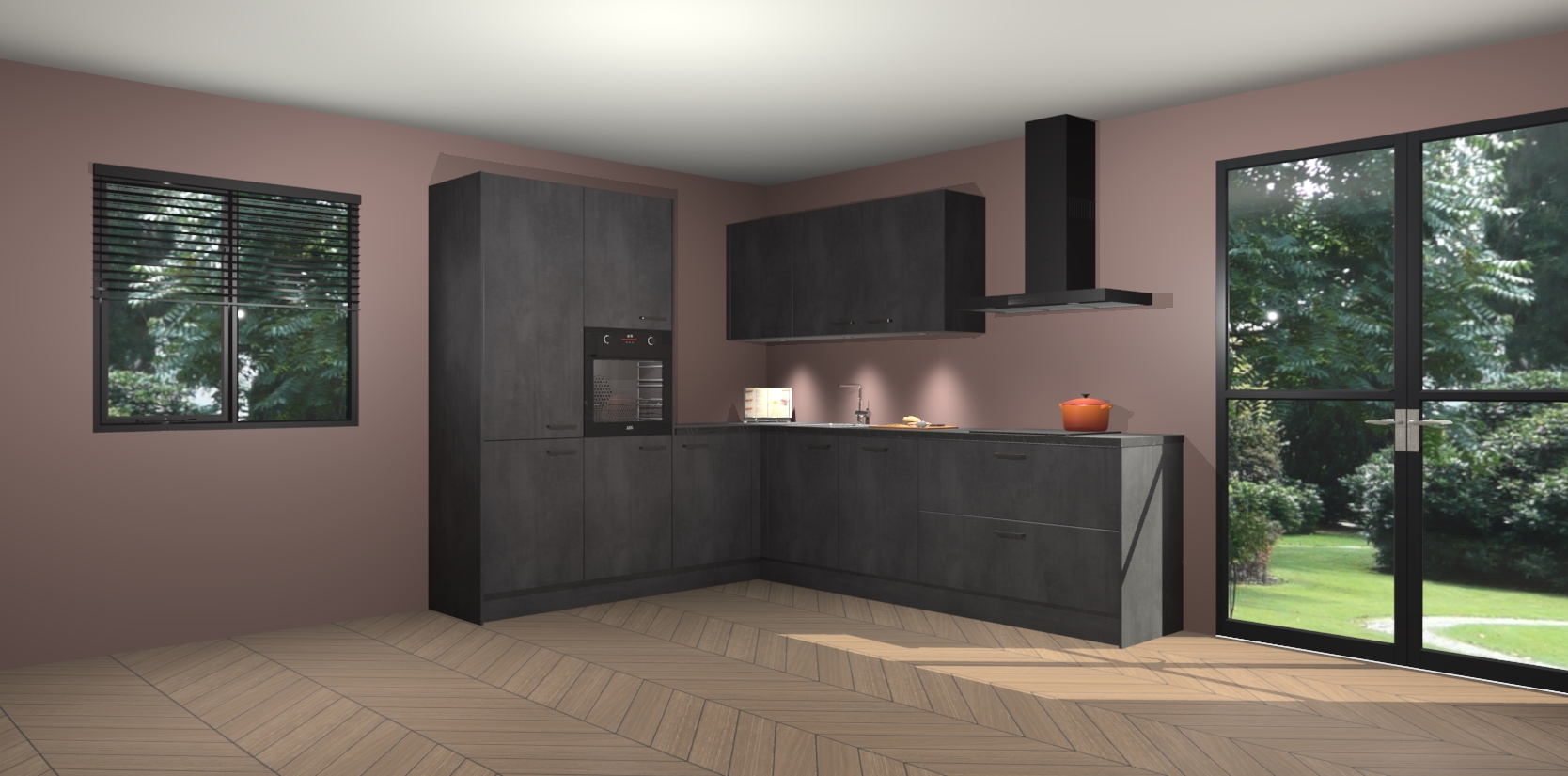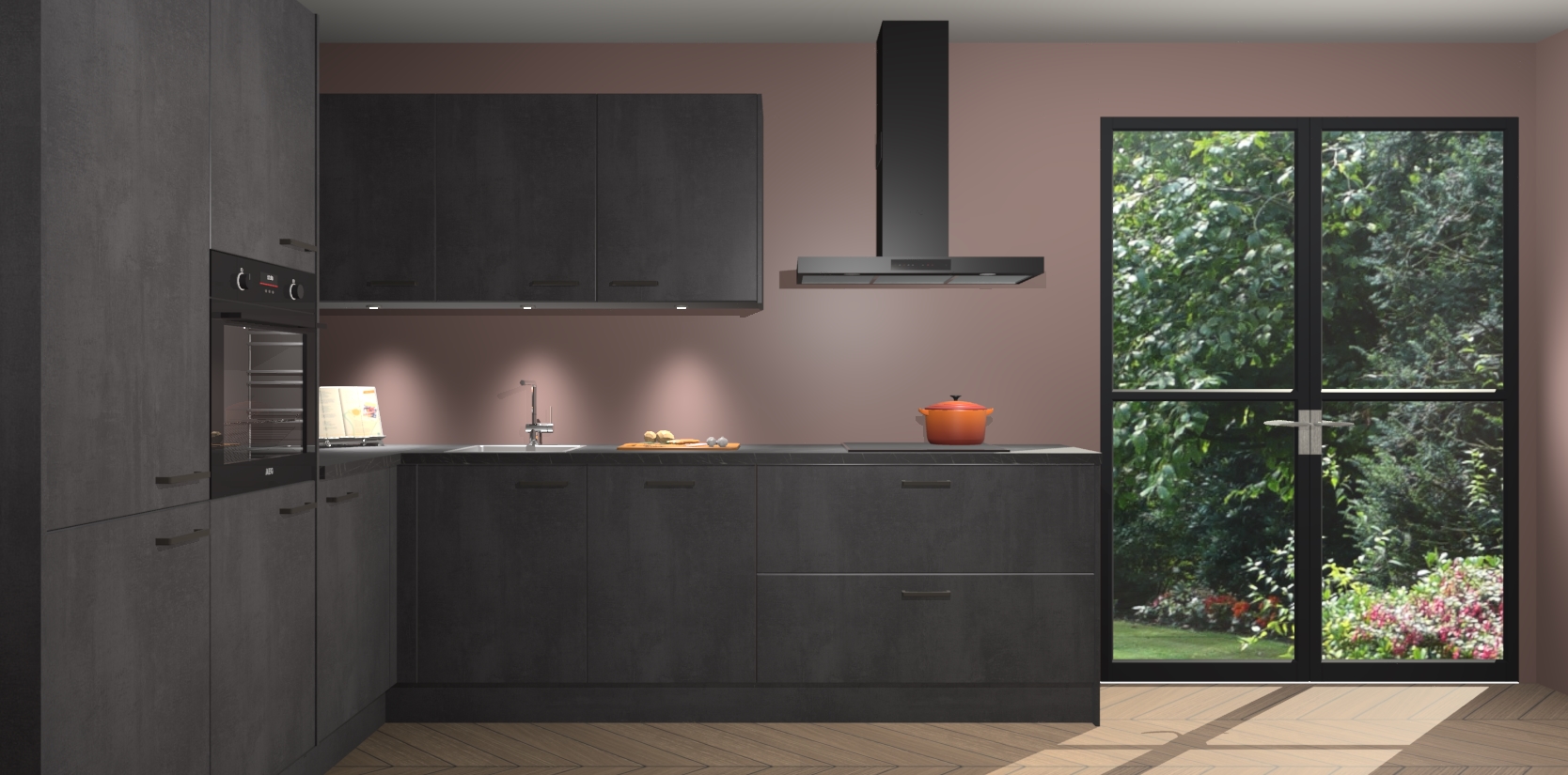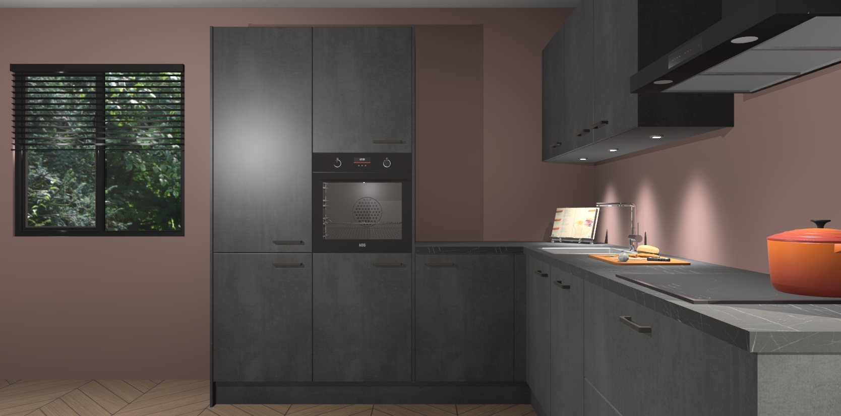 Maak kennis met de beton zwarte keuken Parla - de perfecte aanvulling voor uw moderne keuken! Ervaar tijdloos design, elegantie en een chique uitstraling met onze zwarte handgrepen, soft-close deuren en veel opbergruimte. Dit alles wordt aangeboden tegen een vaste lage prijs voor ongeëvenaarde Duitse keukenkwaliteit!