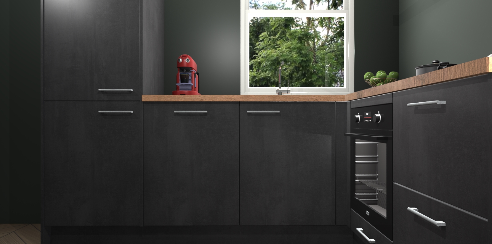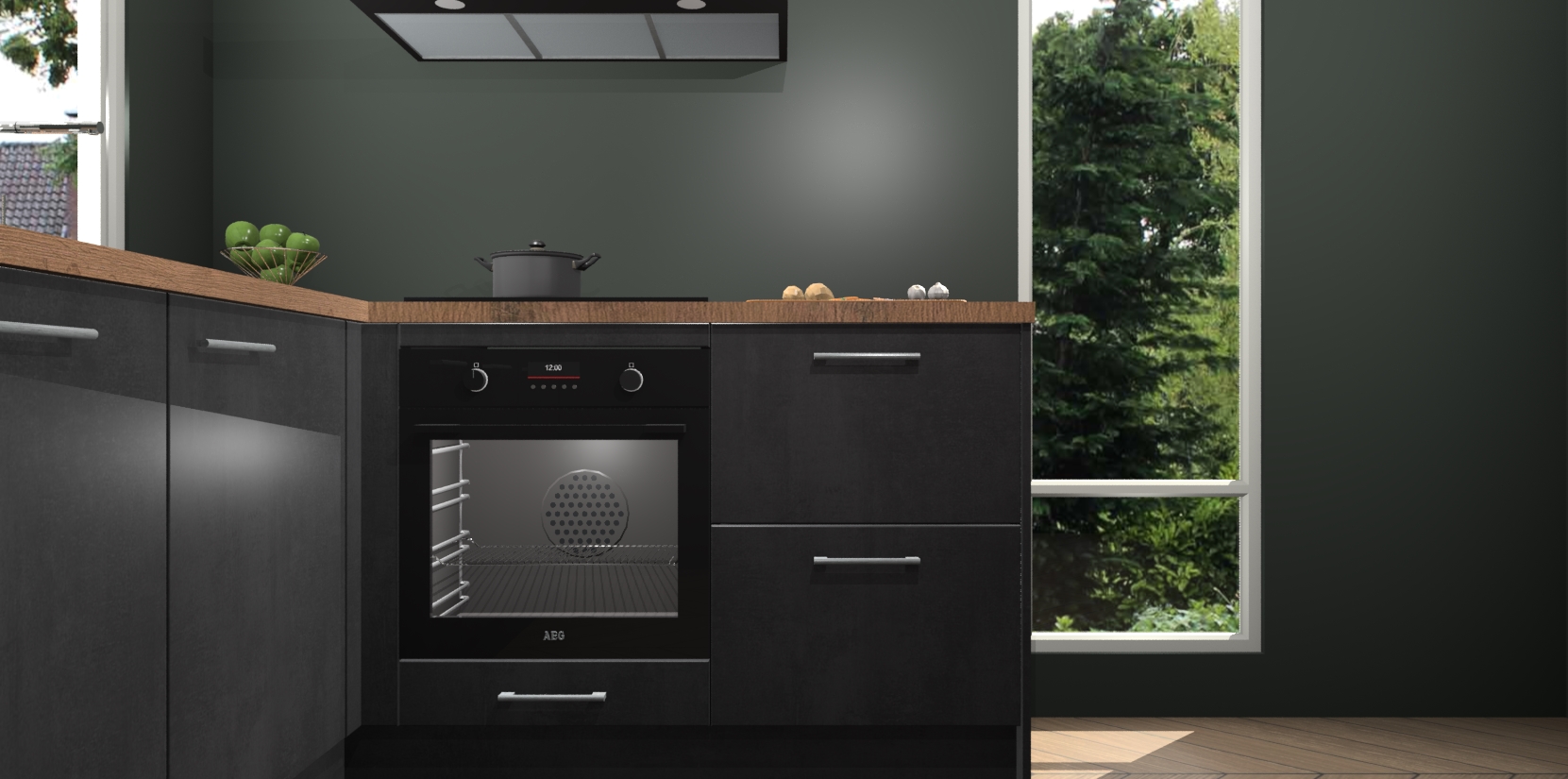 De Beton Zwarte keuken Phuket heeft alles wat u maar kunt wensen. Niet alleen zijn er softclose deuren, maar ook 5 ingebouwde apparaten: een oven, inductiekookplaat, afzuigkap, vaatwasser en koelkast - waarbij u later gemakkelijk naar het AEG merk, van inductiekookplaat naar kookplaat met geïntegreerde afzuiging of van oven naar combimagnetron kunt upgraden. Dat alles tegen een vast laag tarief! Bovendien geeft de Beton Zwarte keuken Phuket supersnelle levering van 7 weken. Echt iets voor u als u er niet op wilt wachten om het resultaat te zien in eigen keuken!