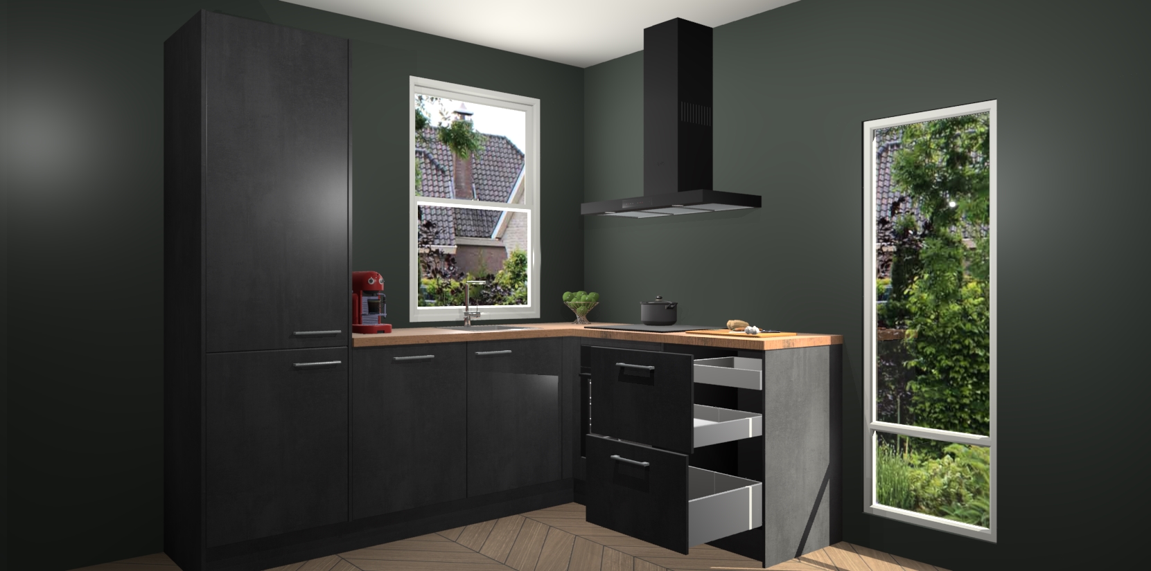 De prachtige Beton Zwarte keuken Phuket is de perfecte keuze als u op zoek bent naar een moderne hoekkeuken met alle luxe en comfort die u kunt verwachten! De uitstraling in het houtlook-design draagt bij aan de warme sfeer die u nu al voelt wanneer u er naar kijkt. Heeft u genoeg van ouderwetse keukens? Probeer dan direct deze moderne, mooie hoekkeukens en laat iedereen verbluft achter!