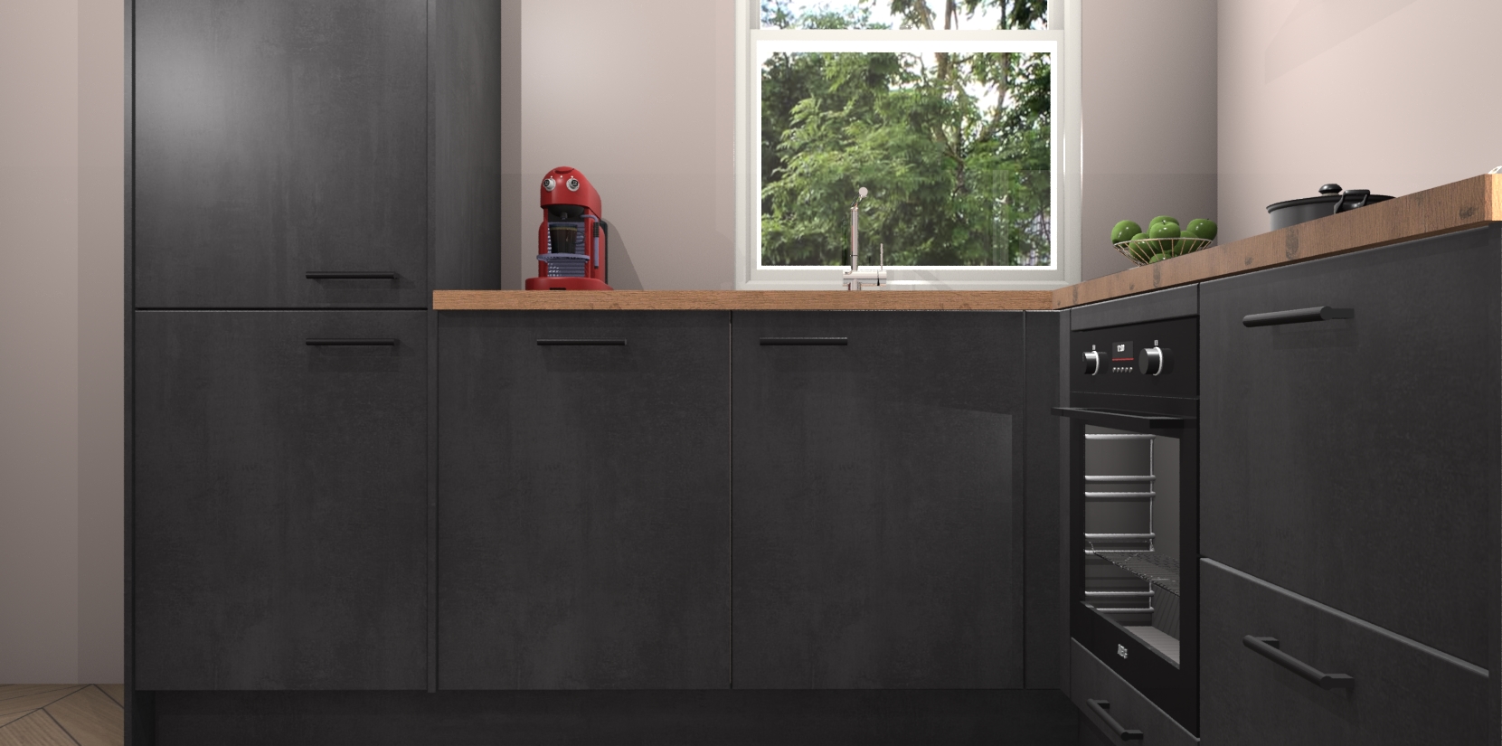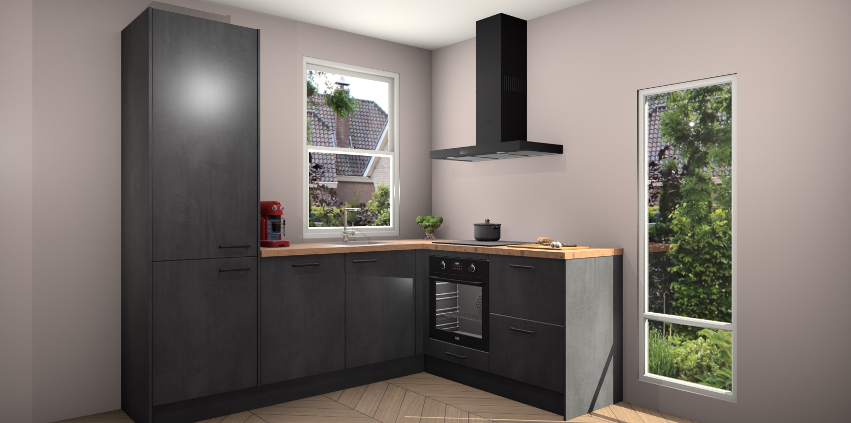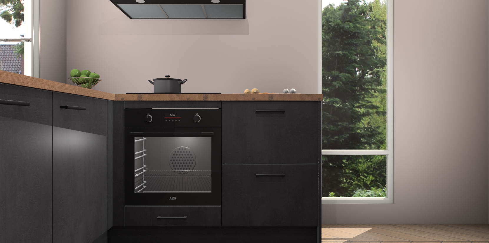 De Beton Zwarte keuken Phuket heeft alles wat u maar kunt wensen. Niet alleen zijn er softclose deuren, maar ook 5 ingebouwde apparaten: een oven, inductiekookplaat, afzuigkap, vaatwasser en koelkast - waarbij u later gemakkelijk naar het AEG merk, van inductiekookplaat naar kookplaat met geïntegreerde afzuiging of van oven naar combimagnetron kunt upgraden. Dat alles tegen een vast laag tarief! Bovendien geeft de Beton Zwarte keuken Phuket supersnelle levering van 7 weken. Echt iets voor u als u er niet op wilt wachten om het resultaat te zien in eigen keuken!