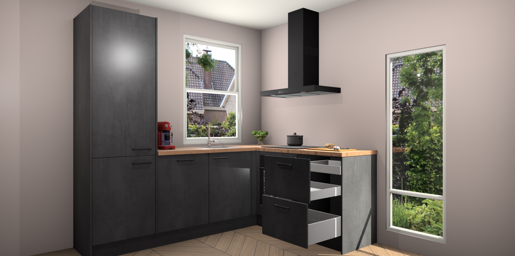 De prachtige Beton Zwarte keuken Phuket is de perfecte keuze als u op zoek bent naar een moderne hoekkeuken met alle luxe en comfort die u kunt verwachten! De uitstraling in het houtlook-design draagt bij aan de warme sfeer die u nu al voelt wanneer u er naar kijkt. Heeft u genoeg van ouderwetse keukens? Probeer dan direct deze moderne, mooie hoekkeukens en laat iedereen verbluft achter!