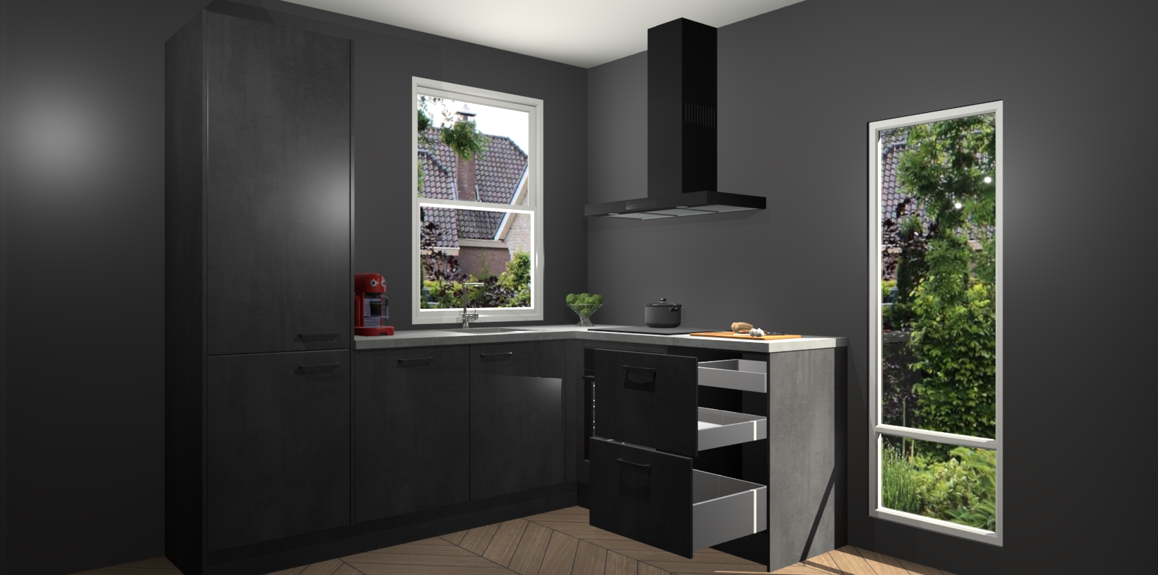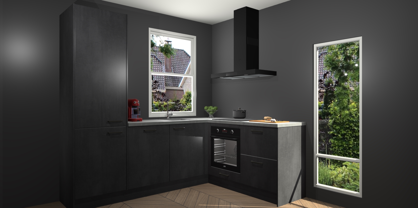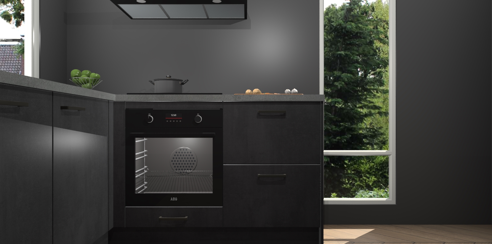 De Beton Zwarte keuken Phuket heeft alles wat u maar kunt wensen. Niet alleen zijn er softclose deuren, maar ook 5 ingebouwde apparaten: een oven, inductiekookplaat, afzuigkap, vaatwasser en koelkast - waarbij u later gemakkelijk naar het AEG merk, van inductiekookplaat naar kookplaat met geïntegreerde afzuiging of van oven naar combimagnetron kunt upgraden. Dat alles tegen een vast laag tarief! Bovendien geeft de Beton Zwarte keuken Phuket supersnelle levering van 7 weken. Echt iets voor u als u er niet op wilt wachten om het resultaat te zien in eigen keuken!