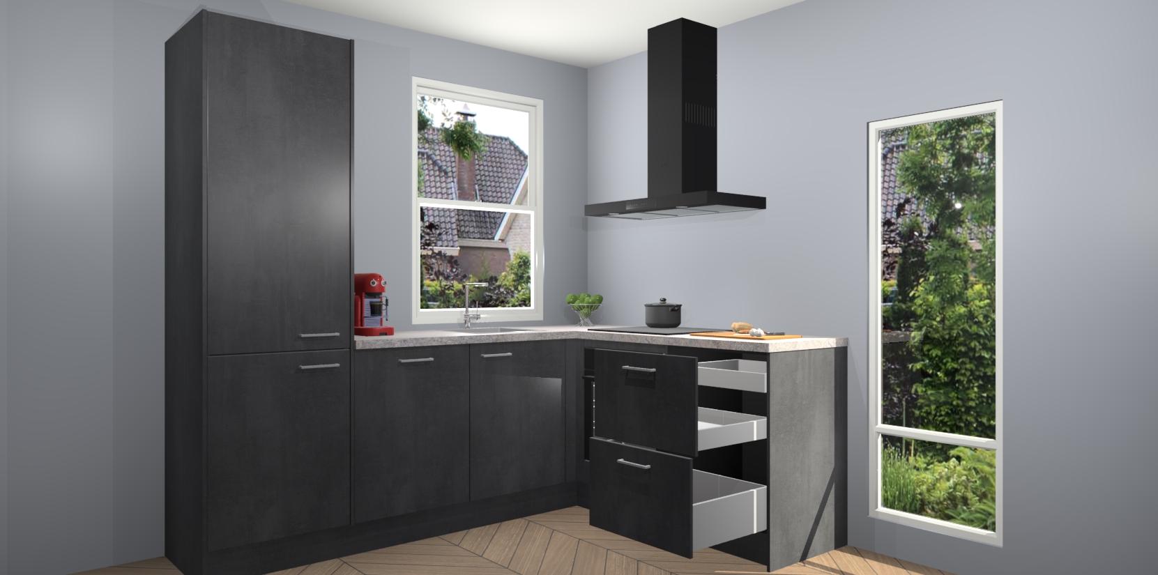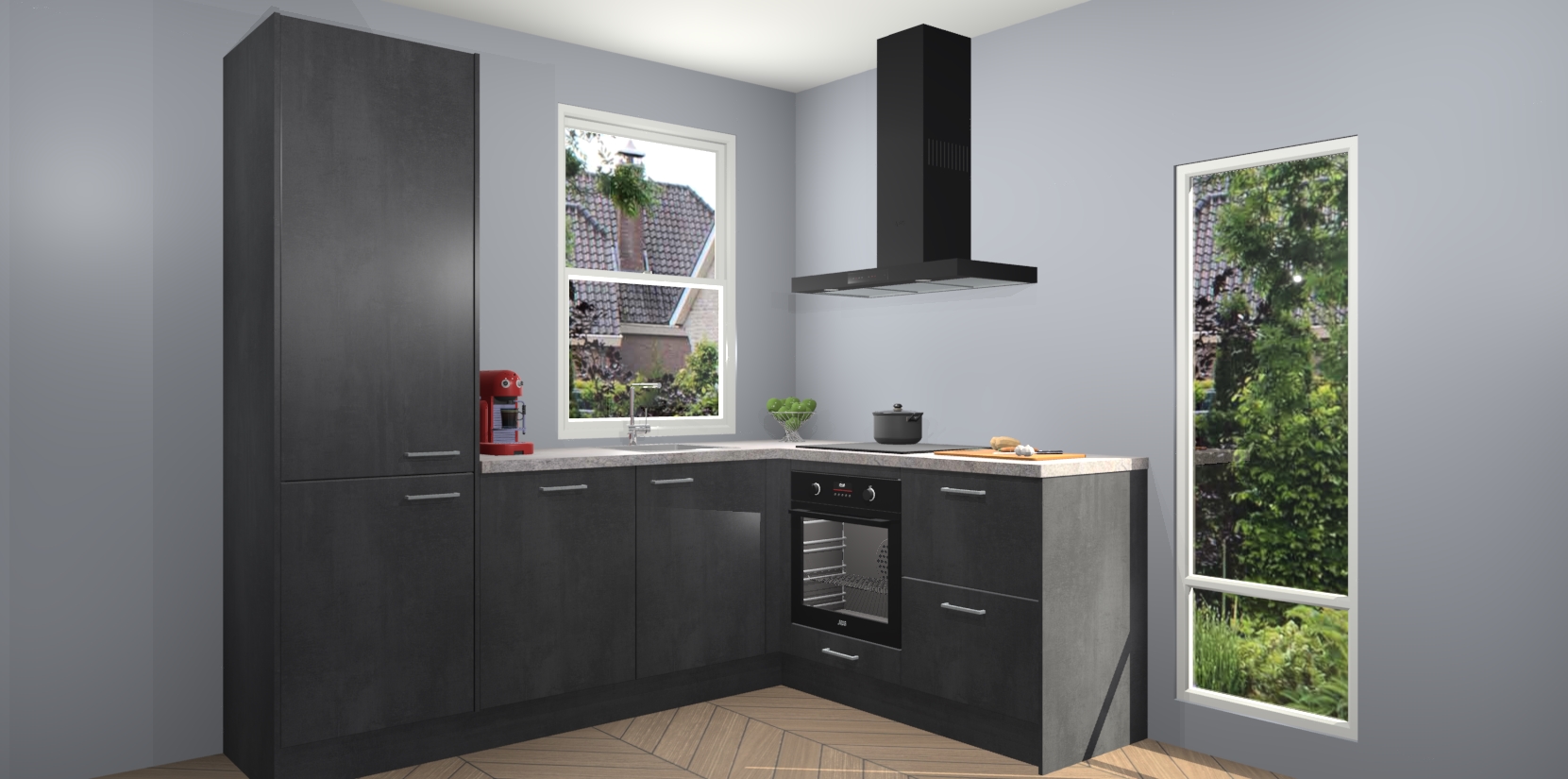De prachtige Beton Zwarte keuken Phuket is de perfecte keuze als u op zoek bent naar een moderne hoekkeuken met alle luxe en comfort die u kunt verwachten! De uitstraling in het houtlook-design draagt bij aan de warme sfeer die u nu al voelt wanneer u er naar kijkt. Heeft u genoeg van ouderwetse keukens? Probeer dan direct deze moderne, mooie hoekkeukens en laat iedereen verbluft achter!