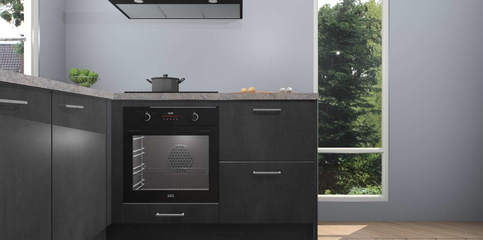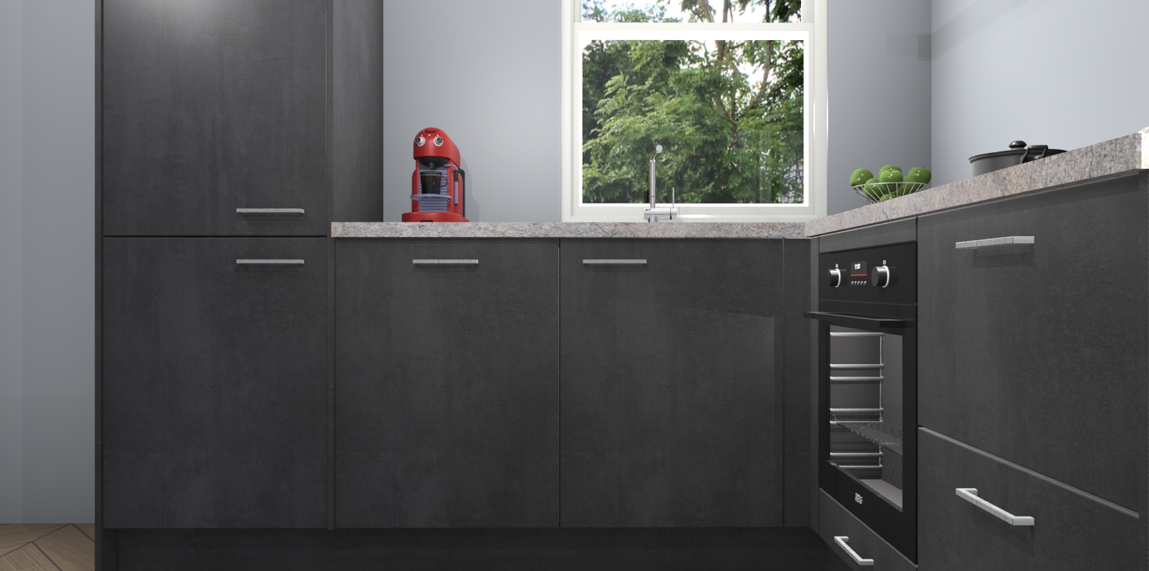 De Beton Zwarte keuken Phuket heeft alles wat u maar kunt wensen. Niet alleen zijn er softclose deuren, maar ook 5 ingebouwde apparaten: een oven, inductiekookplaat, afzuigkap, vaatwasser en koelkast - waarbij u later gemakkelijk naar het AEG merk, van inductiekookplaat naar kookplaat met geïntegreerde afzuiging of van oven naar combimagnetron kunt upgraden. Dat alles tegen een vast laag tarief! Bovendien geeft de Beton Zwarte keuken Phuket supersnelle levering van 7 weken. Echt iets voor u als u er niet op wilt wachten om het resultaat te zien in eigen keuken!