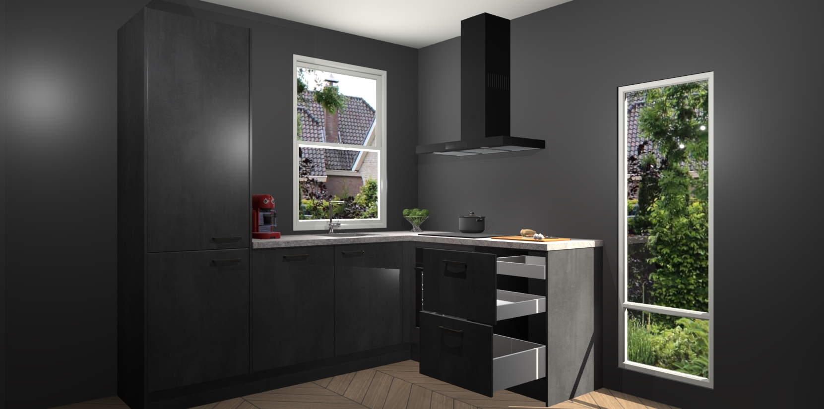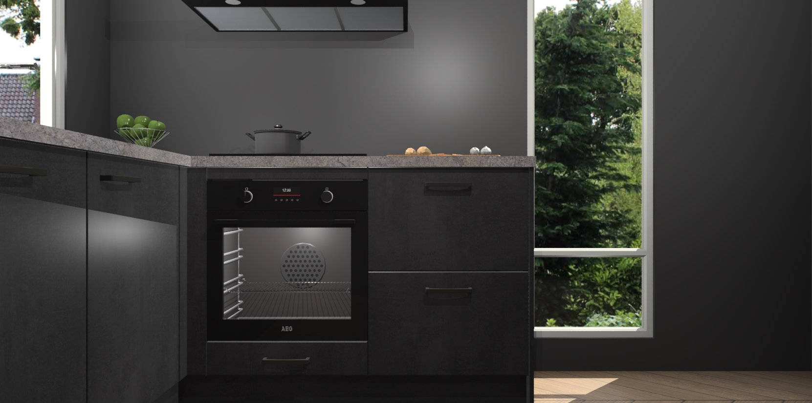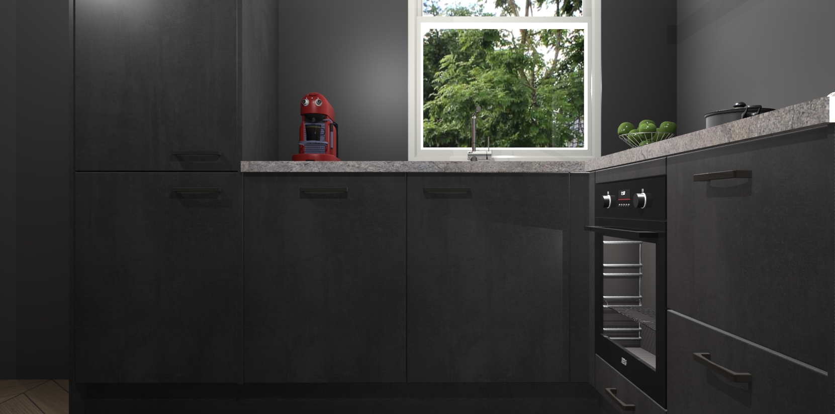 De Beton Zwarte keuken Phuket heeft alles wat u maar kunt wensen. Niet alleen zijn er softclose deuren, maar ook 5 ingebouwde apparaten: een oven, inductiekookplaat, afzuigkap, vaatwasser en koelkast - waarbij u later gemakkelijk naar het AEG merk, van inductiekookplaat naar kookplaat met geïntegreerde afzuiging of van oven naar combimagnetron kunt upgraden. Dat alles tegen een vast laag tarief! Bovendien geeft de Beton Zwarte keuken Phuket supersnelle levering van 7 weken. Echt iets voor u als u er niet op wilt wachten om het resultaat te zien in eigen keuken!