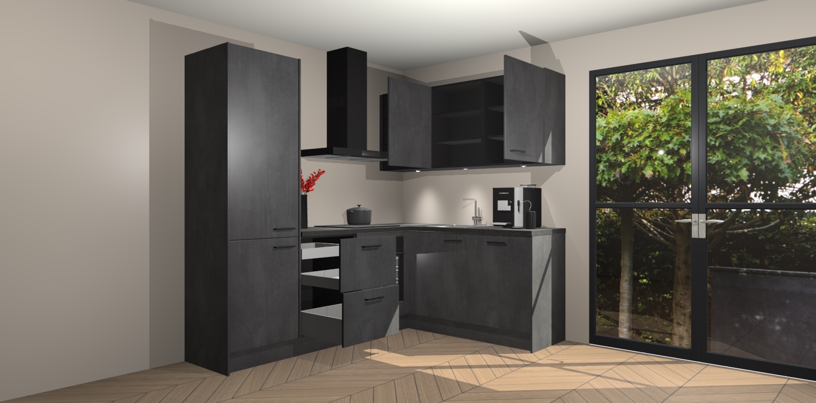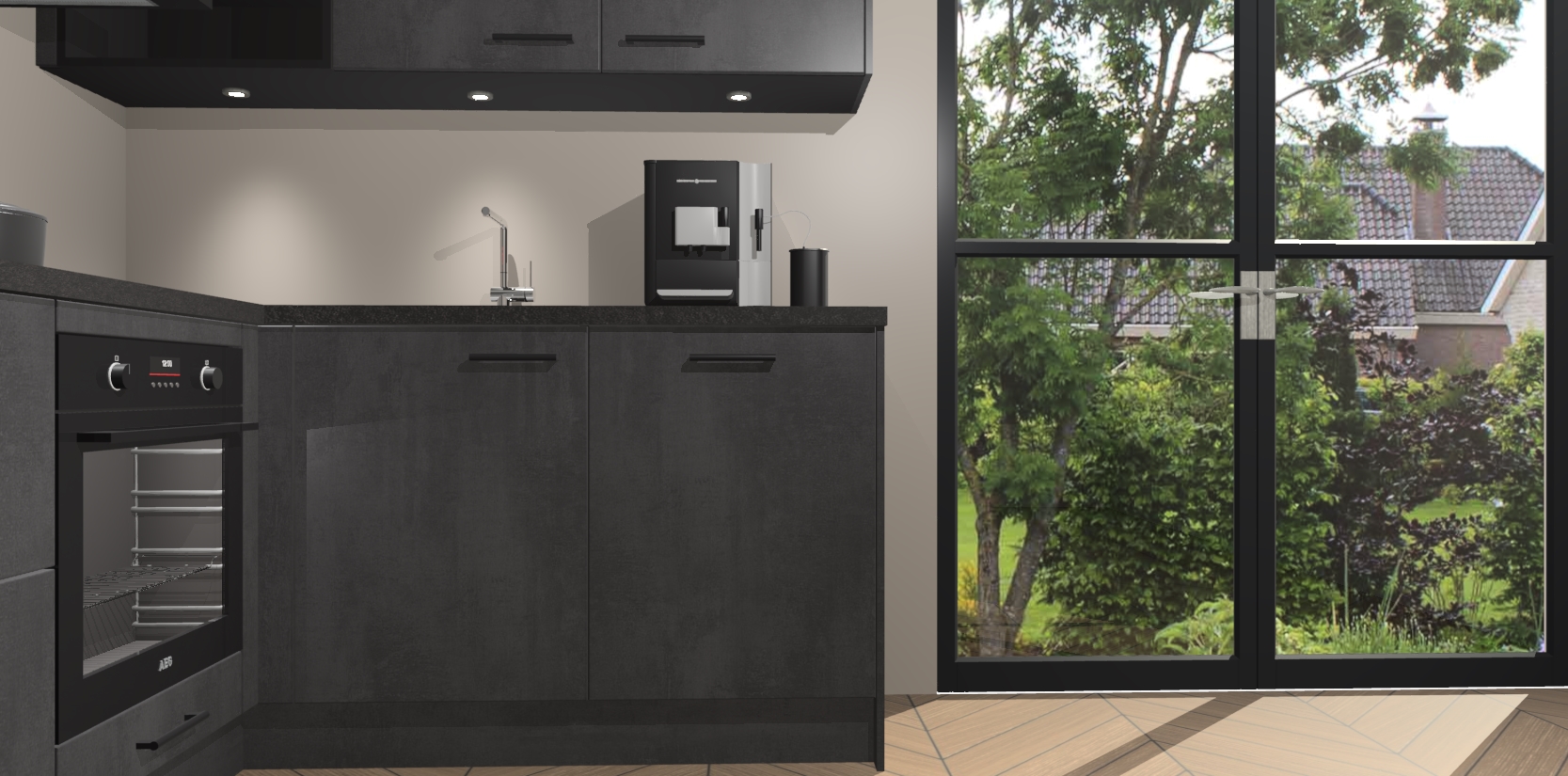 Wauw, dit is de Beton Zwarte keuken Pilsen! U kunt gerust zeggen dat u elegantie combineert met functionaliteit met deze keuken. Met een modern en chique ontwerp is de keuken precies wat u nodig heeft om uw ruimte te verfraaien. De binnenzijde van de kasten is in dezelfde donkere kleur als de buitenzijde voor een uniforme look, compleet met softclose-kasten die stil sluiten.