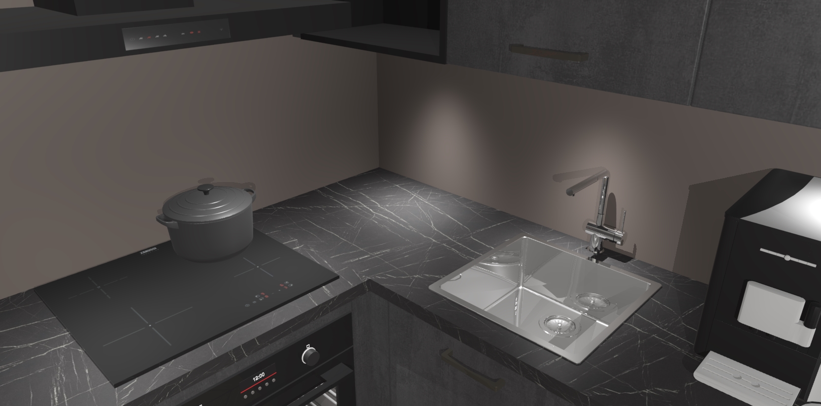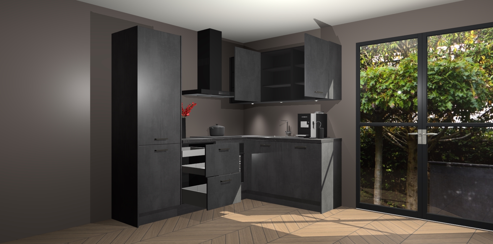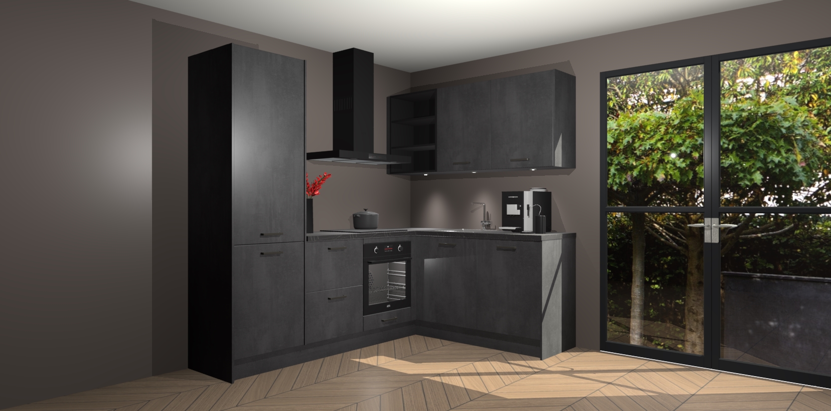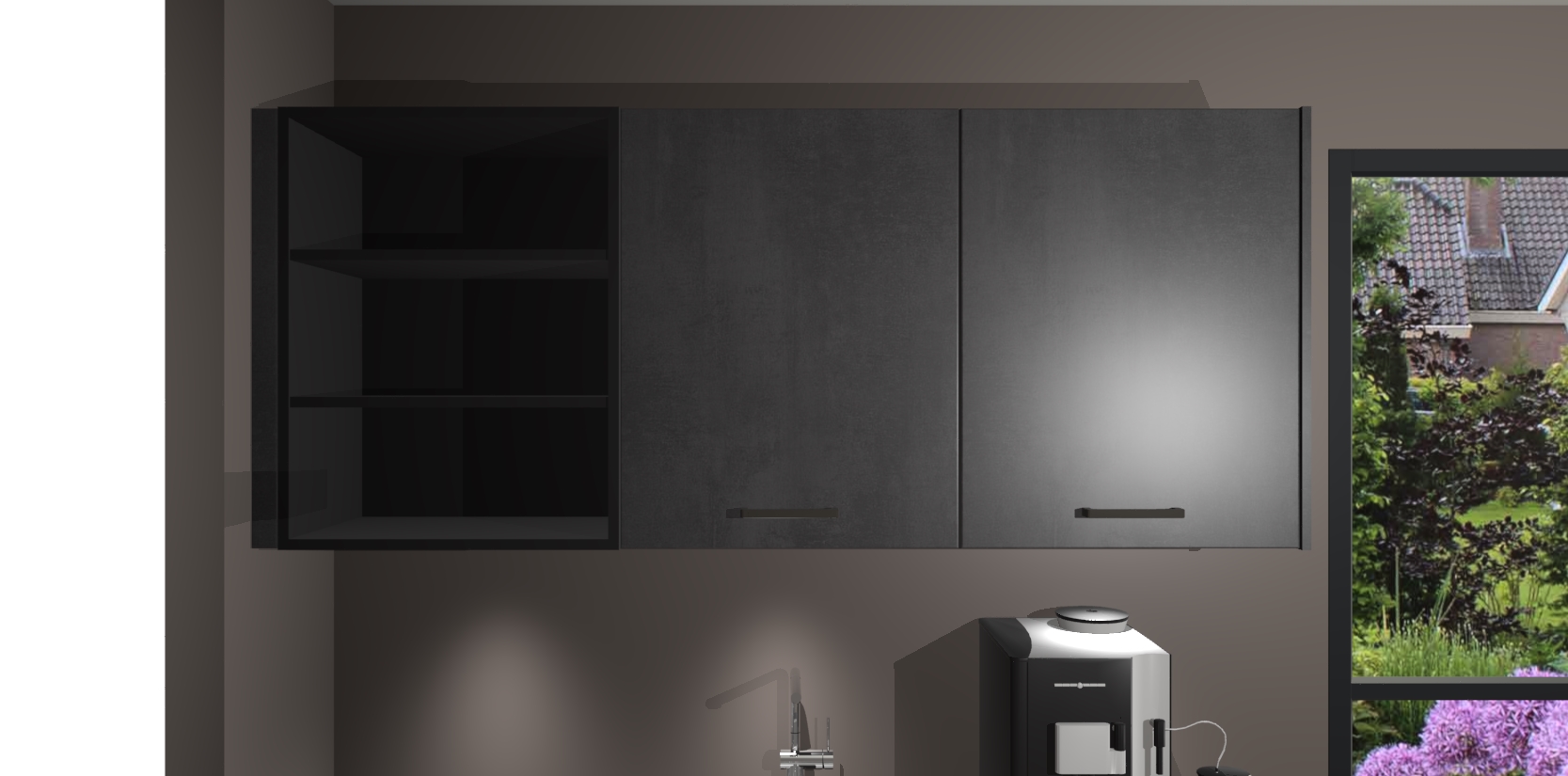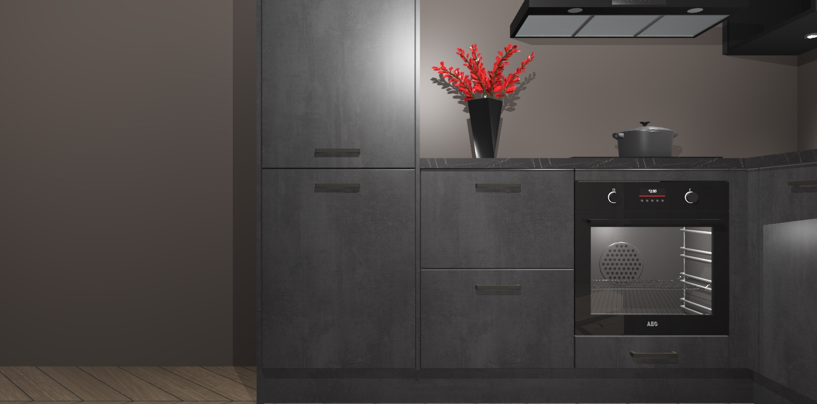 Wauw, dit is de Beton Zwarte keuken Pilsen! U kunt gerust zeggen dat u elegantie combineert met functionaliteit met deze keuken. Met een modern en chique ontwerp is de keuken precies wat u nodig heeft om uw ruimte te verfraaien. De binnenzijde van de kasten is in dezelfde donkere kleur als de buitenzijde voor een uniforme look, compleet met softclose-kasten die stil sluiten.