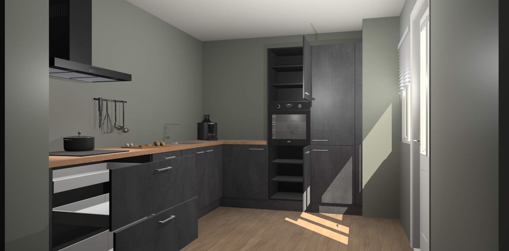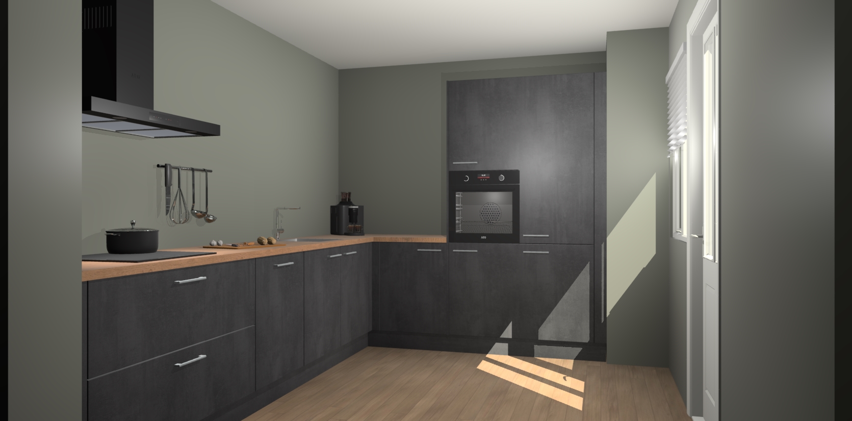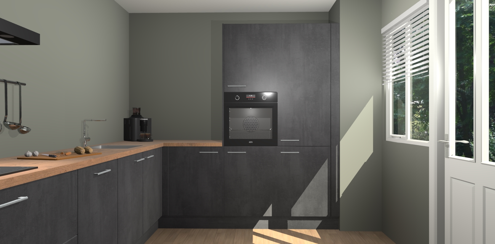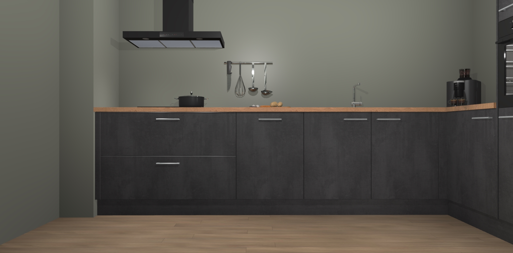 Welkom bij de Beton Zwarte keuken Portland. Deze prachtige keuken zal de komende jaren het middelpunt van de belangstelling in uw huis zijn. Uitgerust met vijf inbouwapparaten komt u nooit kookgereedschap tekort. Bovendien geeft de warme houtlook elke ruimte een uitnodigende en tijdloze uitstraling.