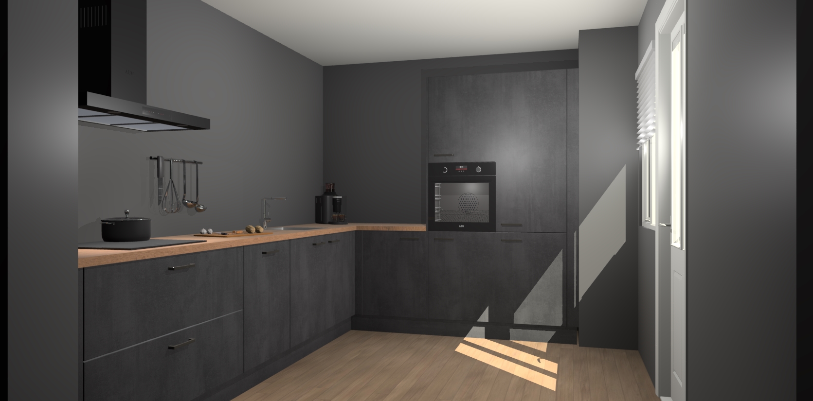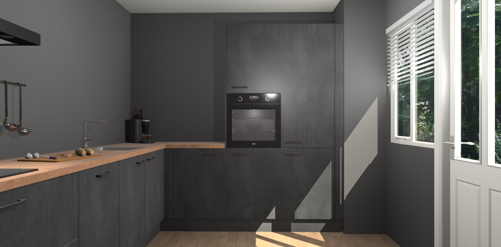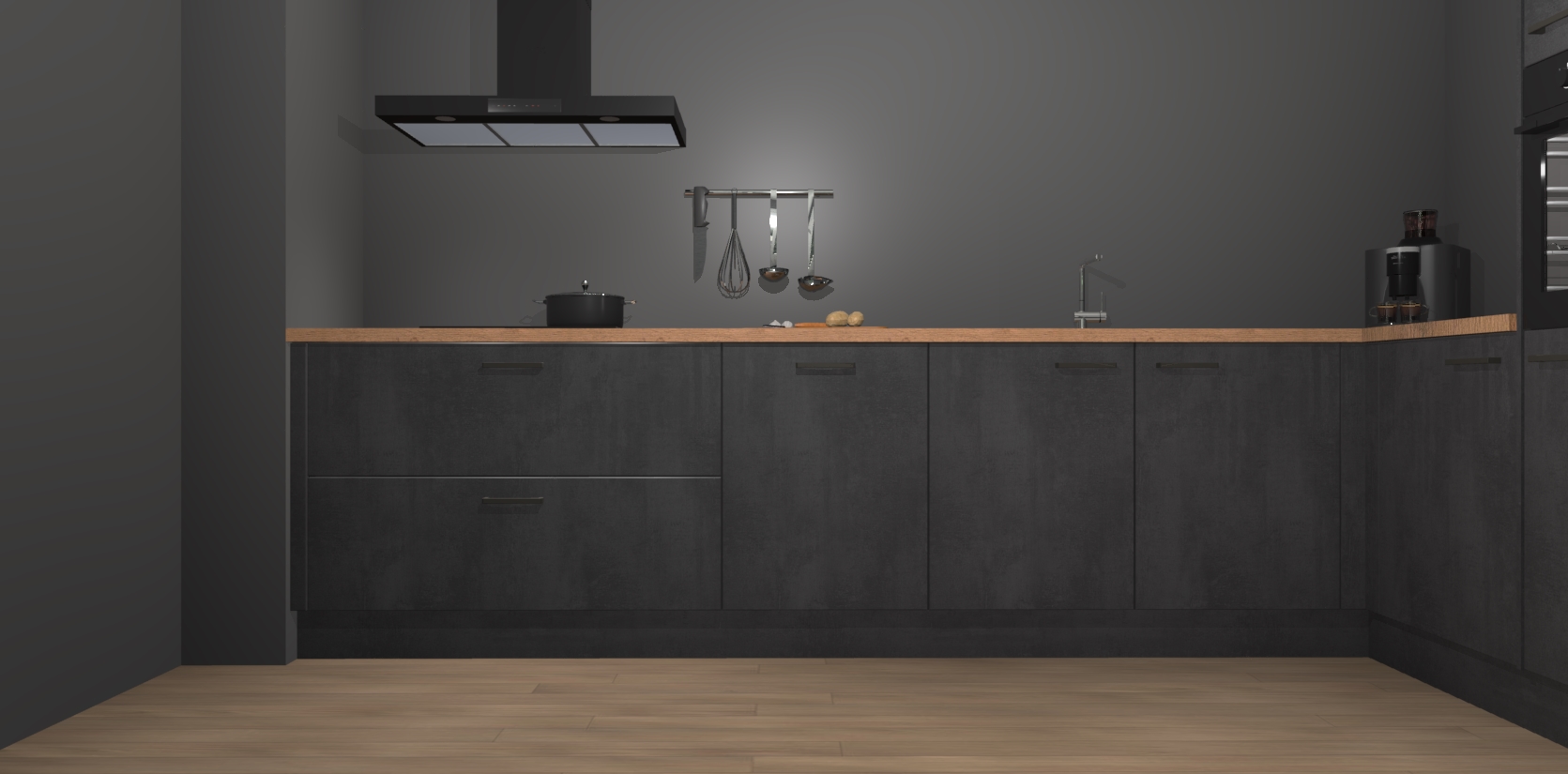 Welkom bij de Beton Zwarte keuken Portland. Deze prachtige keuken zal de komende jaren het middelpunt van de belangstelling in uw huis zijn. Uitgerust met vijf inbouwapparaten komt u nooit kookgereedschap tekort. Bovendien geeft de warme houtlook elke ruimte een uitnodigende en tijdloze uitstraling.