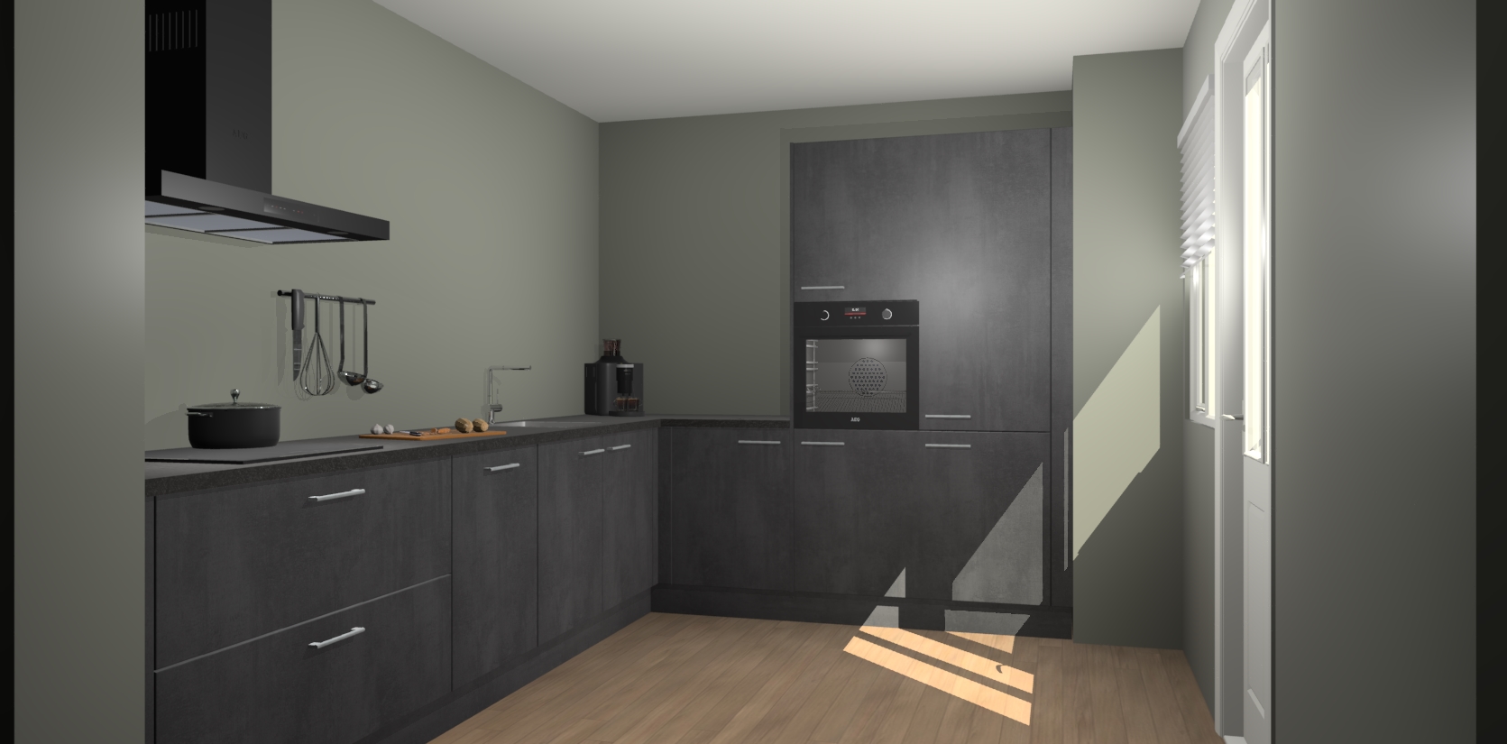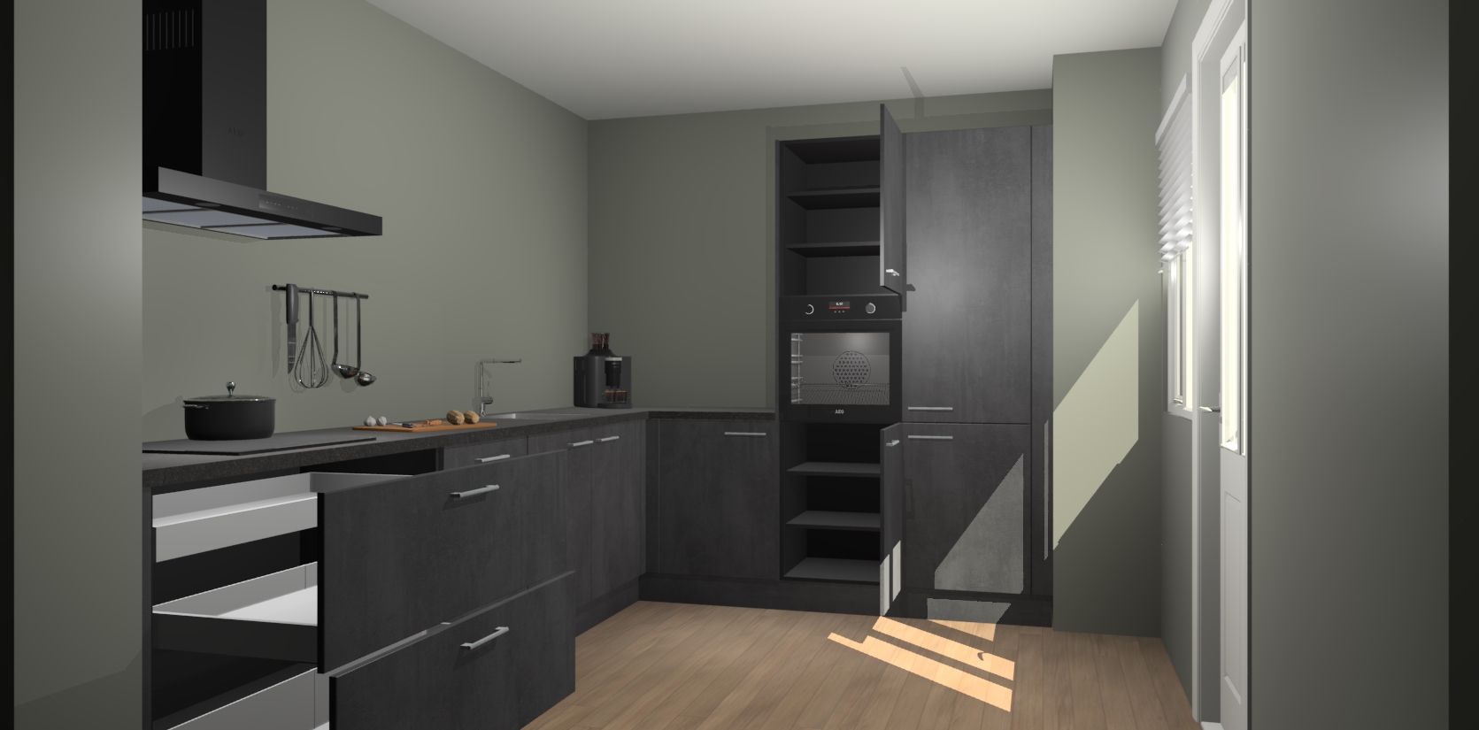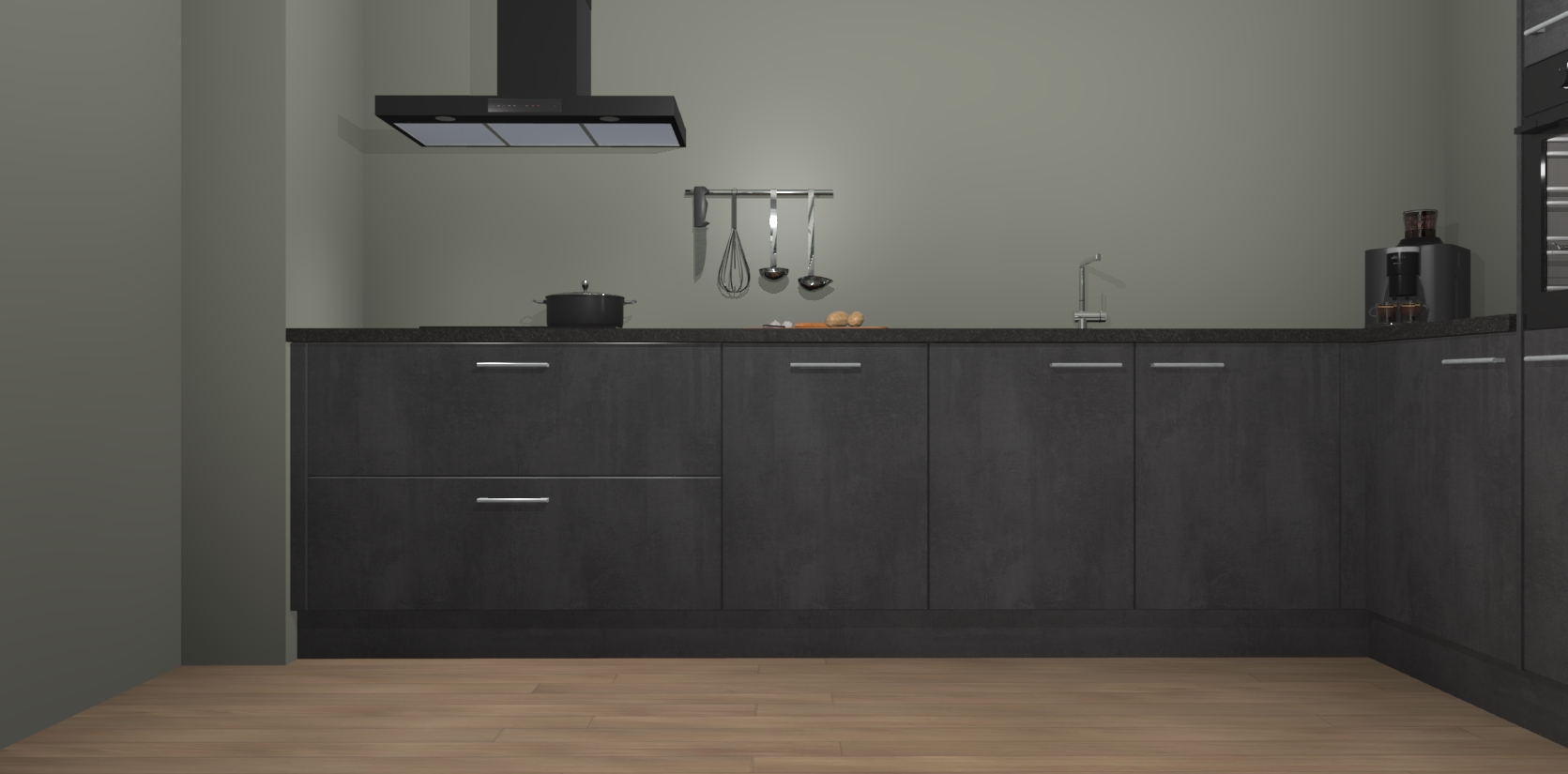 Welkom bij de Beton Zwarte keuken Portland. Deze prachtige keuken zal de komende jaren het middelpunt van de belangstelling in uw huis zijn. Uitgerust met vijf inbouwapparaten komt u nooit kookgereedschap tekort. Bovendien geeft de warme houtlook elke ruimte een uitnodigende en tijdloze uitstraling.