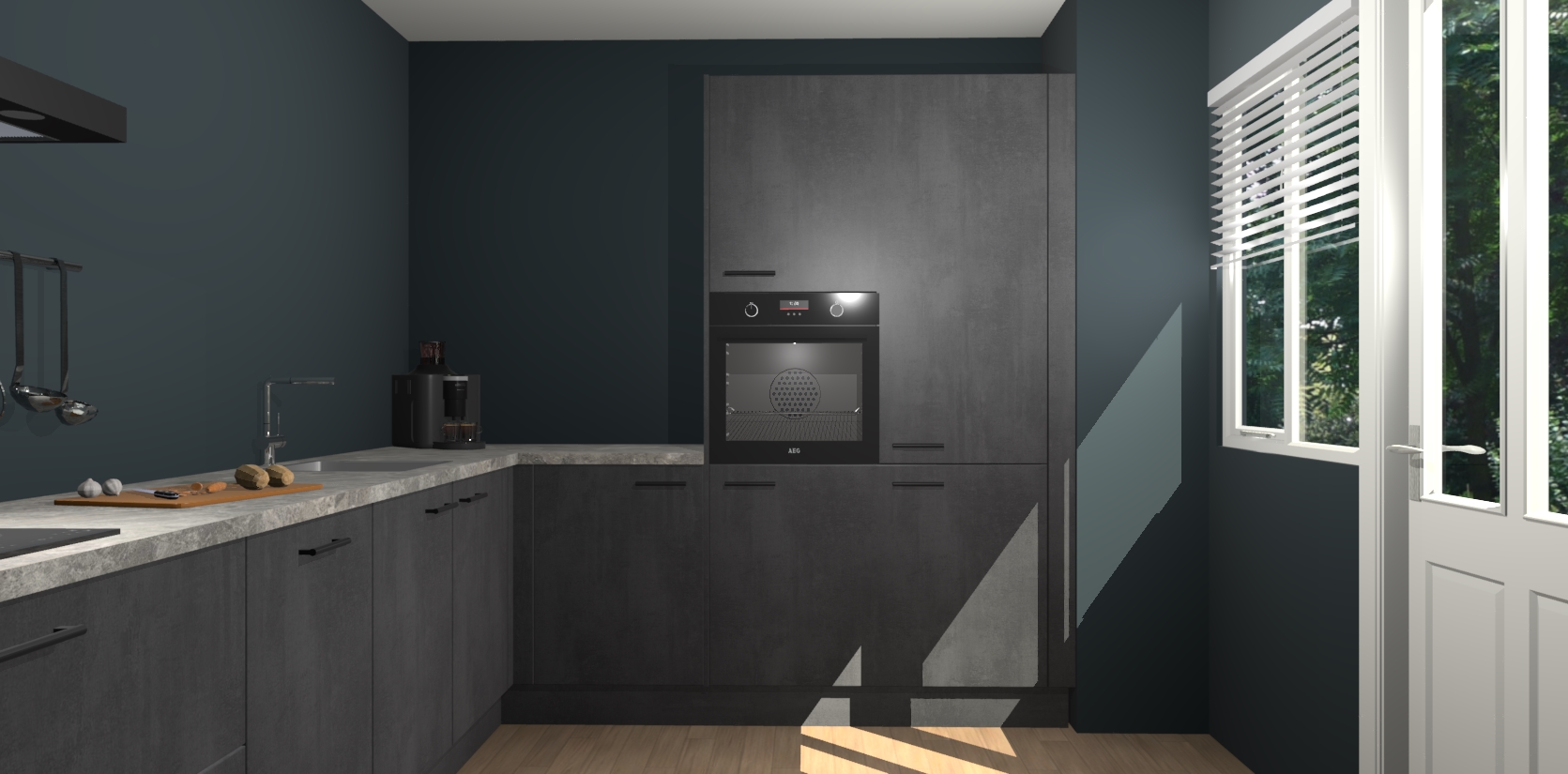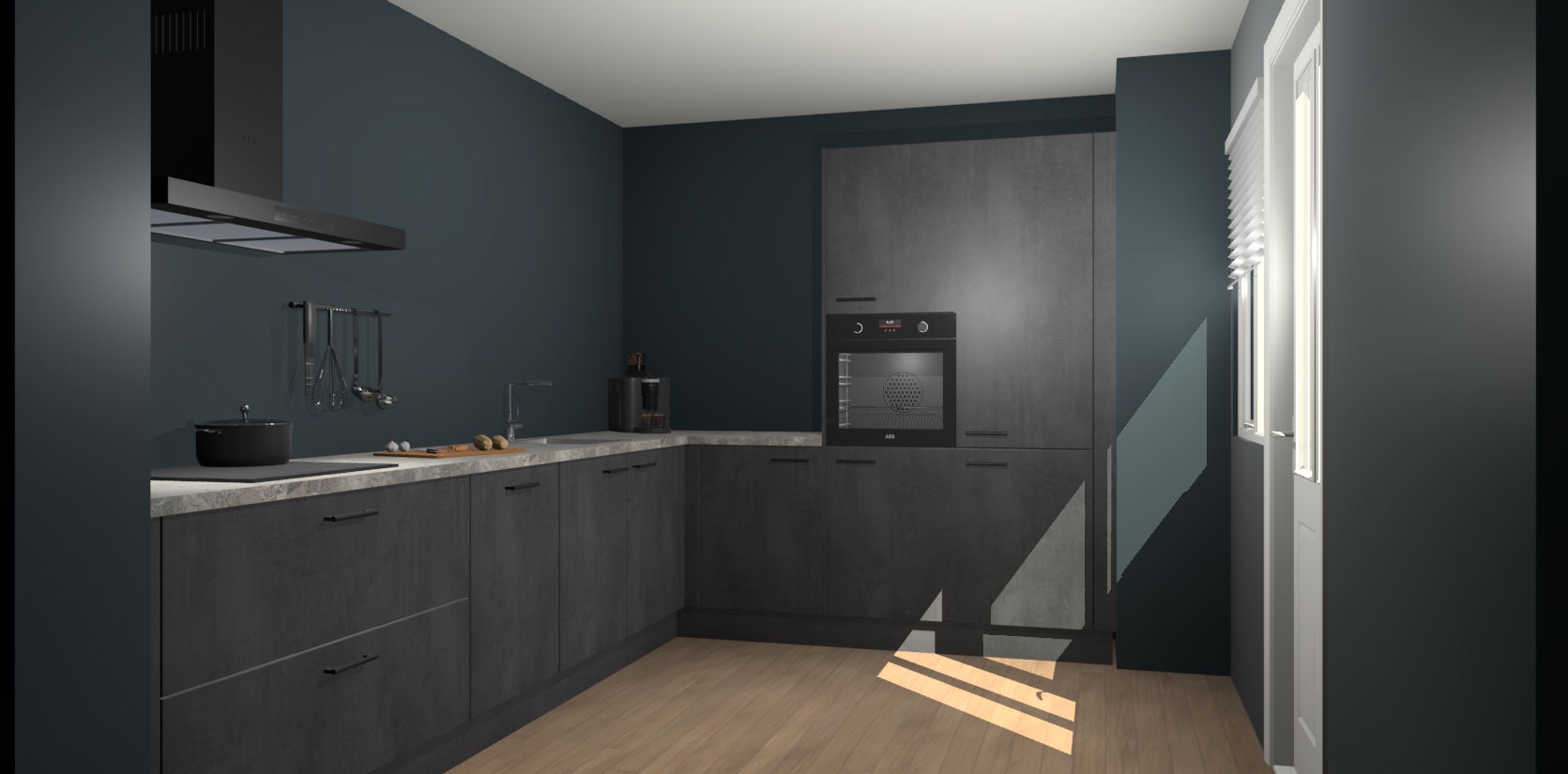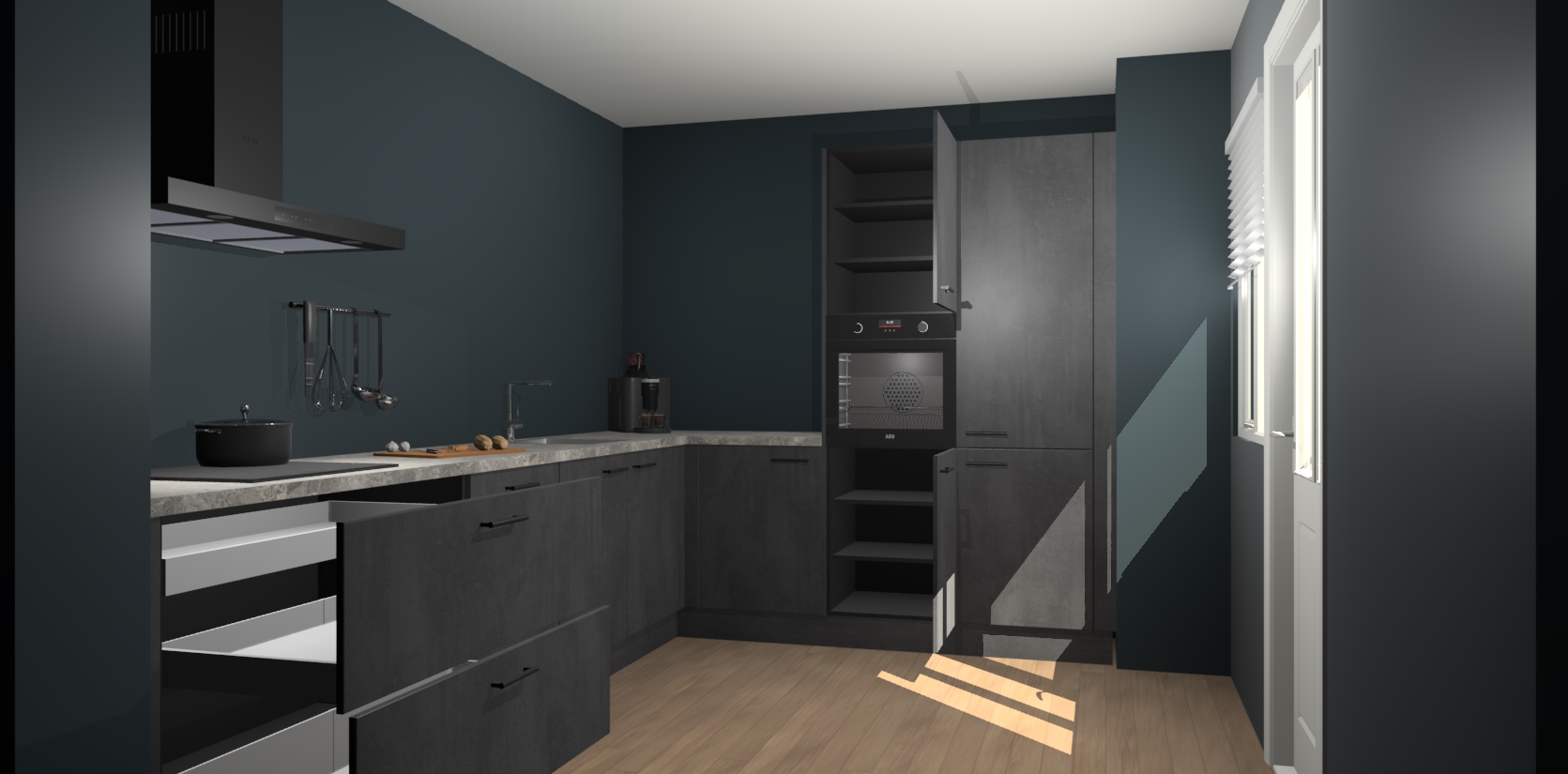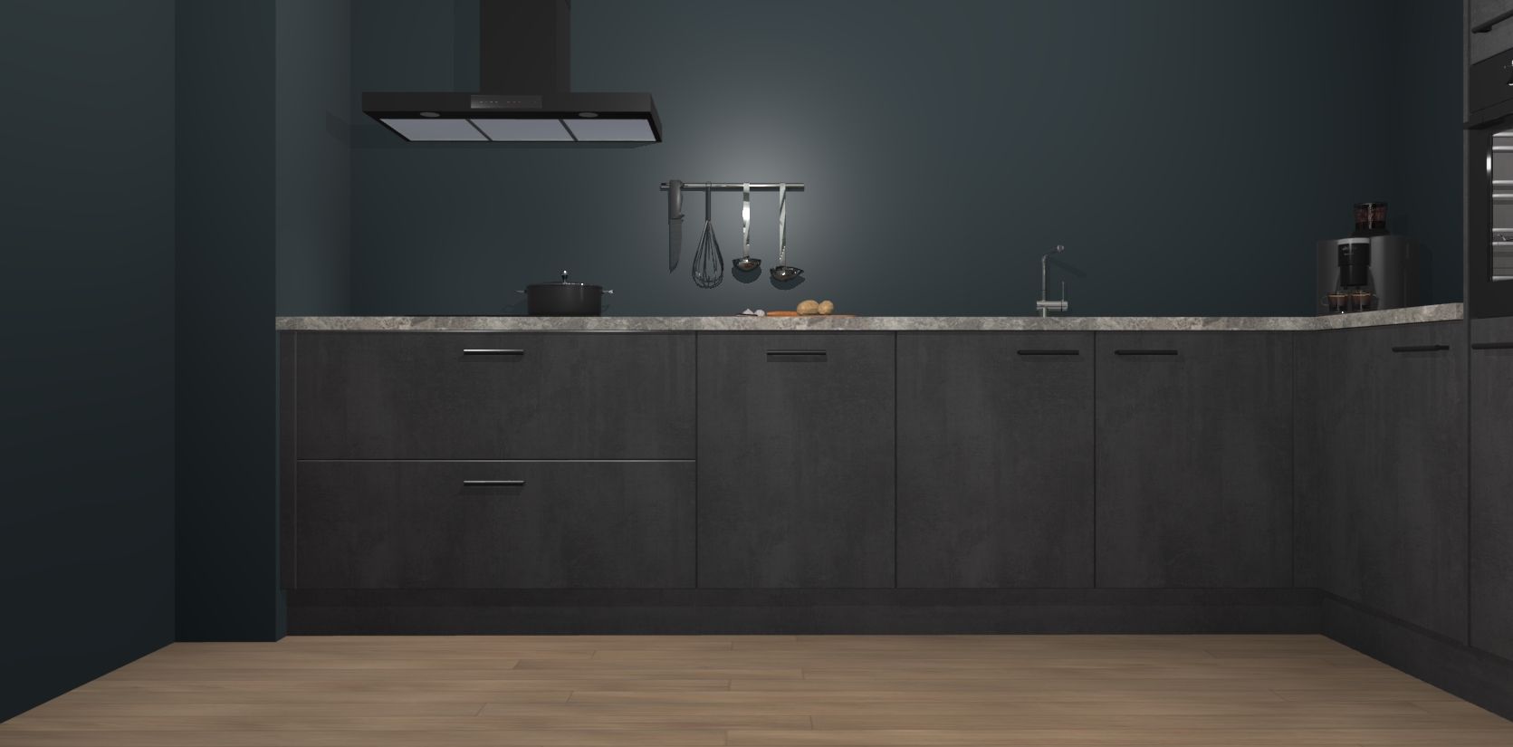 Welkom bij de Beton Zwarte keuken Portland. Deze prachtige keuken zal de komende jaren het middelpunt van de belangstelling in uw huis zijn. Uitgerust met vijf inbouwapparaten komt u nooit kookgereedschap tekort. Bovendien geeft de warme houtlook elke ruimte een uitnodigende en tijdloze uitstraling.