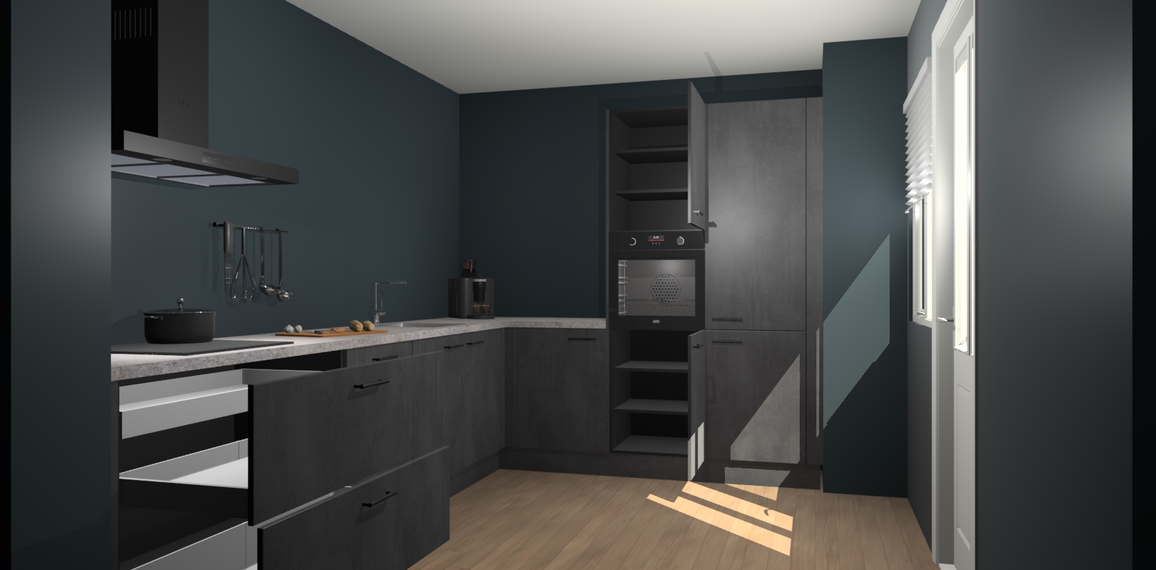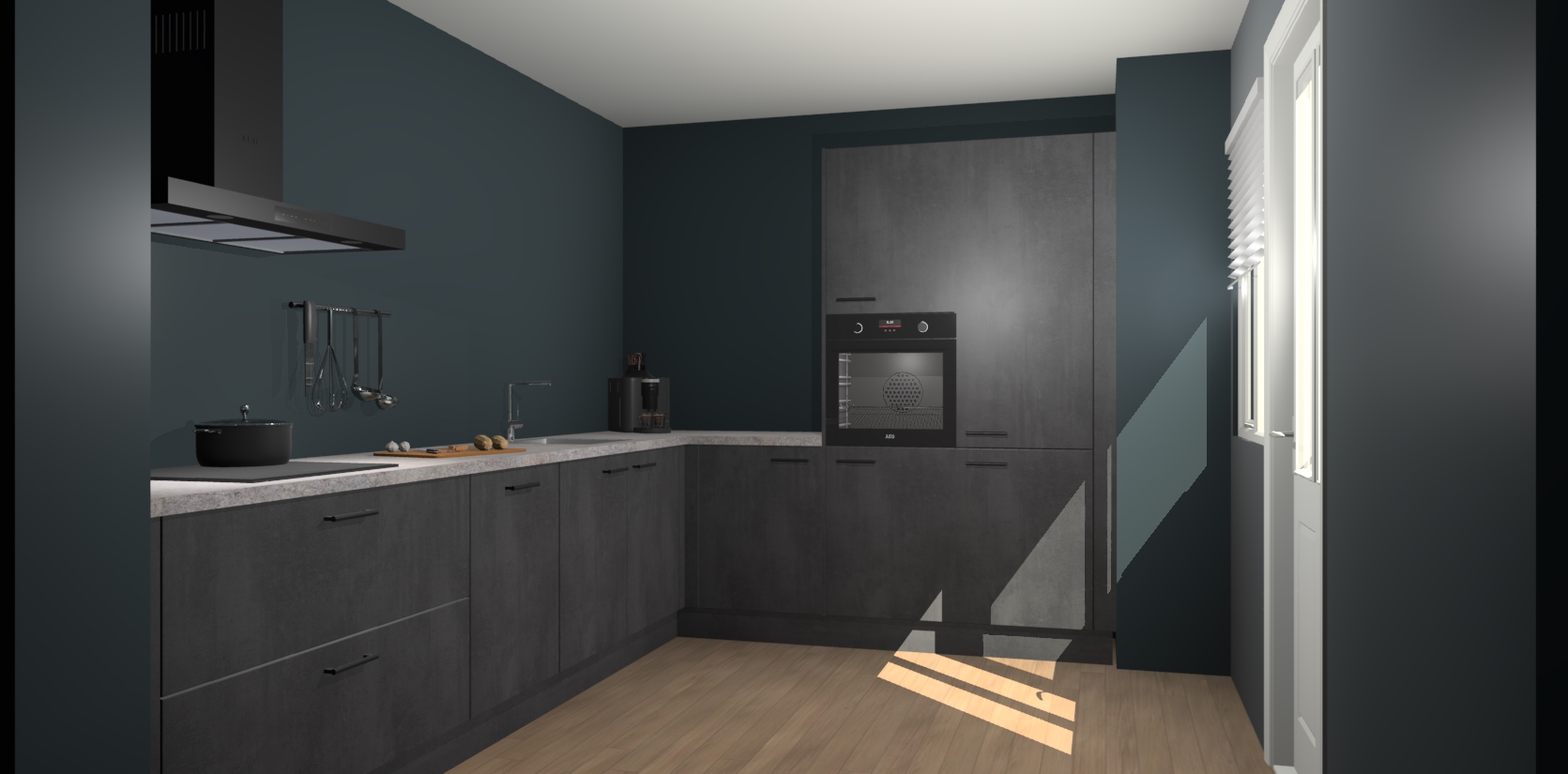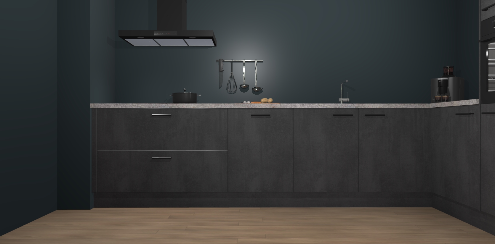 Welkom bij de Beton Zwarte keuken Portland. Deze prachtige keuken zal de komende jaren het middelpunt van de belangstelling in uw huis zijn. Uitgerust met vijf inbouwapparaten komt u nooit kookgereedschap tekort. Bovendien geeft de warme houtlook elke ruimte een uitnodigende en tijdloze uitstraling.
