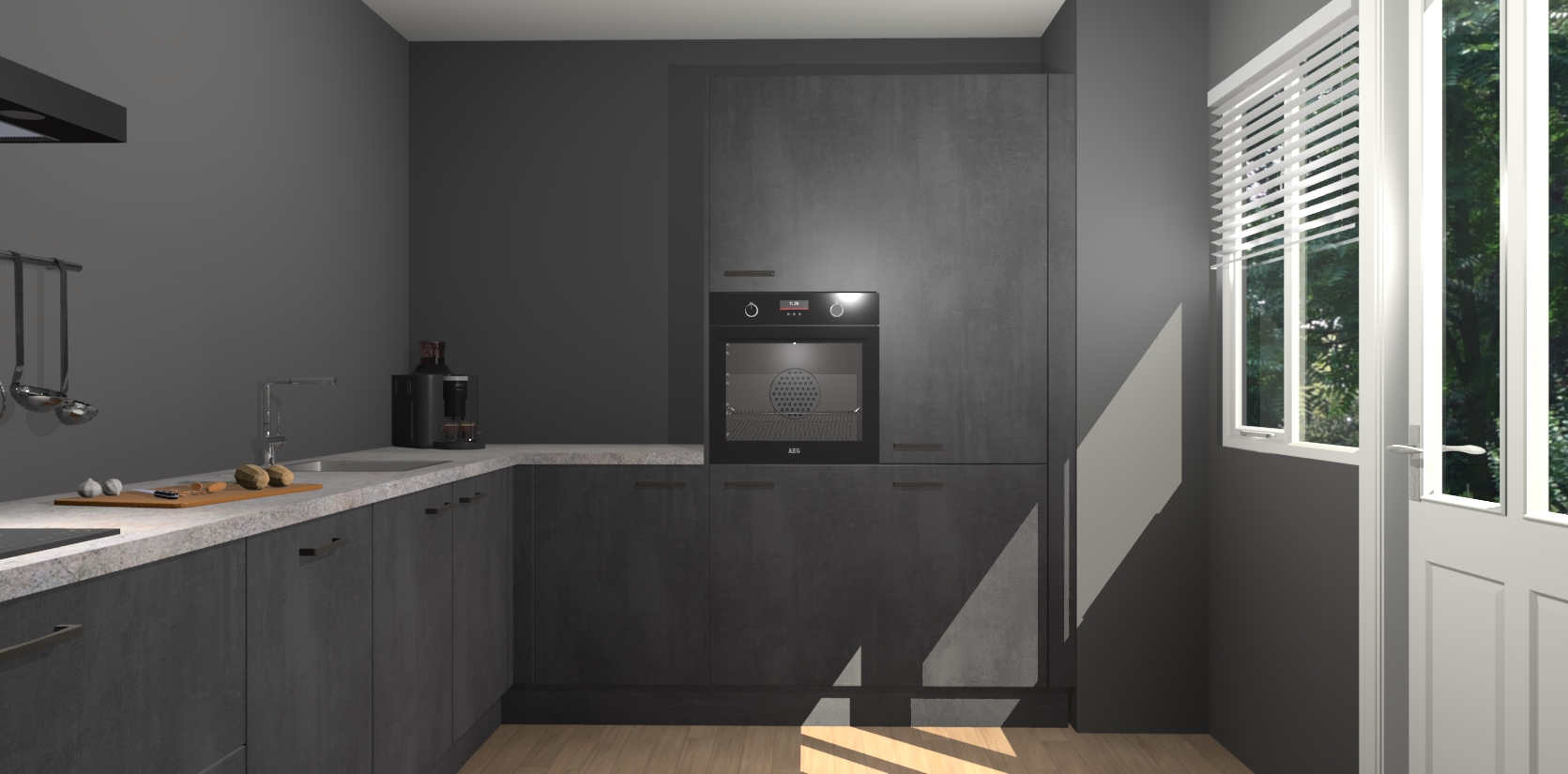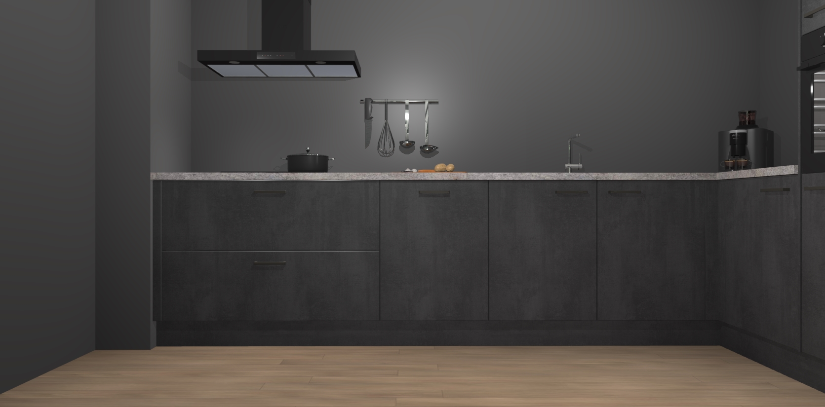 Welkom bij de Beton Zwarte keuken Portland. Deze prachtige keuken zal de komende jaren het middelpunt van de belangstelling in uw huis zijn. Uitgerust met vijf inbouwapparaten komt u nooit kookgereedschap tekort. Bovendien geeft de warme houtlook elke ruimte een uitnodigende en tijdloze uitstraling.