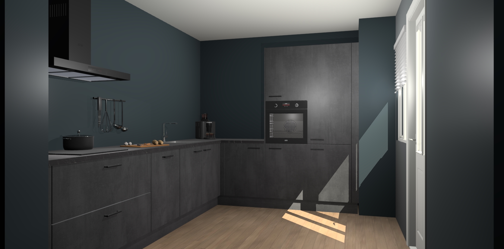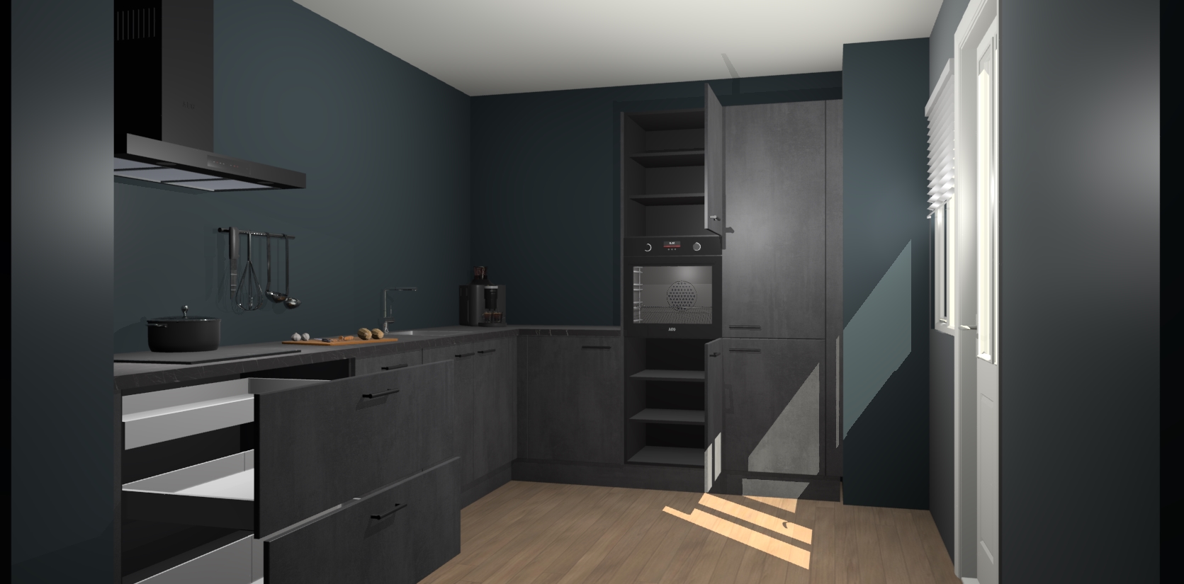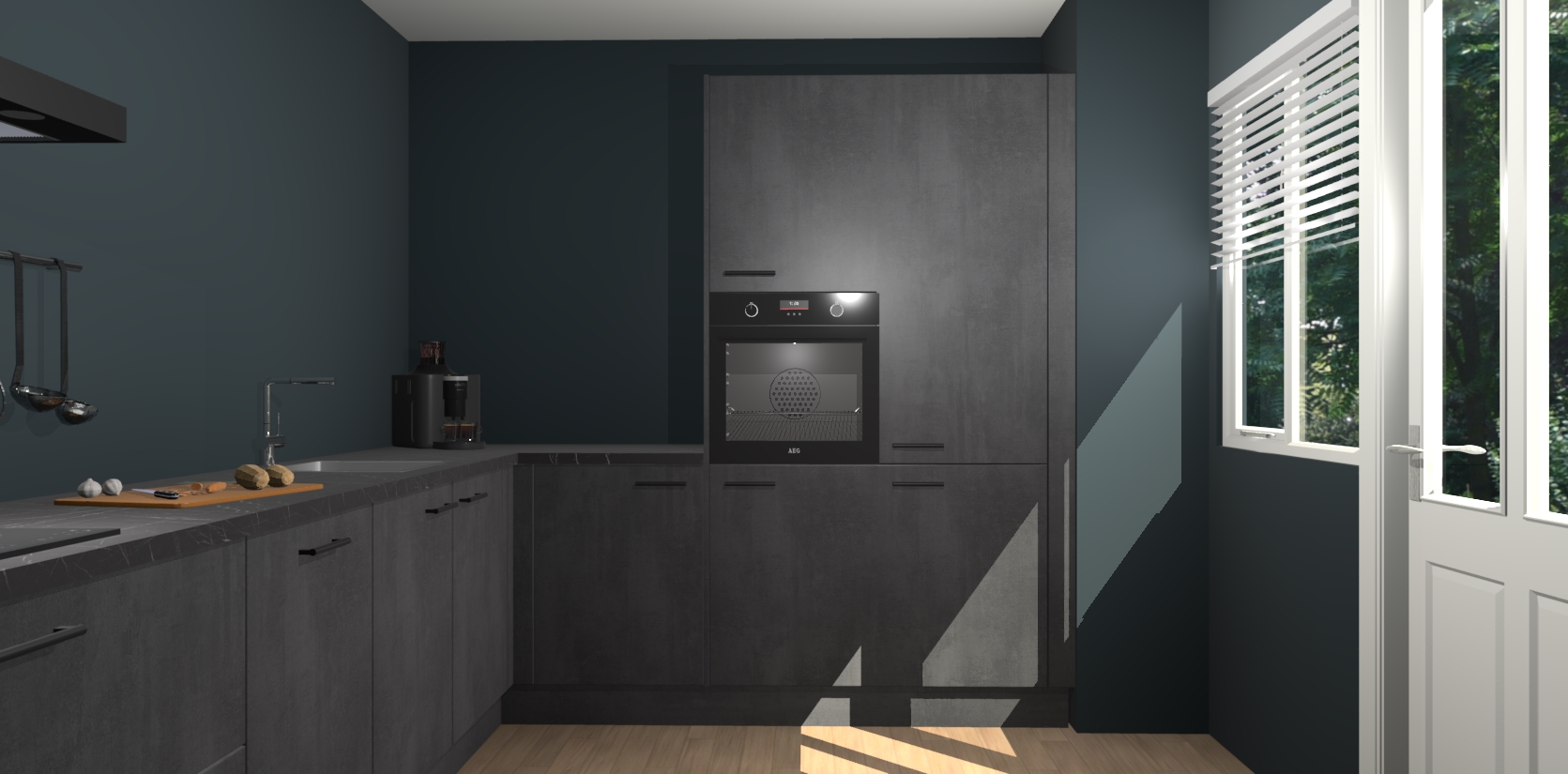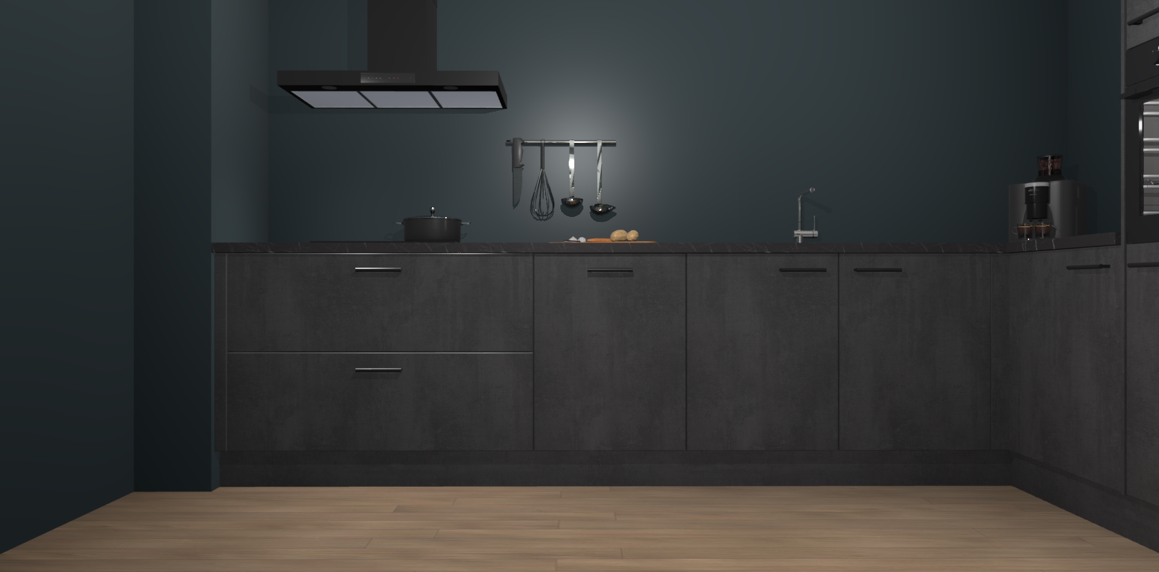 Welkom bij de Beton Zwarte keuken Portland. Deze prachtige keuken zal de komende jaren het middelpunt van de belangstelling in uw huis zijn. Uitgerust met vijf inbouwapparaten komt u nooit kookgereedschap tekort. Bovendien geeft de warme houtlook elke ruimte een uitnodigende en tijdloze uitstraling.
