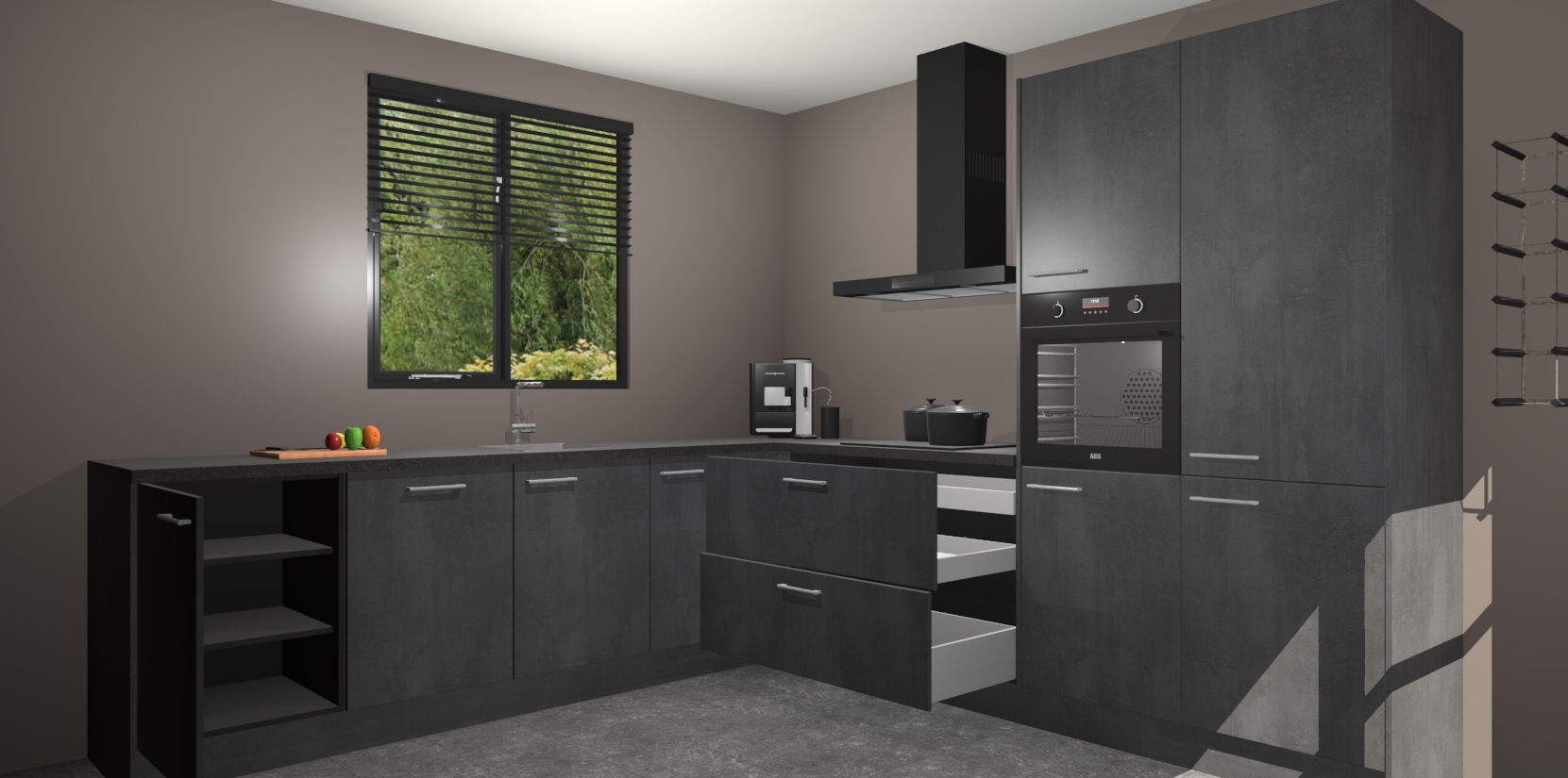 De Beton Zwarte keuken Porto heeft 5 ingebouwde apparaten - een oven, inductiekookplaat, afzuigkap, vaatwasser en koelkast - waarmee u in een handomdraai heerlijke gerechten bereidt. Soft-close deuren zorgen voor nog meer functionaliteit en gemak. En dit alles voor een onverslaanbaar vaste prijs. En als u nu bestelt, duurt de levering maar 7 weken! Wat nog ongelooflijker is, is dat onze kasten voor gemonteerd worden geleverd.