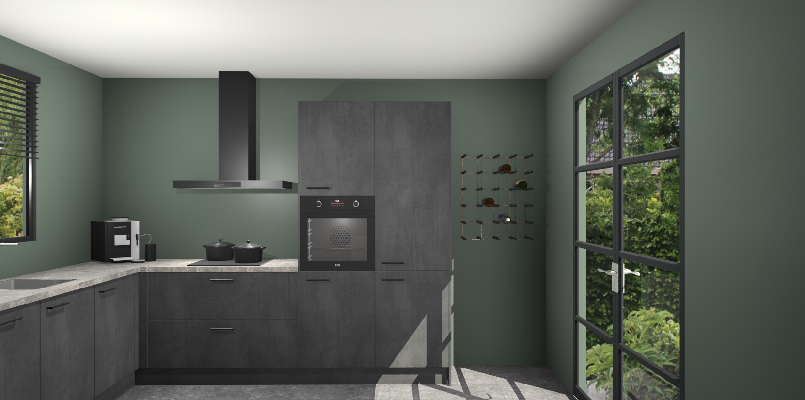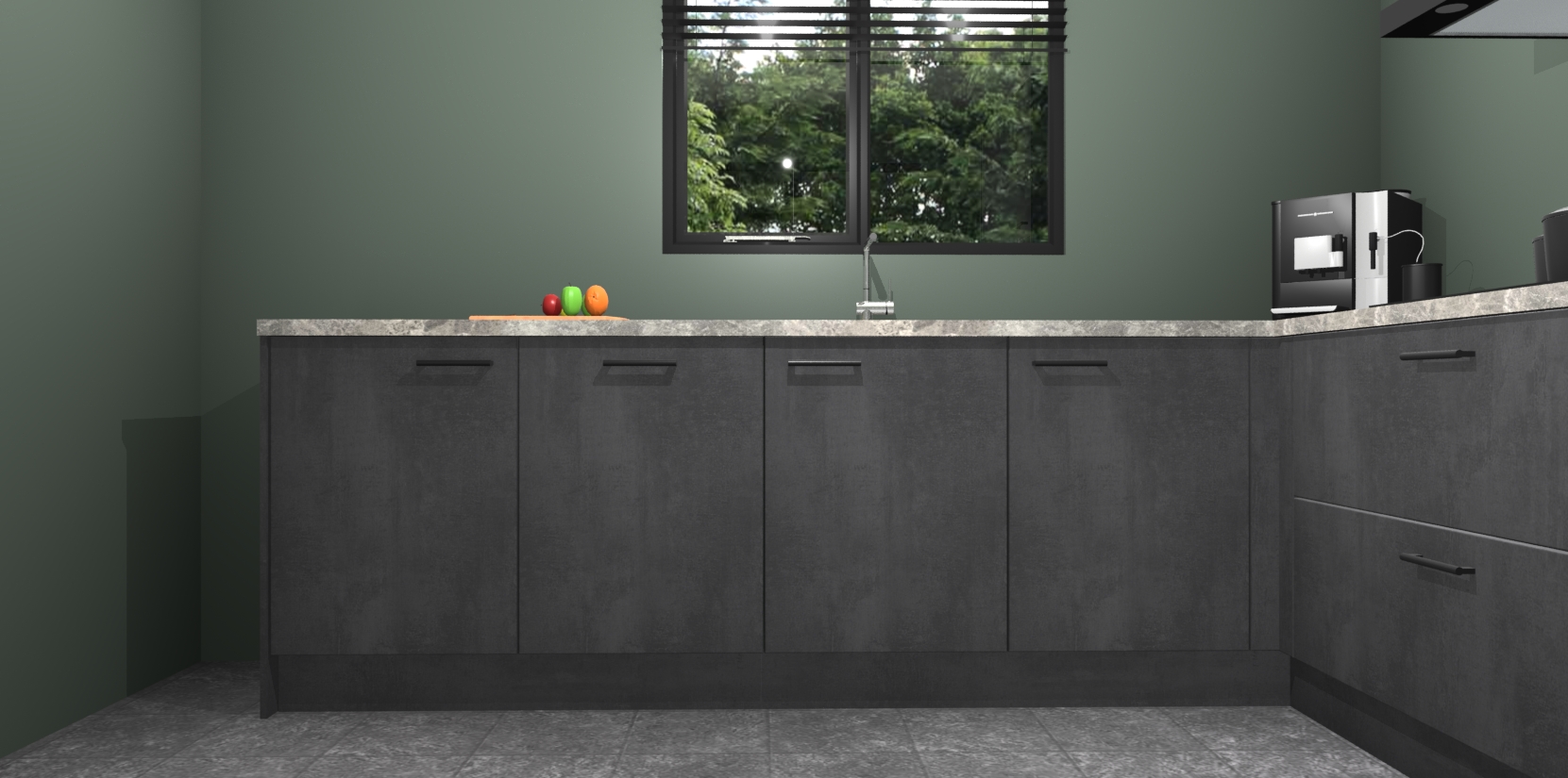 De Beton Zwarte keuken Porto heeft 5 ingebouwde apparaten - een oven, inductiekookplaat, afzuigkap, vaatwasser en koelkast - waarmee u in een handomdraai heerlijke gerechten bereidt. Soft-close deuren zorgen voor nog meer functionaliteit en gemak. En dit alles voor een onverslaanbaar vaste prijs. En als u nu bestelt, duurt de levering maar 7 weken! Wat nog ongelooflijker is, is dat onze kasten voor gemonteerd worden geleverd.